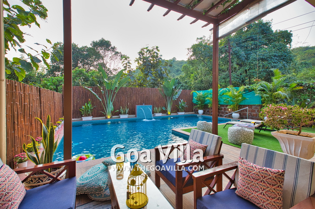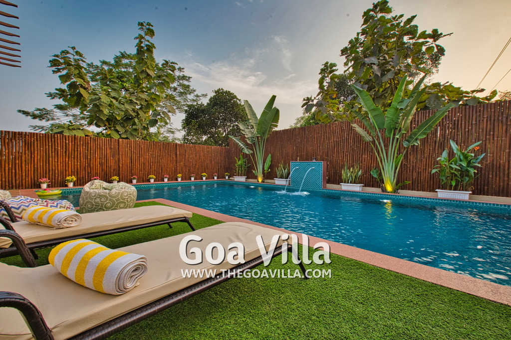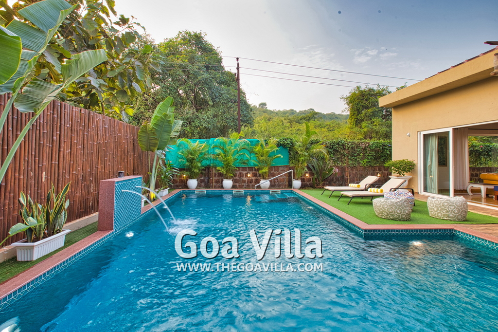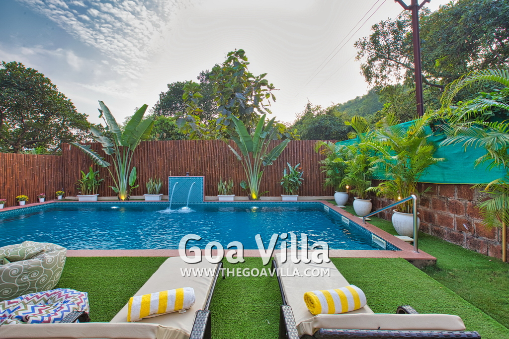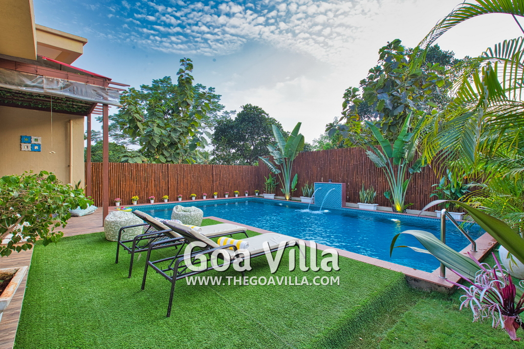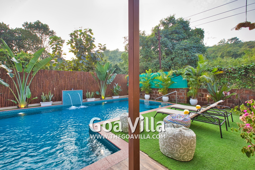 Swimming Pool – Morjim Villa has a large swimming pool just outside the living room. The pool has a shallow end for the kids and a fountain. Surrounded by tall trees, a small hill rises just beyond the pool. A sun deck and loungers are placed all around. There is also a sitting area with a small table. This is one of the best areas in the house to hang out and relax.
