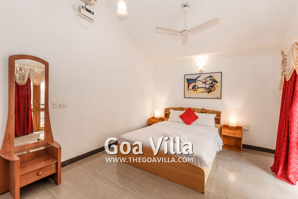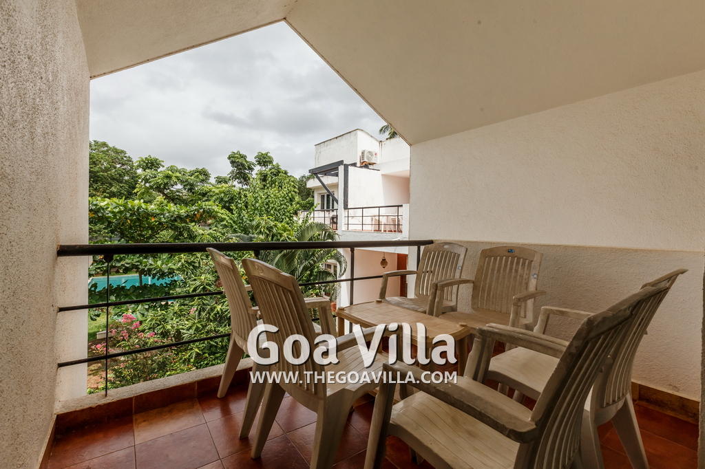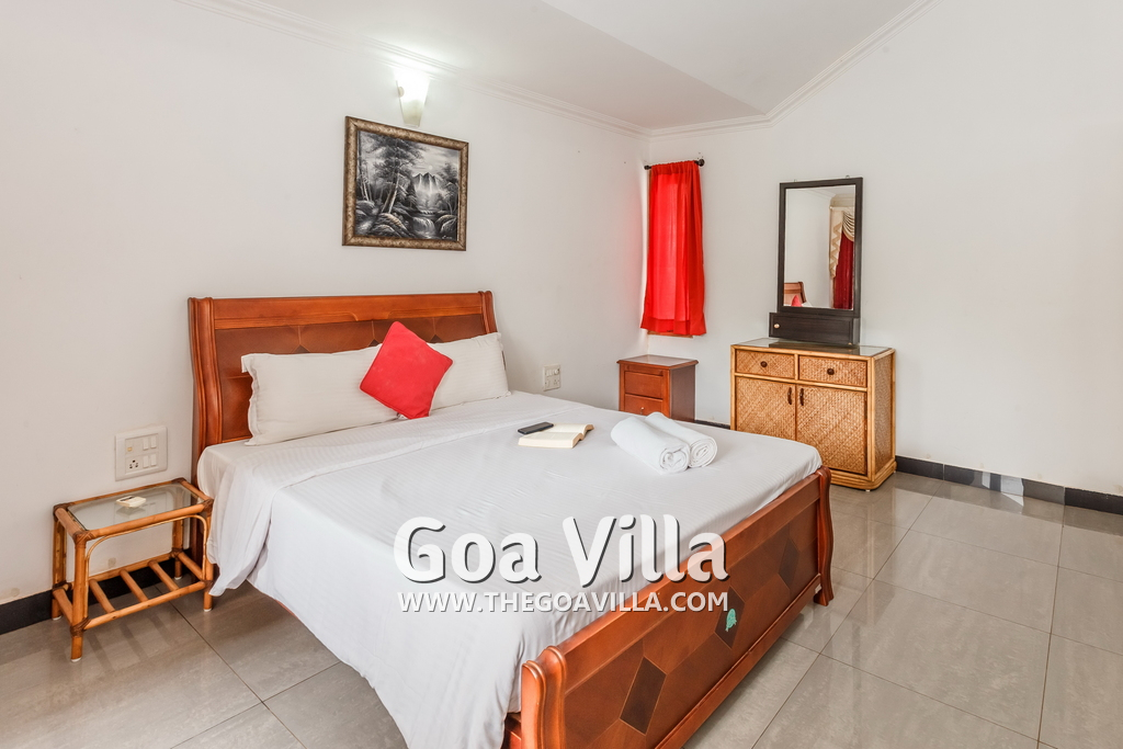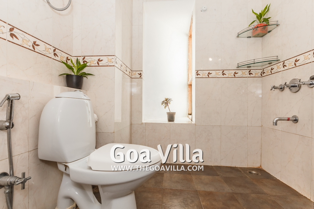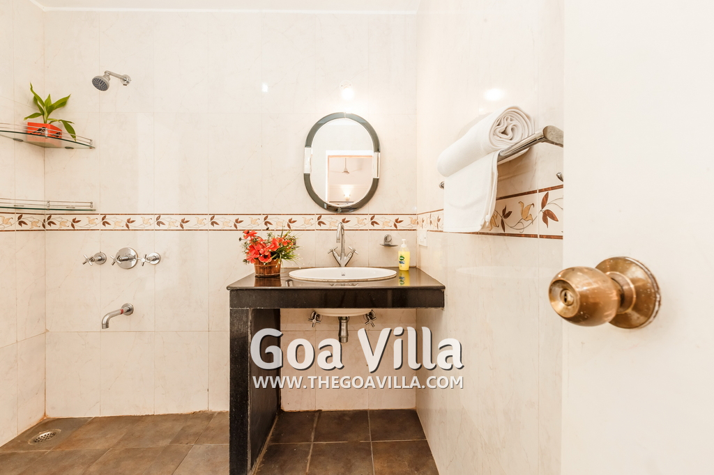 Bedrooms – Big sized bedrooms with modern furniture. Large beds with extra cushions, side table, lamp shade, paintings on the wall, wardrobe, mirror, and dressing table. Door opens to a big balcony. One balcony overlooks the swimming pool, while the other faces the Candolim-Calangute Road. The bedrooms are both en-suite and air conditioned. There are ceiling fans too. High ceiling keeps the room comfortable, allowing plenty of air circulation.