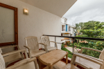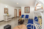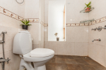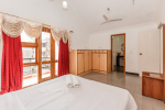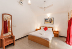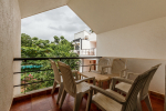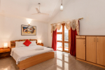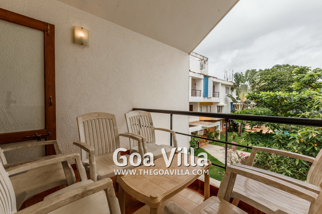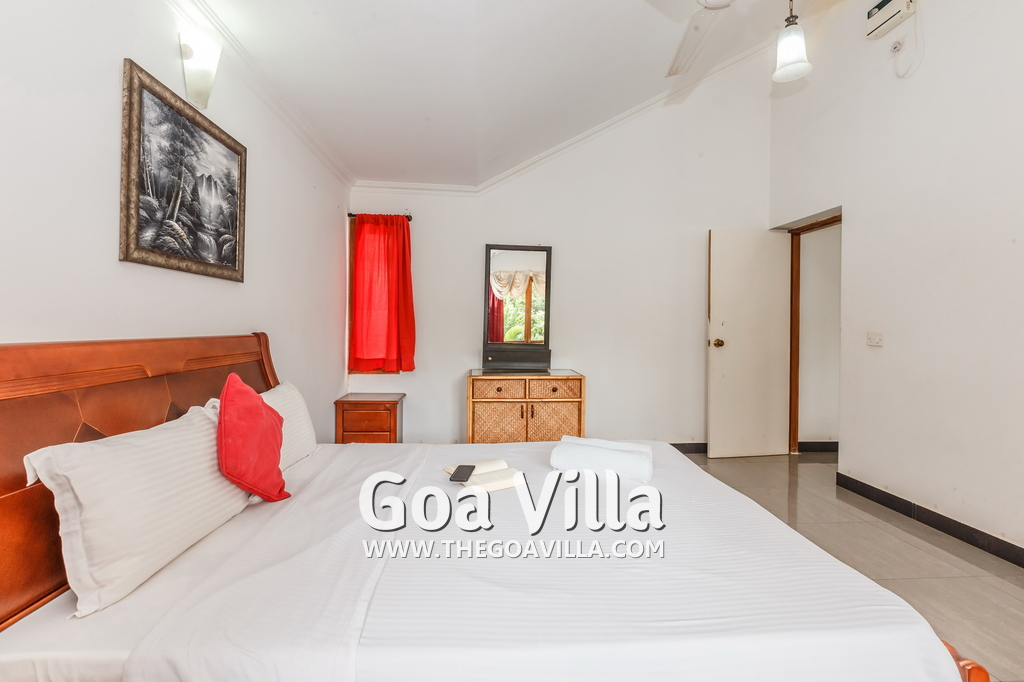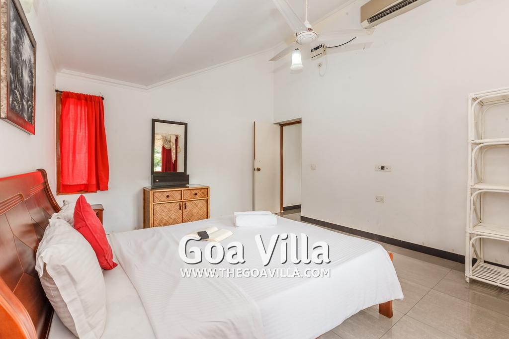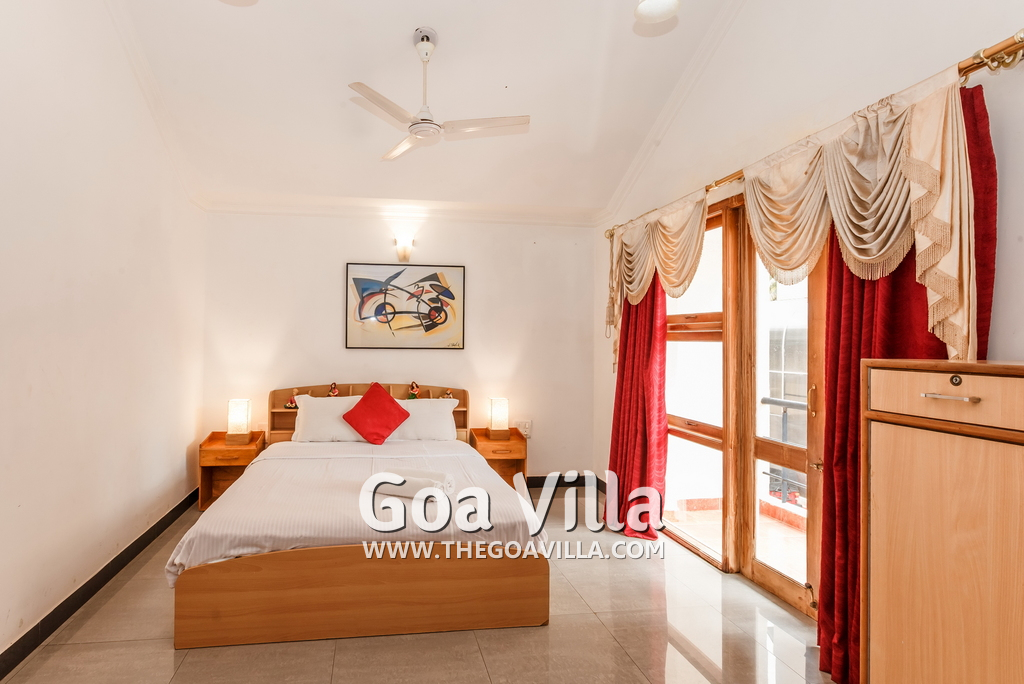 Bedrooms – Big sized bedrooms with modern furniture. Large beds with extra cushions, side table, lamp shade, paintings on the wall, wardrobe, mirror, and dressing table. Door opens to a big balcony. One balcony overlooks the swimming pool, while the other faces the Candolim-Calangute Road. The bedrooms are both en-suite and air conditioned. There are ceiling fans too. High ceiling keeps the room comfortable, allowing plenty of air circulation.
