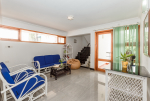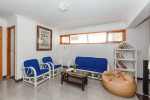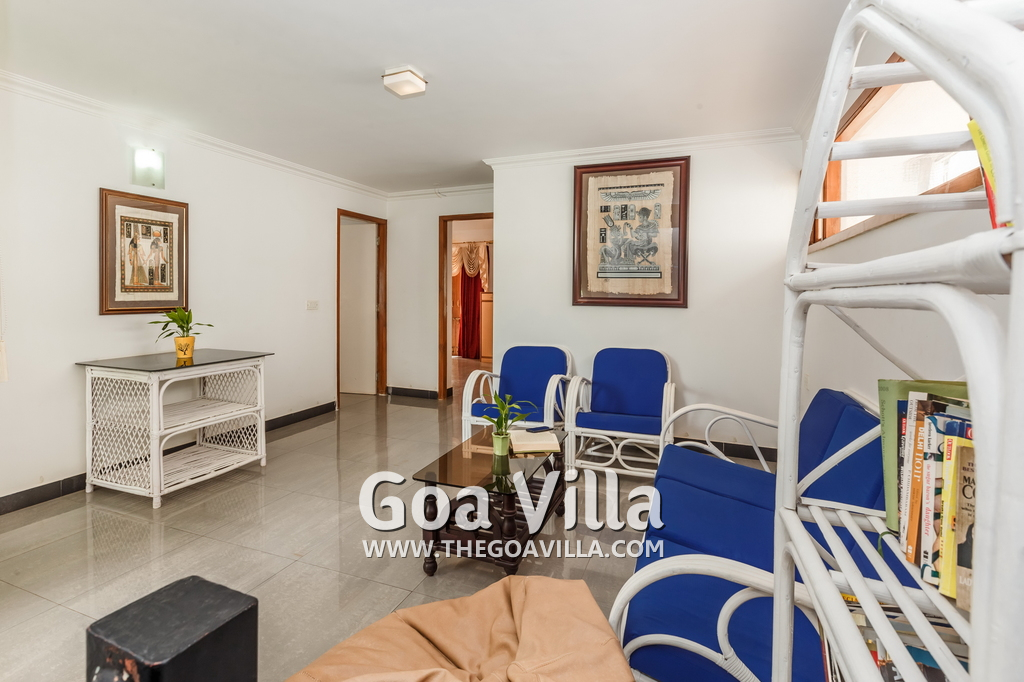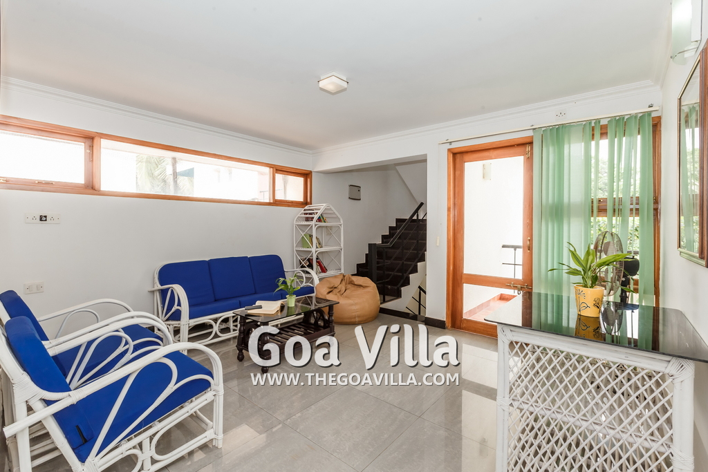 Living Room – Orion villa has a huge ground floor living area with a large comfortable sofa, glass top cane table, extra chairs, flat-screen wall mounted television, paintings, and flowers. There is also a small library. Staircase leads to the 1st floor where the bedrooms are located. The living room has big windows and a large door that leads to the lawn and outdoor swimming pool.
