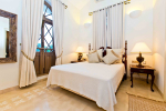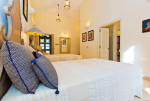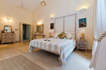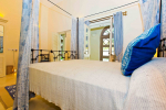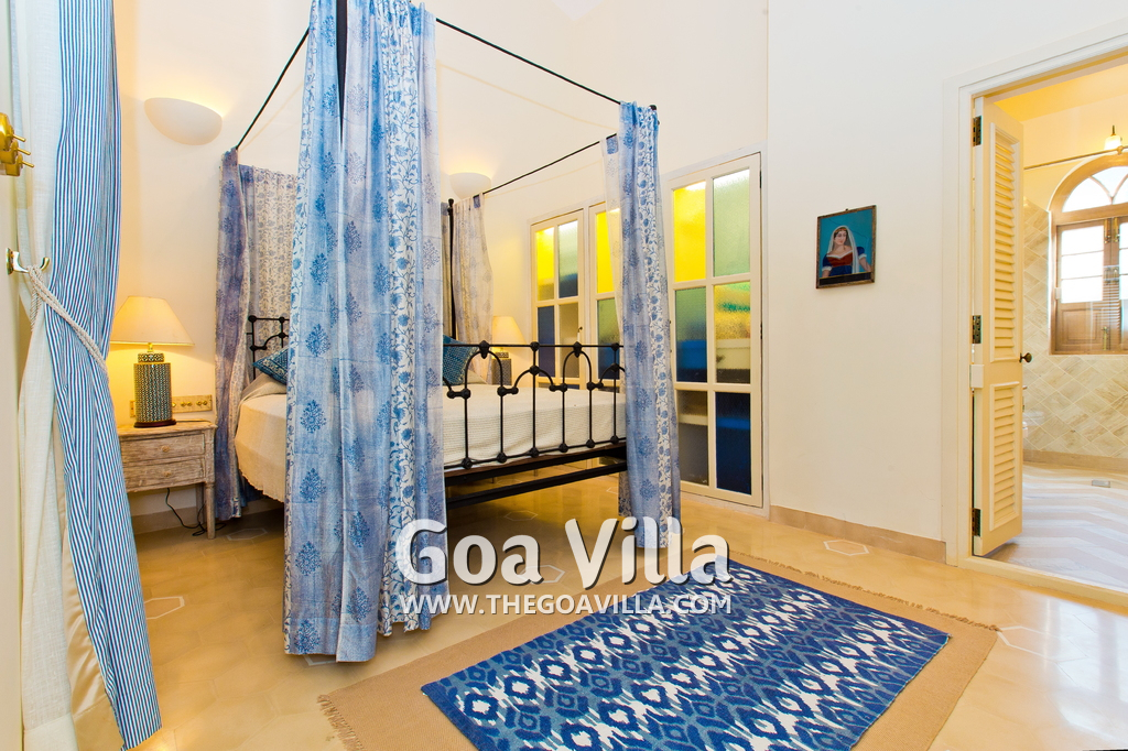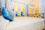 Master bedroom #3. Antique furniture, distressed white wooden flooring. Vibrant paintings and bright cushions. Mosaic walls and flooring.