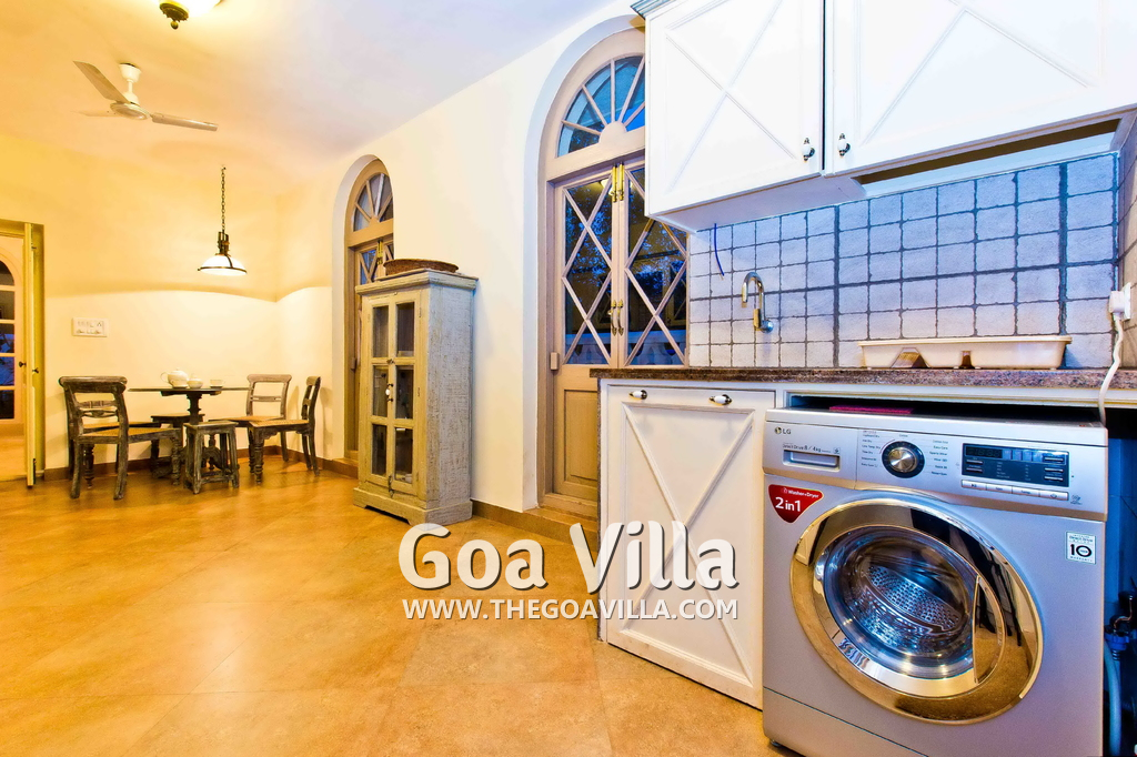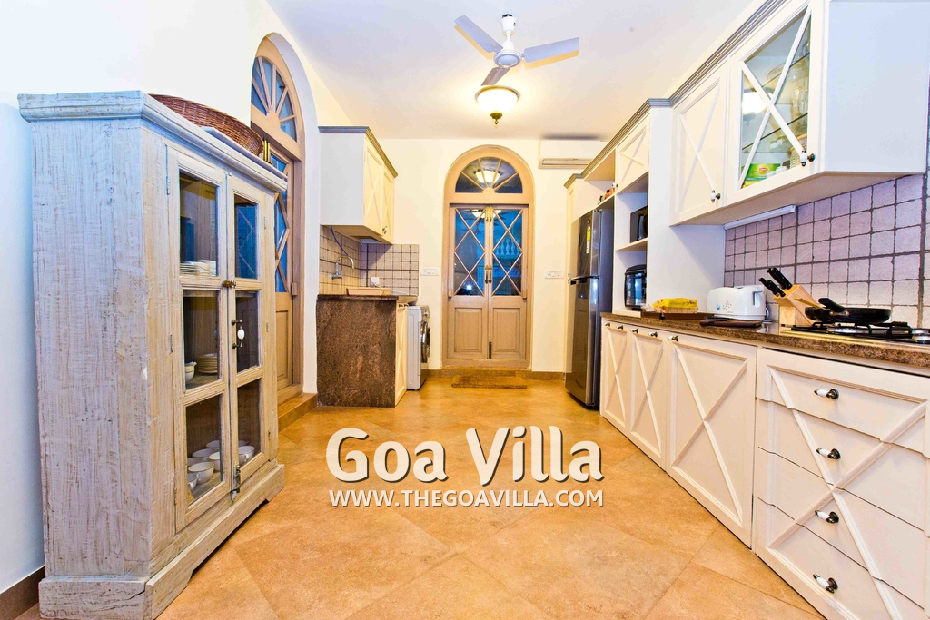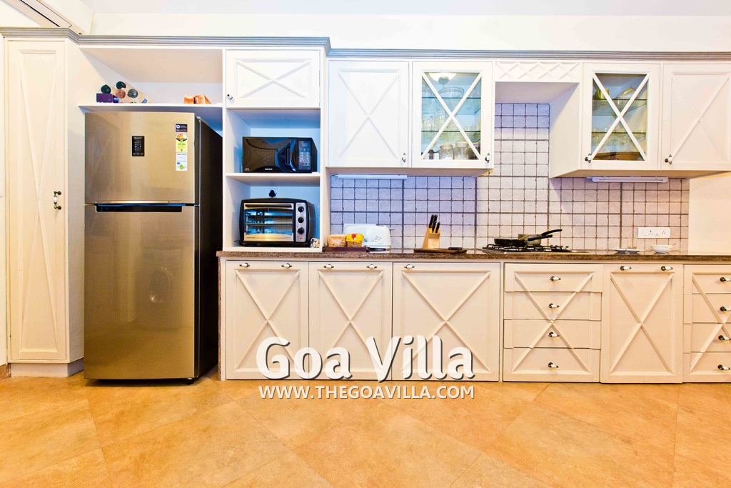The living room is the best place to laze around and spend time with your friends/family once you have returned from the beach or are done with the swimming pool. It is classy extremely sophisticated and luxurious with antique furniture, sofa, soft cushions, a rug and center table, and beautiful lighting. Triple-height sloping roof! There is a fully-equipped kitchen with a separate sitting area.