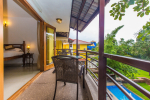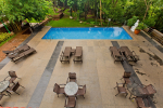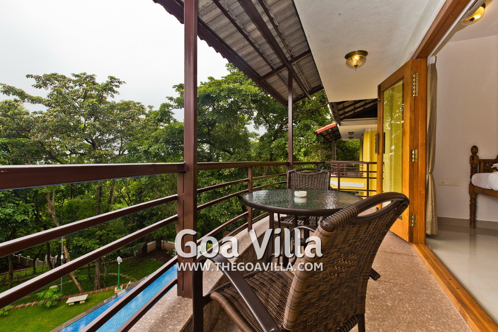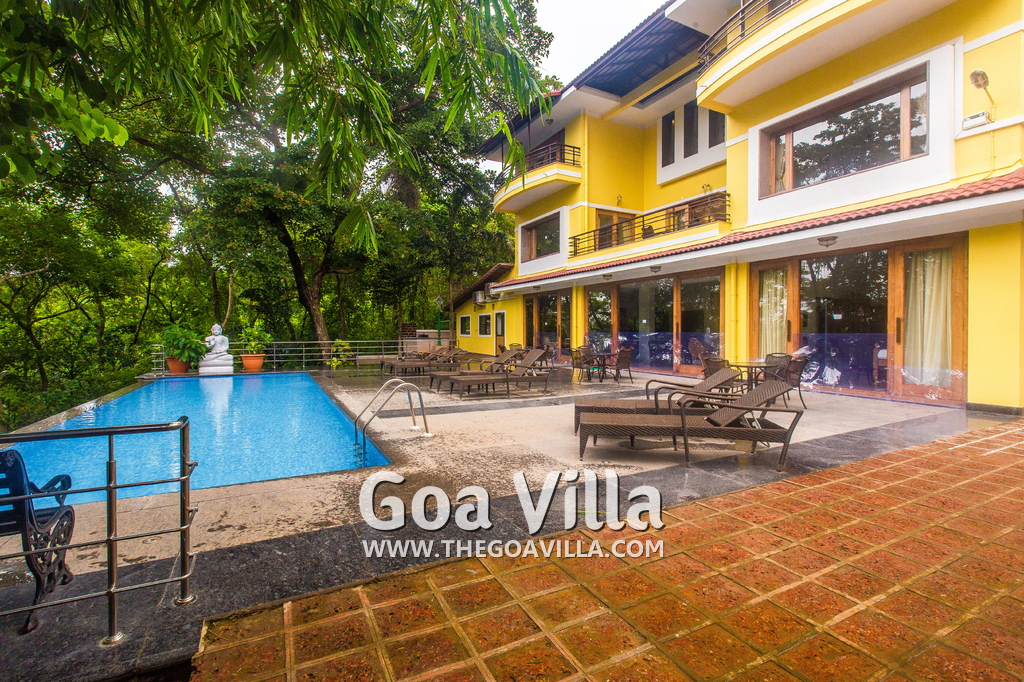 Swimming Pool – Stay in this property in Goa and enjoy its private infinity swimming pool. It sits at the edge of a beautiful forest and 2.5 acre landscaped garden. Steps lead down to the garden from the pool. You will have many tall trees all around. There is a large Buddha statue at one end. Many loungers are placed on the pool deck.