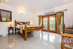Living Room – The ground floor open-plan living and dining area is huge. It overlooks the infinity pool of Sati Villa. One entire wall is made of glass, ceiling to floor. Open the sliding door and you are at the pool deck. There are several air-conditioners to keep this space cool. The living space also has antique furniture. Paintings and sculptures decorate the space. There is an outdoor sitting area on the first floor too overlooking the infinity swimming pool of this villa for rent.