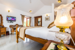 Bedrooms – The 6 bedrooms are all en-suite and air-conditioned. Two of them are in the ground floor while the other four are in the upper level. They have double or twin beds, side tables, beautiful lamp shades, wardrobes, and satellite televisions. Antique hand-crafted wooden furniture provides timeless elegance. The ground floor bedrooms open to the pool deck. Upper floor bedrooms have attached balconies with sitting areas.