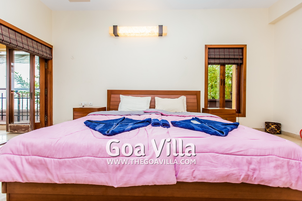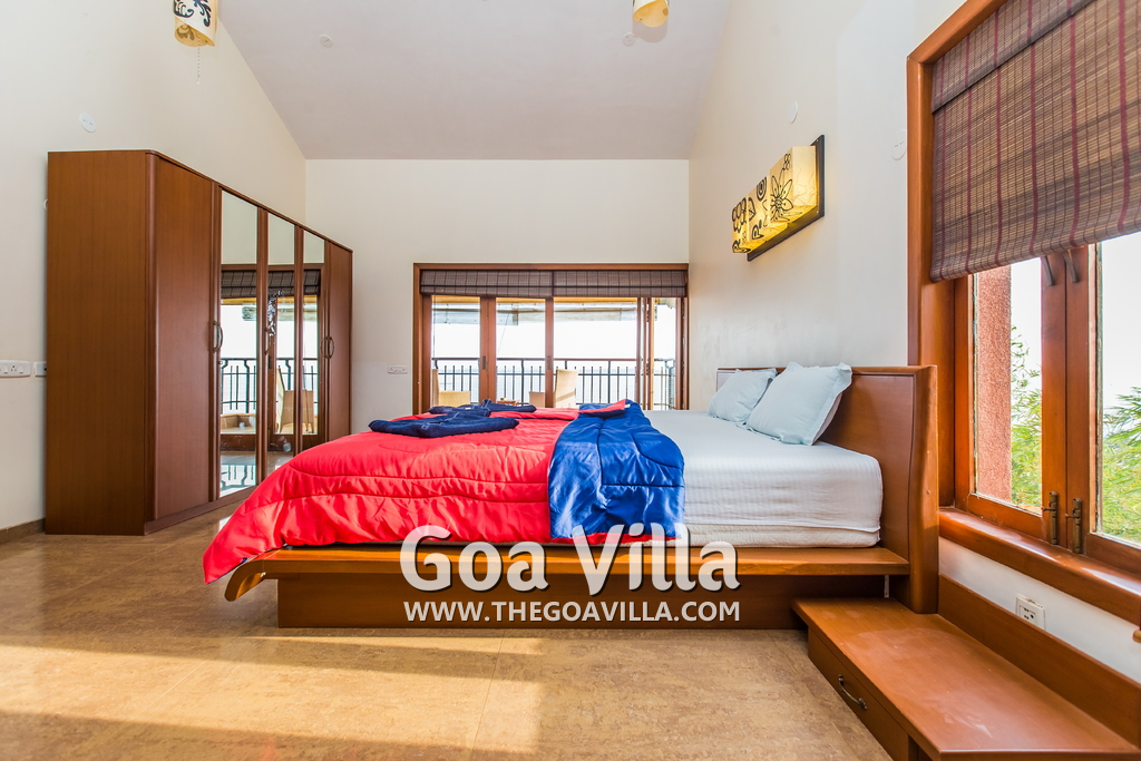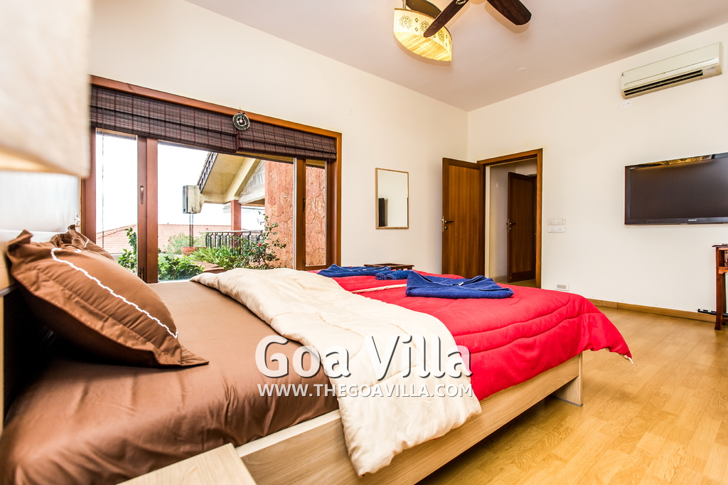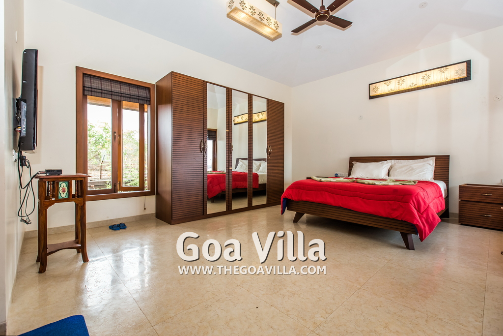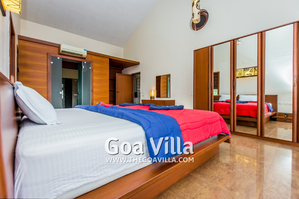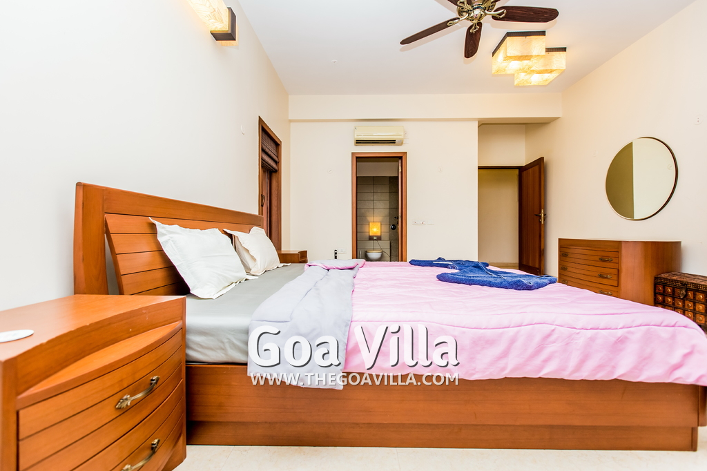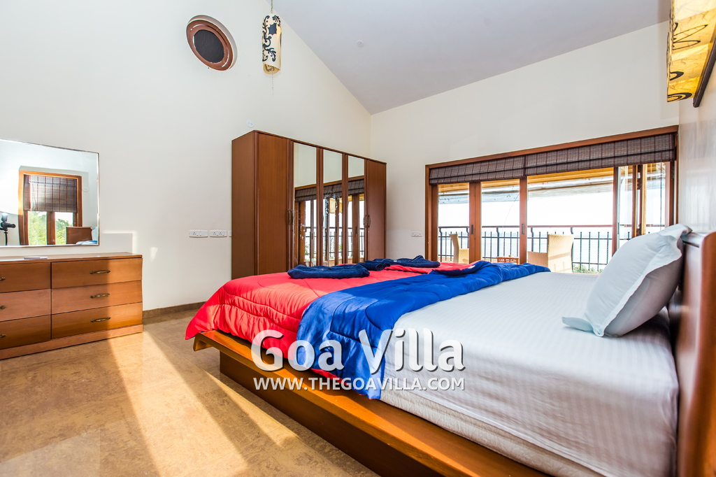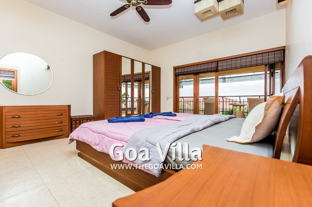 - Every bedroom of this villa in Goa has an attached bathroom, air conditioning system and large double bed with thick and comfortable mattress/ bedding. First bedroom is on the ground floor and can be accessed from the living room. Remaining three bedrooms are on the first floor and can be accessed by stairs.Two of the bedrooms open to the attached balconies which offer magical views of the gigantic Arabian Sea. The rooms are well furnished with wardrobe, chairs, TV and dressers.