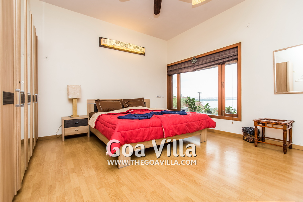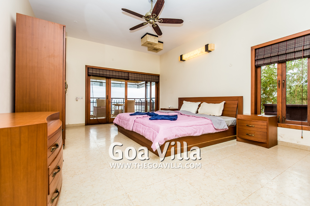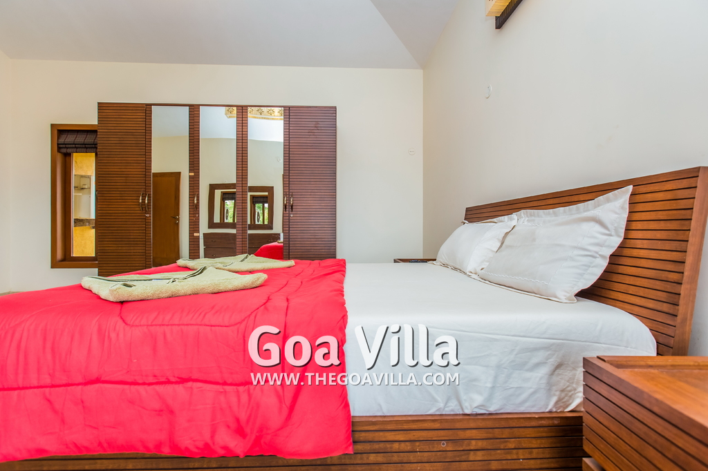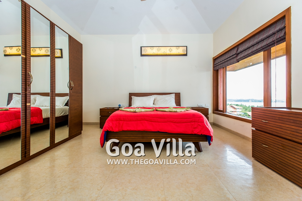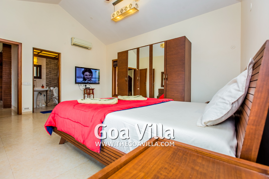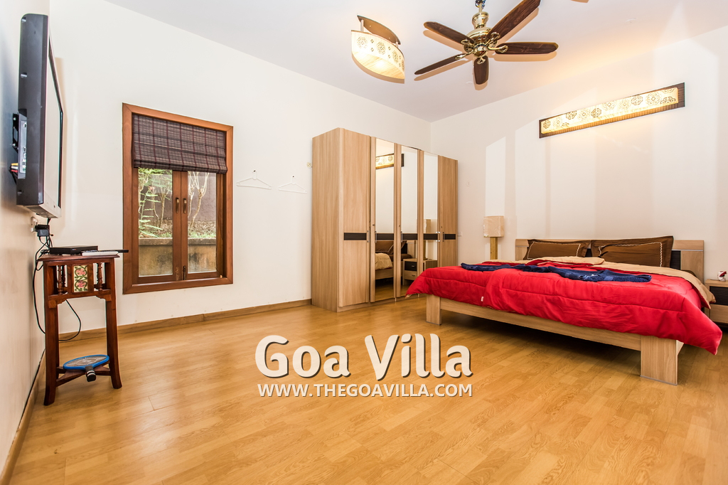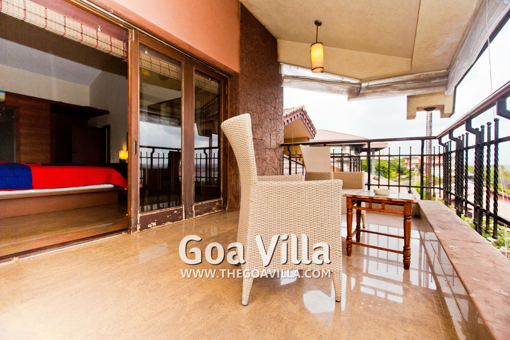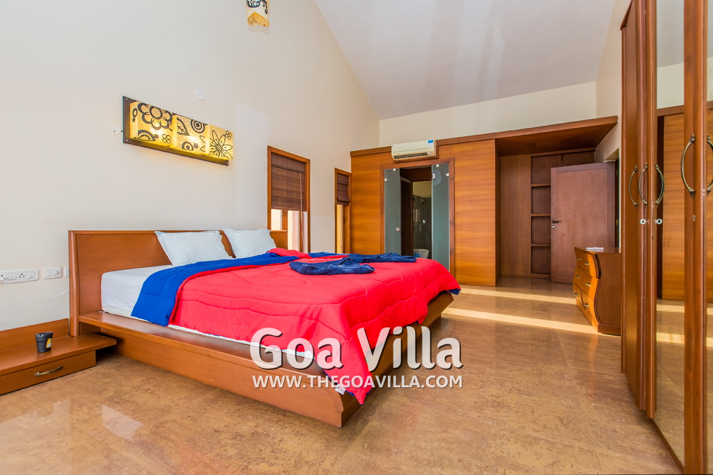 - Every bedroom of this villa in Goa has an attached bathroom, air conditioning system and large double bed with thick and comfortable mattress/ bedding. First bedroom is on the ground floor and can be accessed from the living room. Remaining three bedrooms are on the first floor and can be accessed by stairs.Two of the bedrooms open to the attached balconies which offer magical views of the gigantic Arabian Sea. The rooms are well furnished with wardrobe, chairs, TV and dressers.