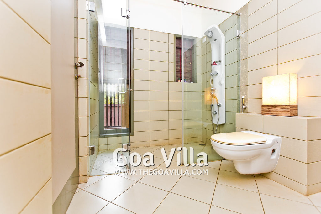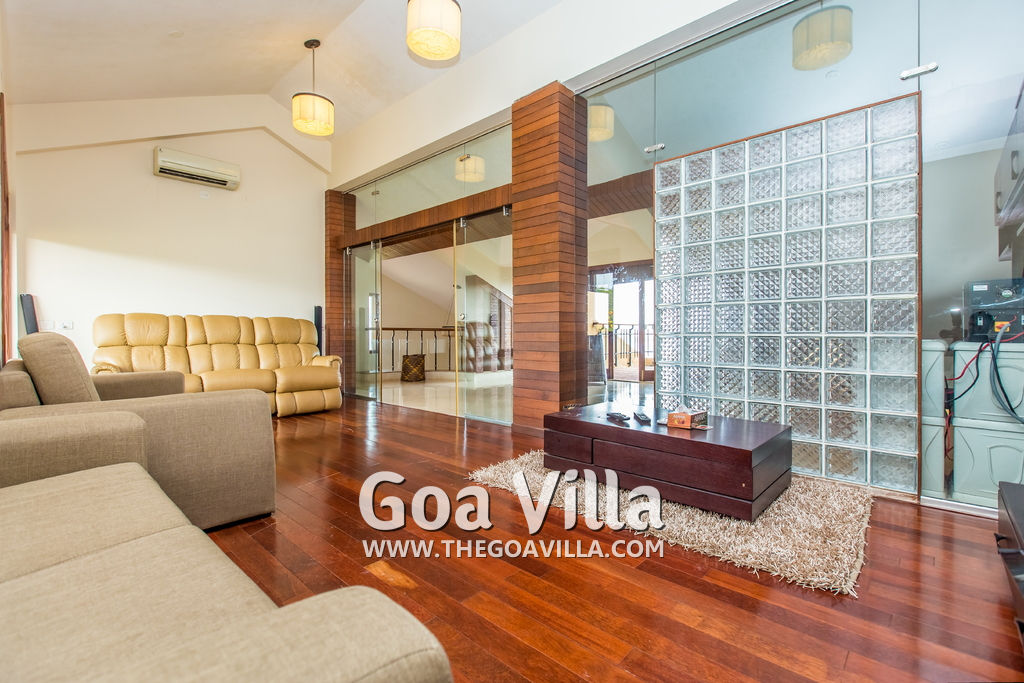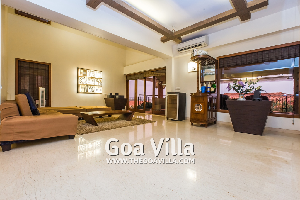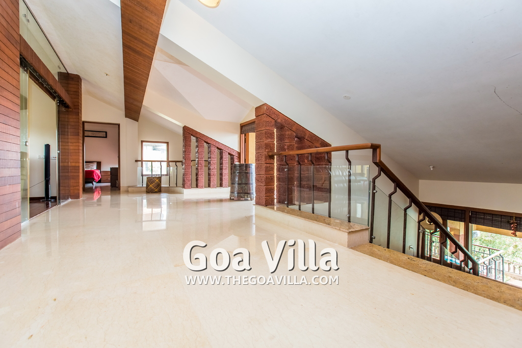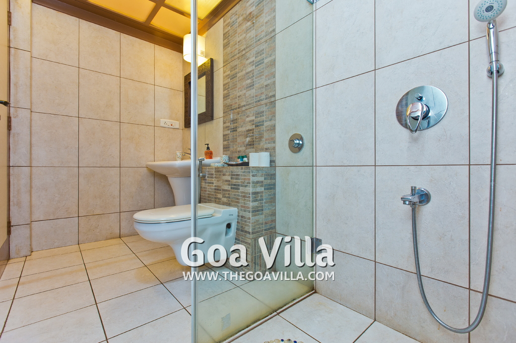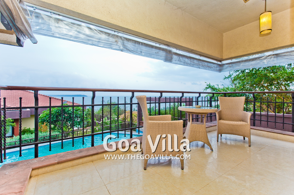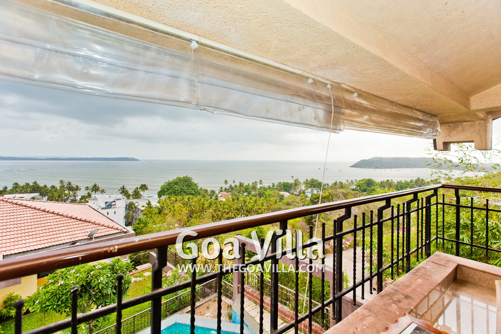 - Every bedroom of this villa in Goa has an attached bathroom, air conditioning system and large double bed with thick and comfortable mattress/ bedding. First bedroom is on the ground floor and can be accessed from the living room. Remaining three bedrooms are on the first floor and can be accessed by stairs.Two of the bedrooms open to the attached balconies which offer magical views of the gigantic Arabian Sea. The rooms are well furnished with wardrobe, chairs, TV and dressers.