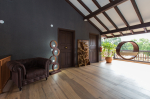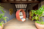 Living Area – 1st floor verandah overlooking open grounds, tall trees, and the infinity swimming pool. Comfortable sitting provided with extra cushions.