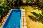 Swimming Pool – Small private swimming pool with a lawn beside it. Guests can relax or have a barbeque here. There are tall trees all around.