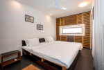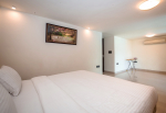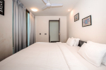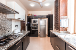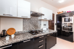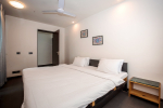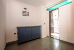 Kitchen, Dining – Dining is adjacent to the living area. There is a marble-top table with seating for 8 people. The kitchen is fully-equipped. It has a refrigerator, gas station, toaster, microwave, chimney, water purifier, and washing machine. There are separate cooking utensils for vegetarians.