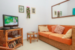 - The living room has a TV with satellite channels.