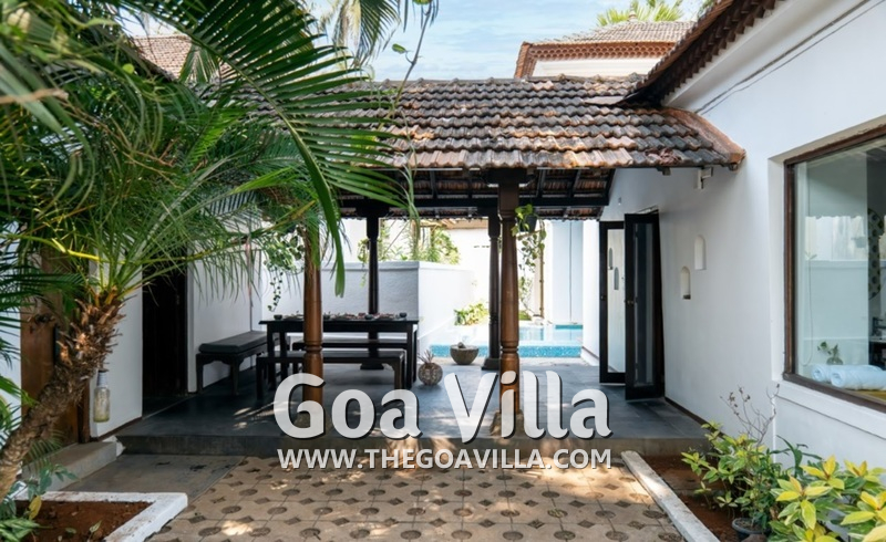 This luxury villa in North Goa is an ideal escape from the tourist crowds of Goa. Sangolda is serene and peaceful and close to the Mumbai-Goa highway, so you can reach the villa easily if you are driving from the city. Calangute is the closest beach. It is only 6.5 kilometers away. Candolim is 8 kilometers away. You can reach Anjuna in about 20 minutes.