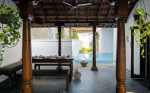 Dining, Kitchen – The dining area of this luxury villa for rent is outside, under an open pavilion. It has a farm-style table and three benches, which will seat all the eight guests. The kitchen has many appliances that you can use to cook the meals.