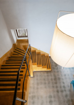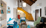 Living Room – The living room of Villa Archangela is cozy and inviting. You will immediately feel its welcoming vibe when you enter. It is a beautiful and vibrant room that is decorated with many colors. The traditional tall wooden beamed ceiling allows plenty of space and provides natural ventilation. The room is also air-conditioned like the bedrooms. It has leather chairs, a sofa, and a library. The staircase leads to the upper floor master suite.