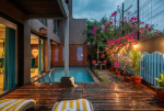 Swimming Pool – The private pool is certainly a highlight of this villa for rent in Anjuna. It surrounds the house from two sides and looks perfectly inviting for a swim. There is a wooden deck on one side with two loungers where you can relax after a swim. On the other side, there is a small garden with an outdoor lounging space.