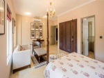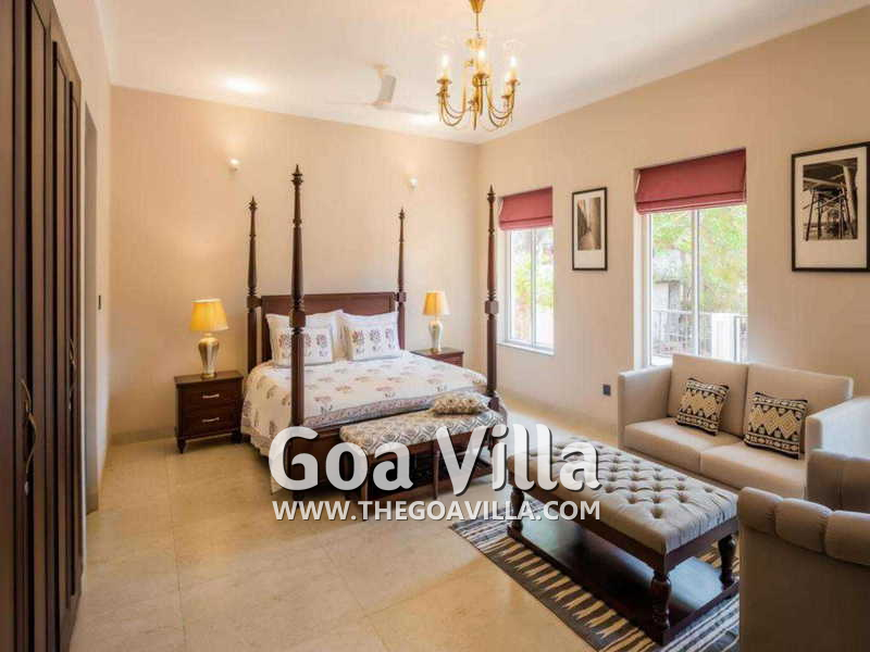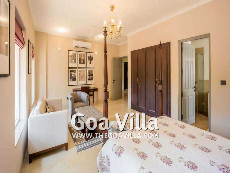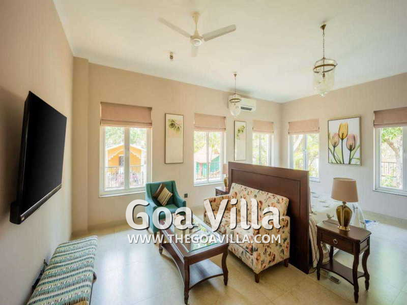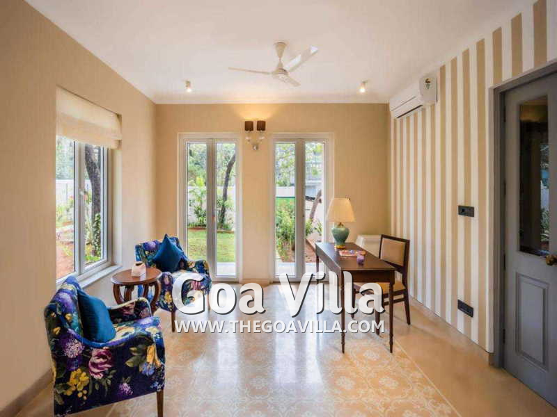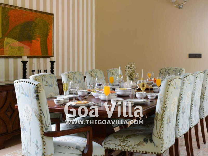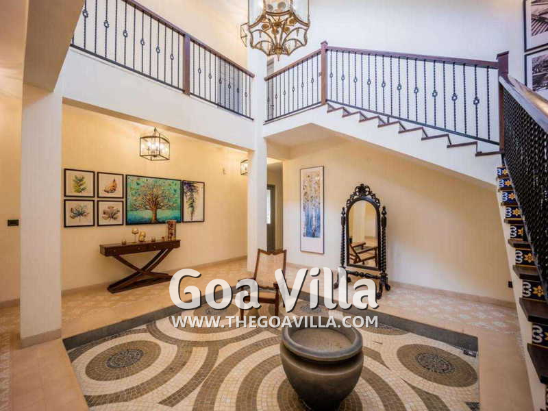 Living Room – This North Goa villa for rent has three areas indoor where the guests like to gather. The formal living room has a sofa area for all the guests that face a large-screen television, so that you can make the most of your indoor time. There is a second smaller area with armchairs. The villa also has a central courtyard with a few seats. This section is decorated with beautiful paintings. An antique open-staircase goes to the first floor.