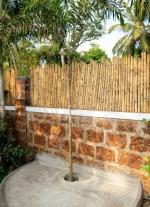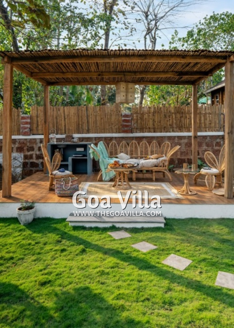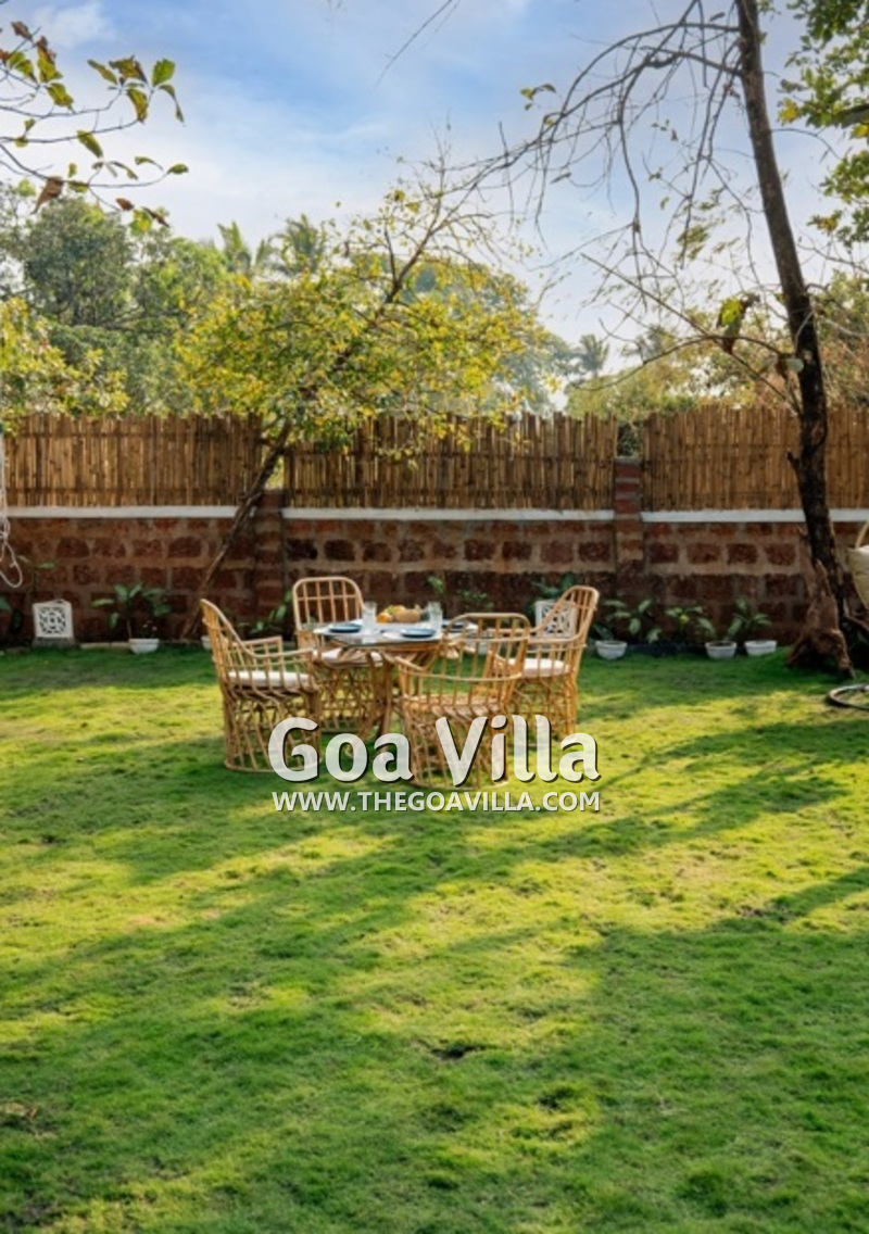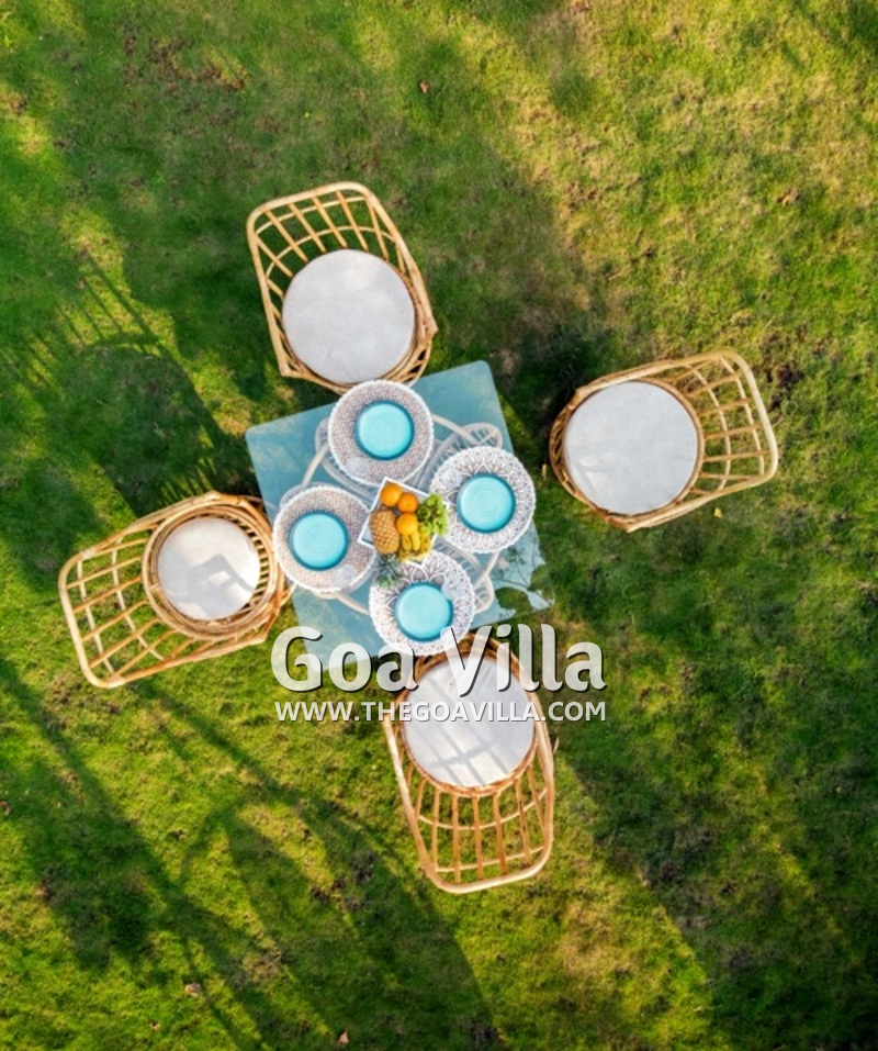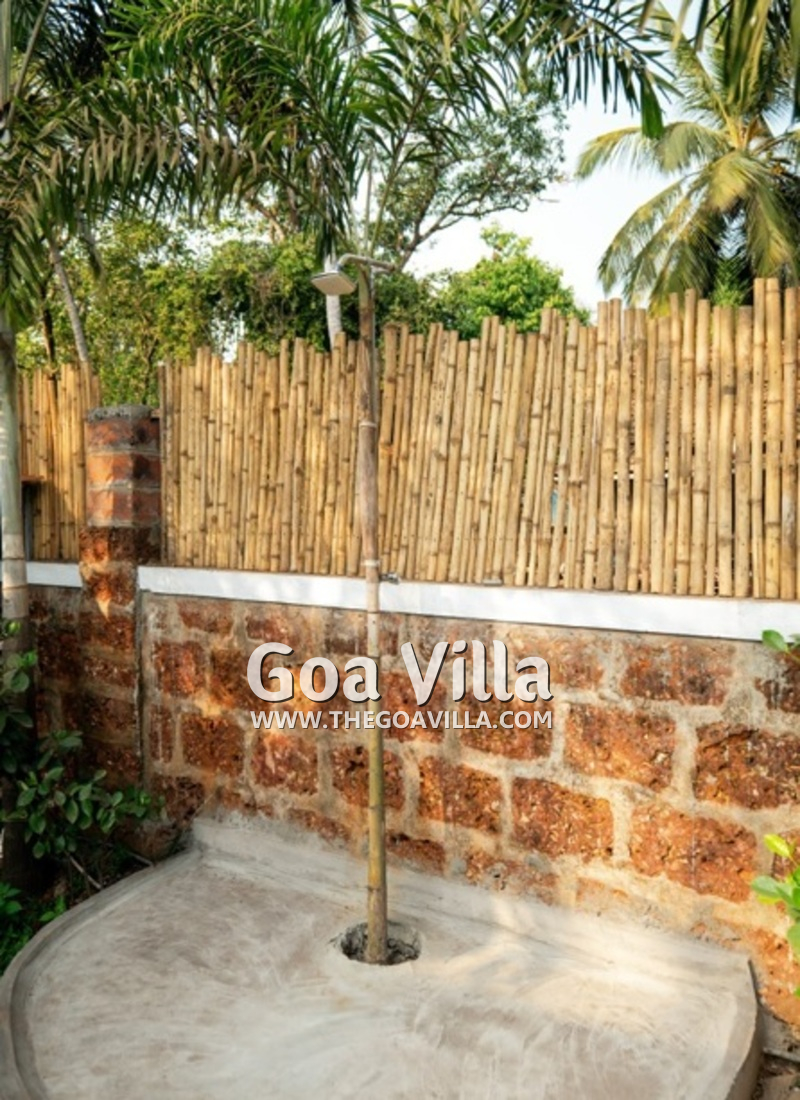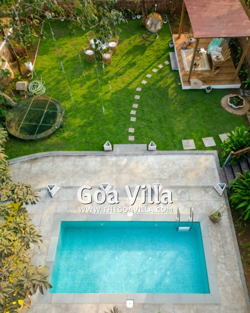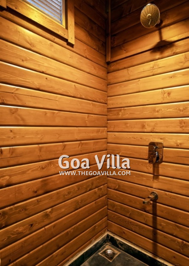 Swimming Pool – The Assagao Chalet comprises of 4,500 square feet of private space, most of which is the open area. On the right side of this, you will find a private swimming pool. The chalet is perhaps the only rental property in Goa for two guests that features a private pool. There is a beautiful seating area next to the pool and an outdoor shower. On the left, you will find a manicured lawn and a garden with outdoor furniture. The garden also has a shaded area with a sofa and a summer kitchen.