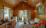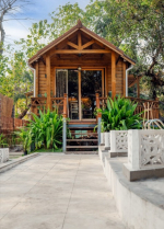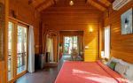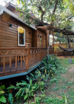 Bedrooms – The chalet is made entirely of wood, including the bedroom. It has a large double bed with high-quality linen for two guests. The room is air-conditioned for your comfort. Two windows provide views of the garden. There is a large wardrobe with plenty of storage and hanging space. There is also a mirror and a mini refrigerator. High wooden ceiling allows plenty of air and light to flood the space. A glass door slides open to a balcony, which also faces the garden and pool.
