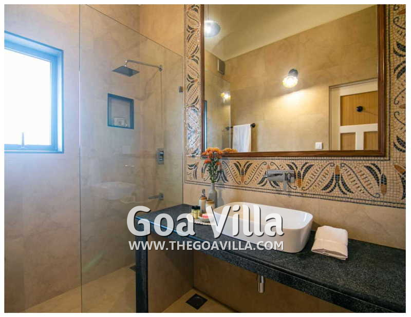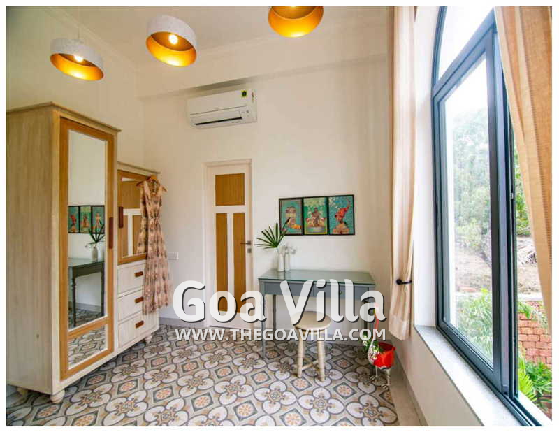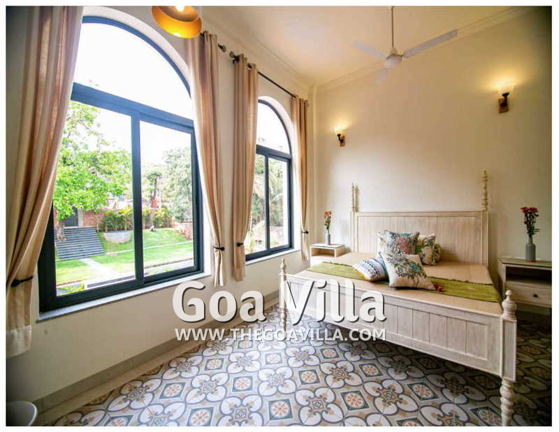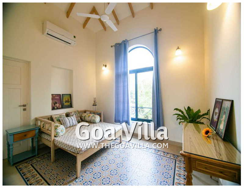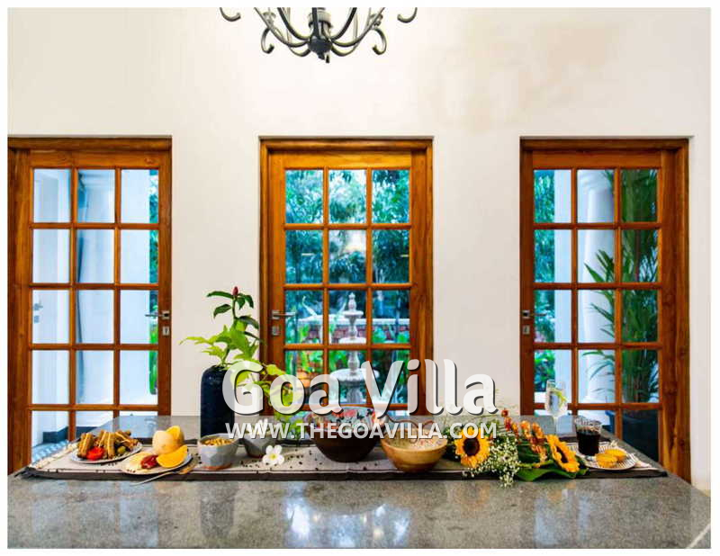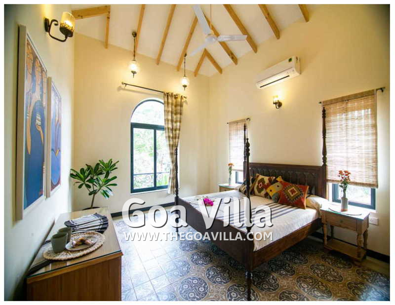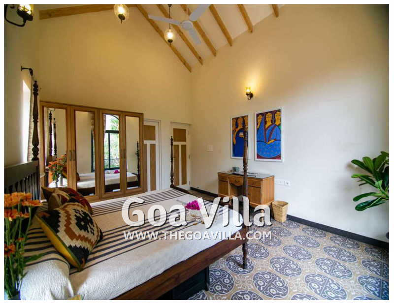 Bedrooms – The 5 bedrooms in this North Goa villa for rent can sleep 10 guests. Four of them have king beds, while the fifth has a sofa bed, which too can sleep two guests. Bedroom #1 has an antique four-poster bed. In bedroom #2, the bed is placed beside a wide window, so you will get the fantastic views even from your bed. Two others have antique beds. They are all air-conditioned for your comfort. There are large wardrobes and dressing areas.