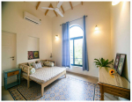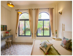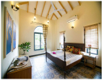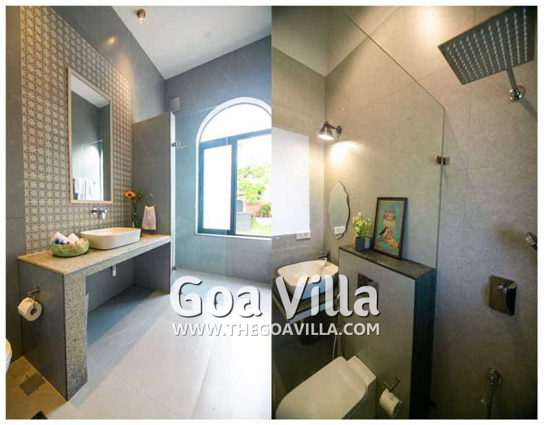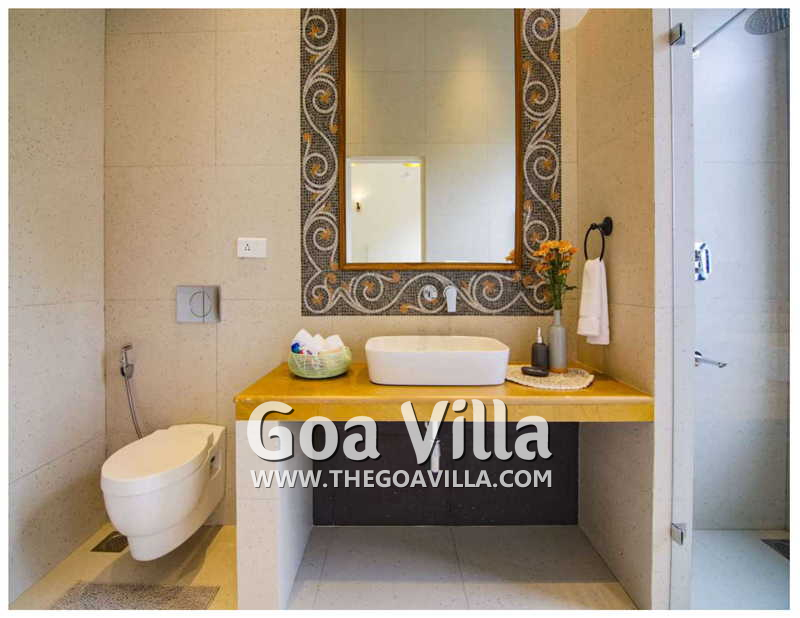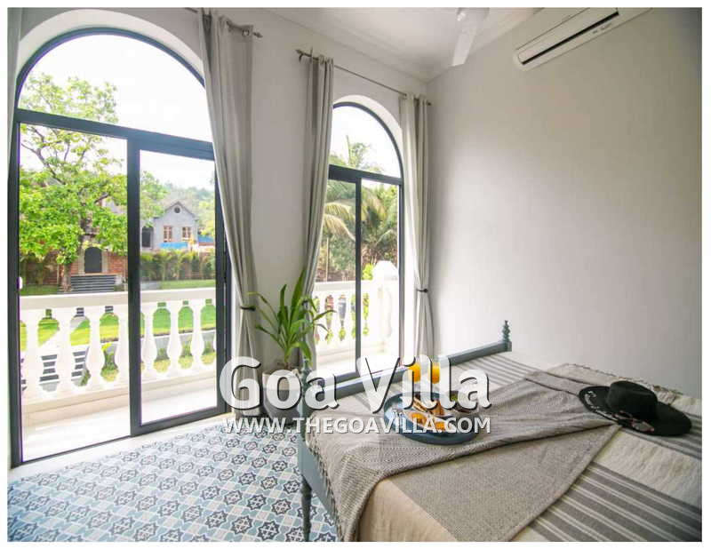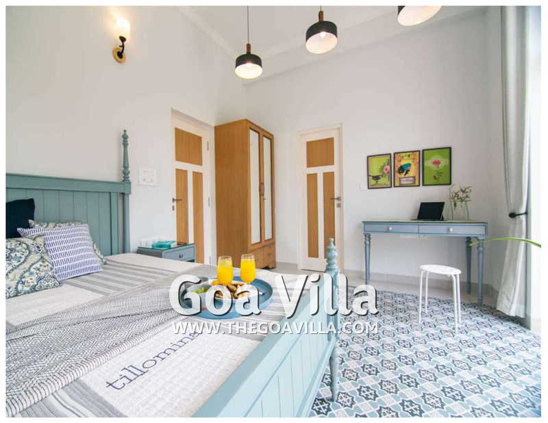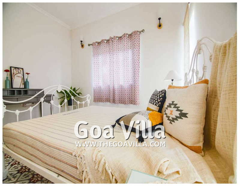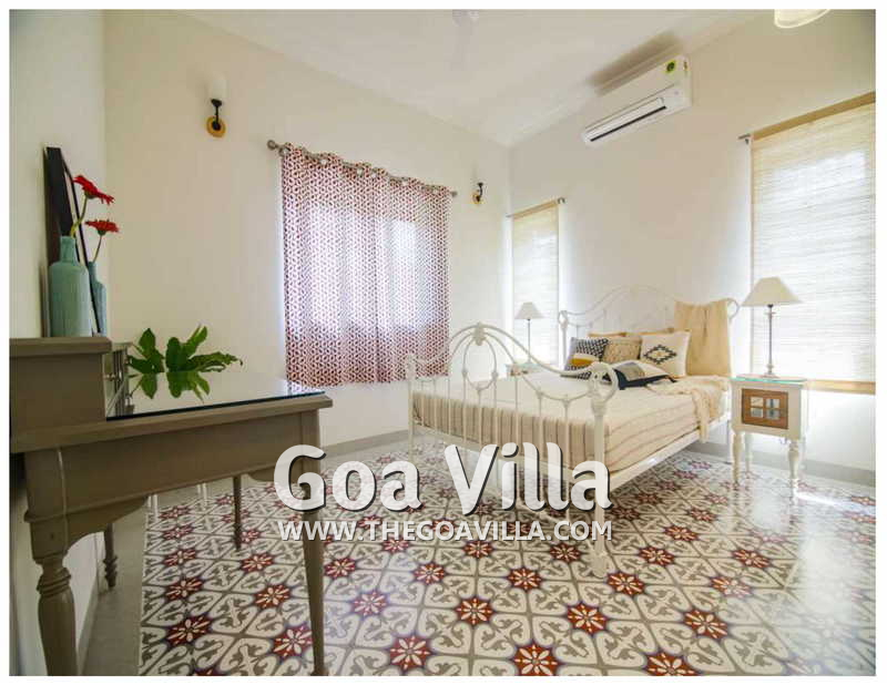 Bedrooms – The 5 bedrooms in this North Goa villa for rent can sleep 10 guests. Four of them have king beds, while the fifth has a sofa bed, which too can sleep two guests. Bedroom #1 has an antique four-poster bed. In bedroom #2, the bed is placed beside a wide window, so you will get the fantastic views even from your bed. Two others have antique beds. They are all air-conditioned for your comfort. There are large wardrobes and dressing areas.