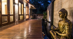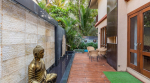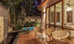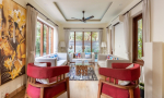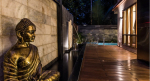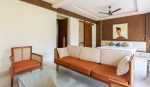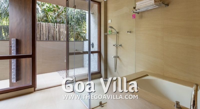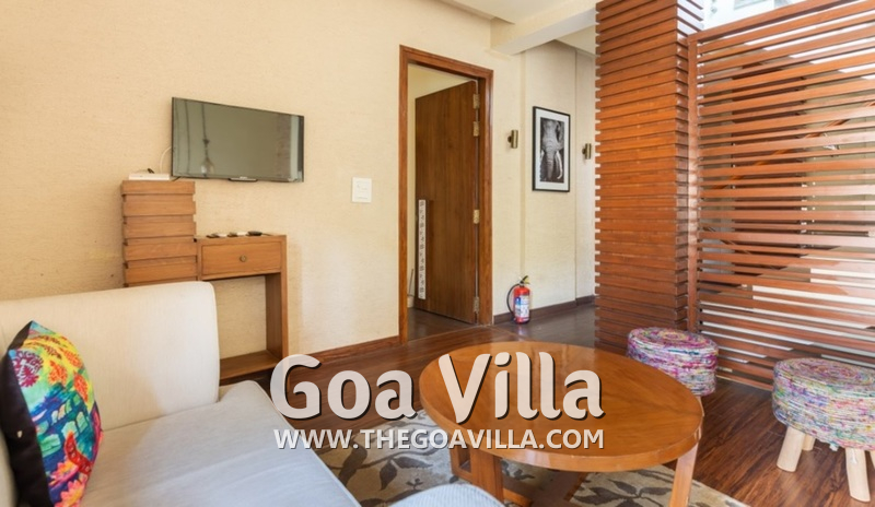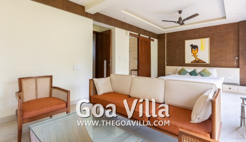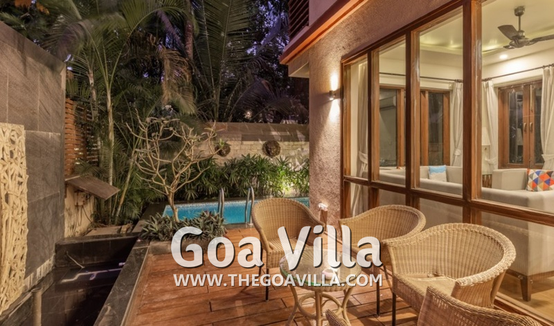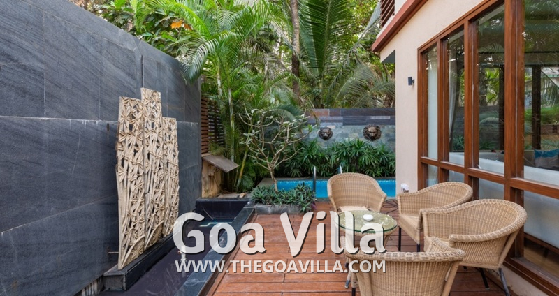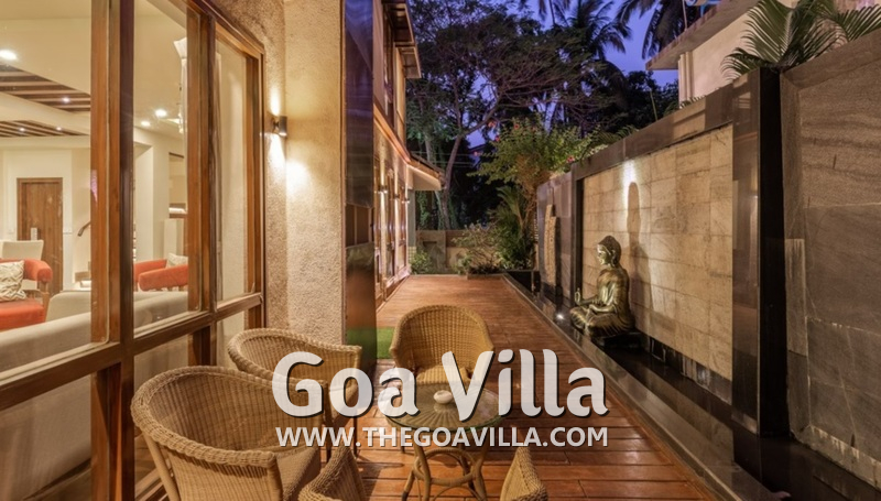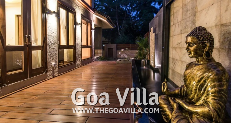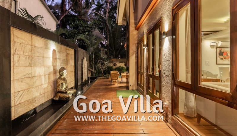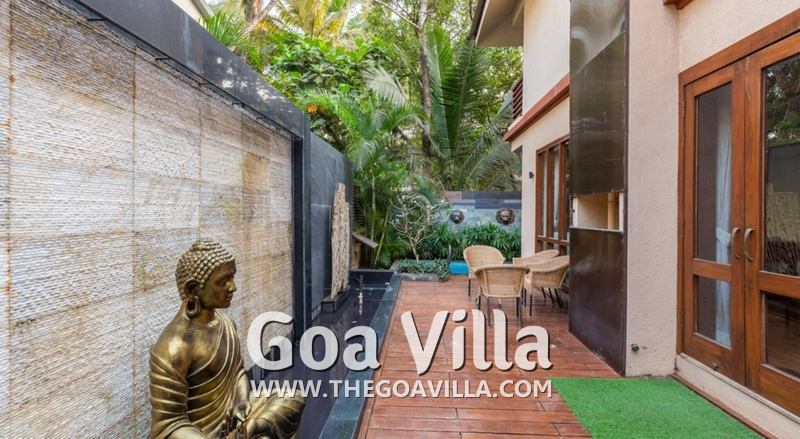 Swimming Pool – The outside of this North Goa holiday villa is serene and beautiful, thanks to the many tall trees. The private swimming pool is surrounded by a small garden too. It has a few fountains, which the kids are sure to love. The entire area is decorated with East Asian sculptures. There are two lounging spaces – one in the side of the pool and a second in a small courtyard. They have both been designed very aesthetically.