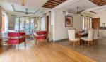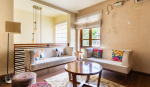Living Room – Villa Budh has two living rooms, one on each floor. The ground floor lounging space is a part of an open-plan room that also has the dining area. It overlooks the garden through large glass windows. There are several sofas here for many guests. The second lounging area is on the upper floor landing. Smaller in size, this too has deep-cushioned sofas with pillows for extra comfort and a small coffee table. There is a satellite television here.