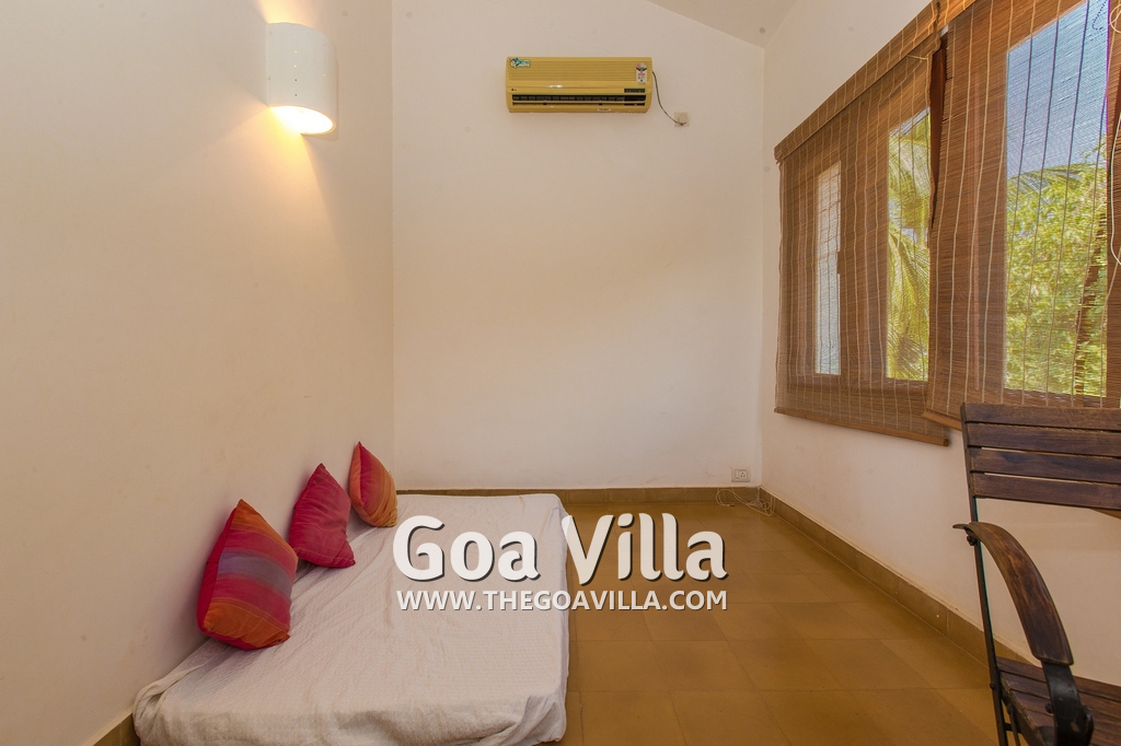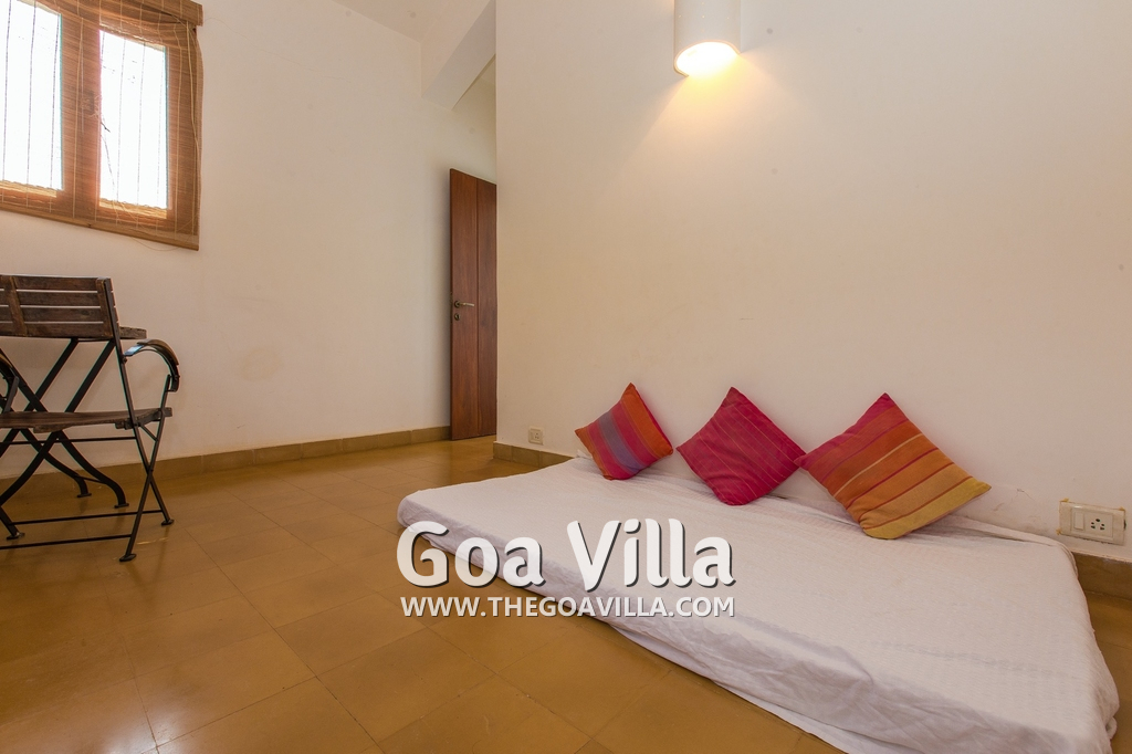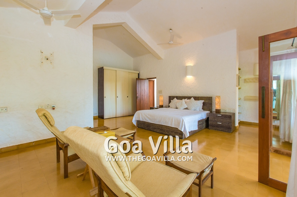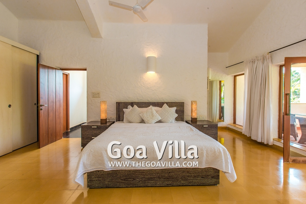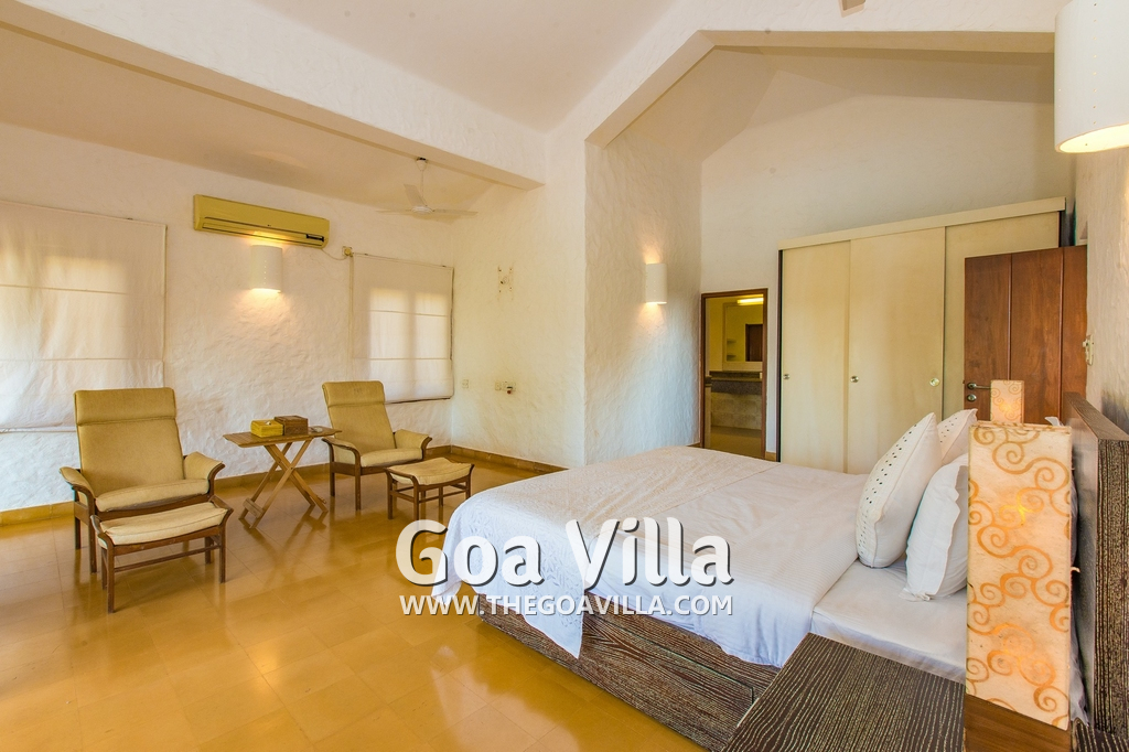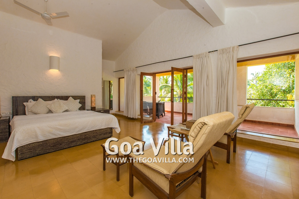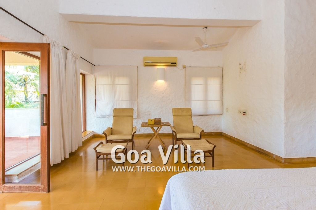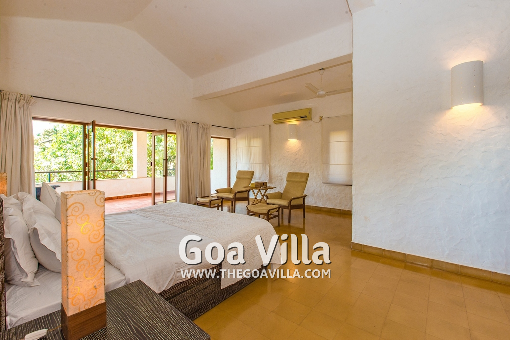 Bedrooms – Villa Casa Delmar has 4 bedrooms. 3 of them are en-suite. They are all air-conditioned but also has ceiling fans. The bedrooms have modern furnishing with large beds and extra cushions for comfort, side tables, lamp shades, wardrobe, sofa, and paintings on the wall. Whitewashed walls provide a soothing touch. The first bedroom without attached bath has a floor sleeping area with a comfortable mattress. The master bedroom is larger in size and also has a recliner. Beautiful balcony outside with sitting, providing nature views.