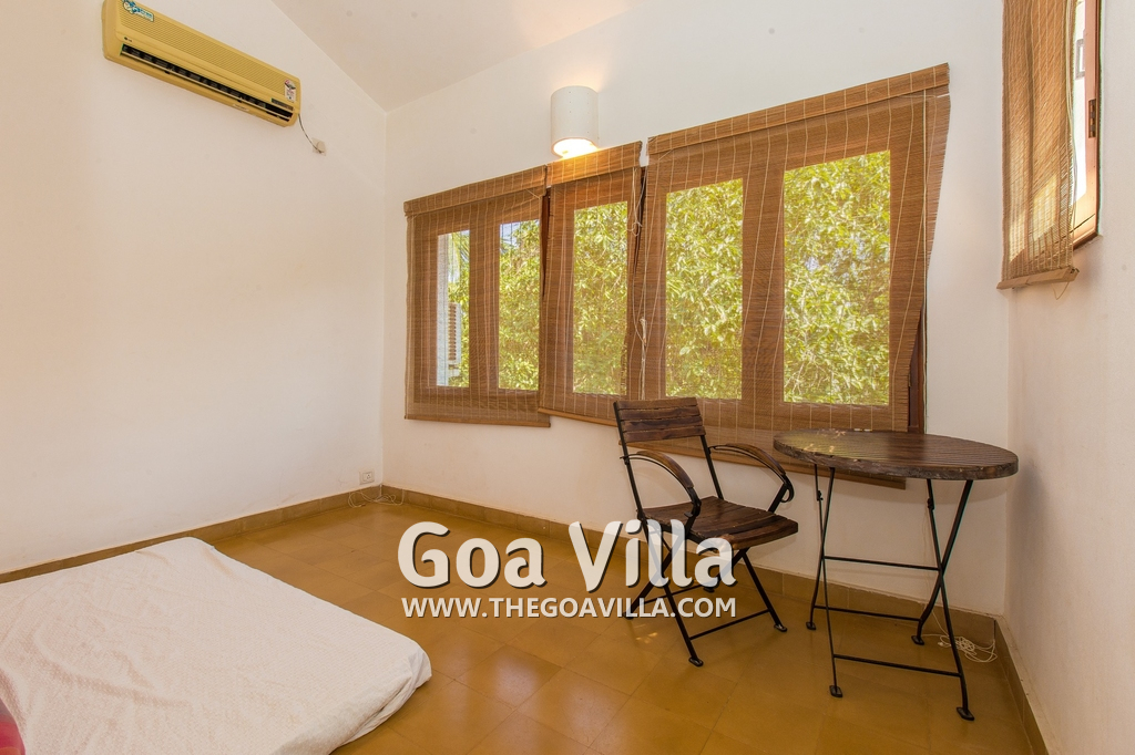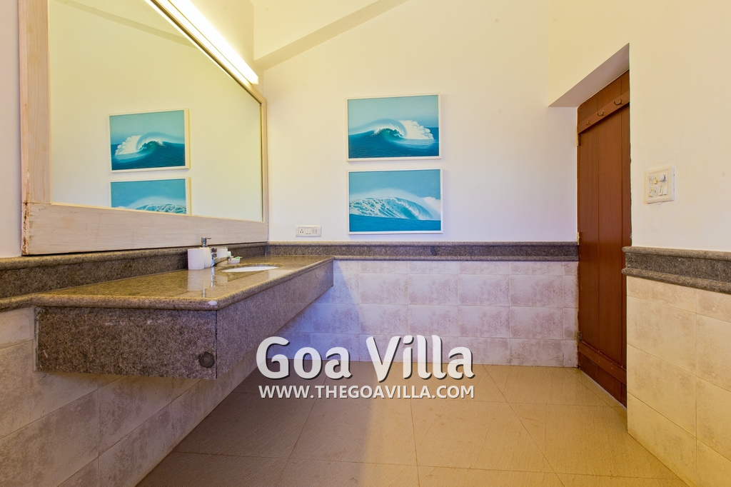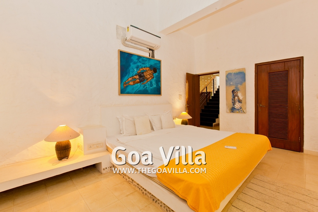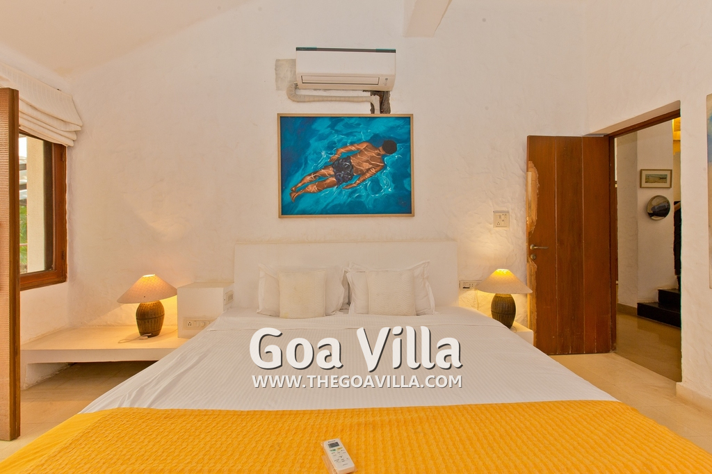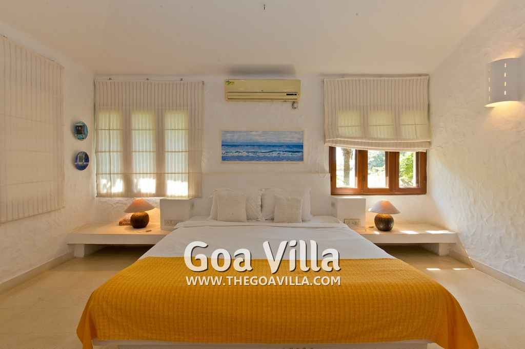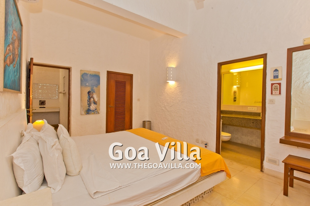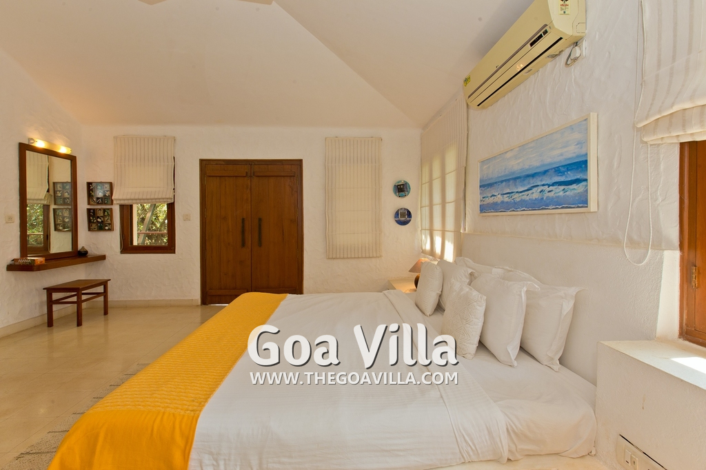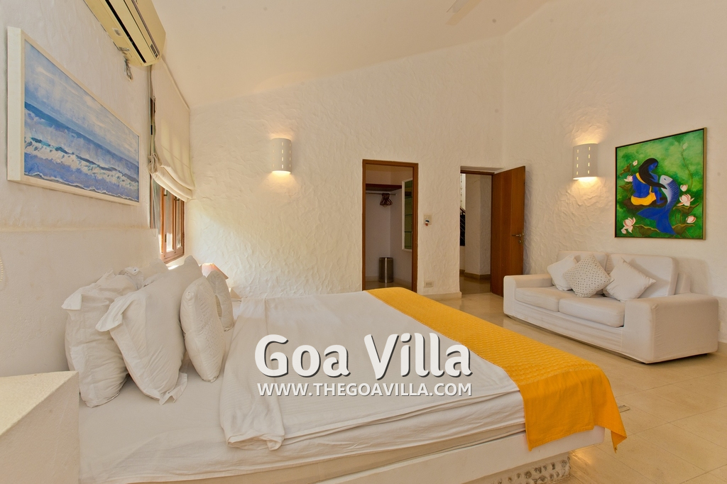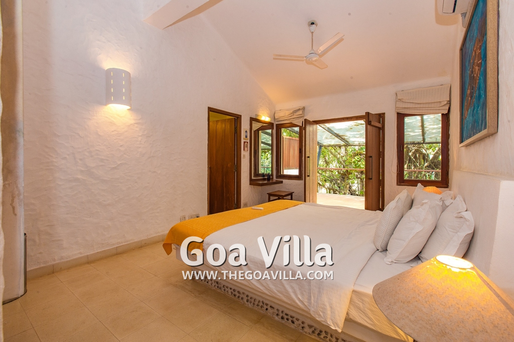 Bedrooms – Villa Casa Delmar has 4 bedrooms. 3 of them are en-suite. They are all air-conditioned but also has ceiling fans. The bedrooms have modern furnishing with large beds and extra cushions for comfort, side tables, lamp shades, wardrobe, sofa, and paintings on the wall. Whitewashed walls provide a soothing touch. The first bedroom without attached bath has a floor sleeping area with a comfortable mattress. The master bedroom is larger in size and also has a recliner. Beautiful balcony outside with sitting, providing nature views.
