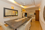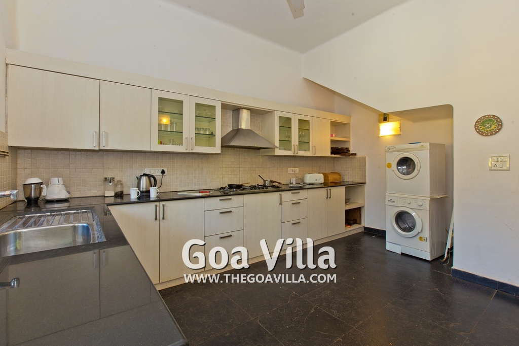 Dining, Kitchen – The dining area at this holiday villa for rent is beautiful. There is a rustic wooden table with sitting for 8 guests. Paintings adorn the wall. Casa Delmar has a fully equipped kitchen with a kettle, juicer, toaster, cooking station, chimney, sink, double-door refrigerator, and washing machine. Cutlery and cookware is provided for the guests.