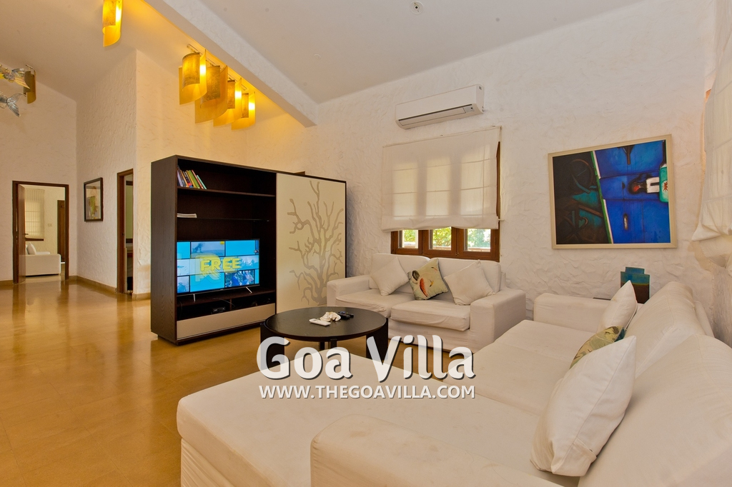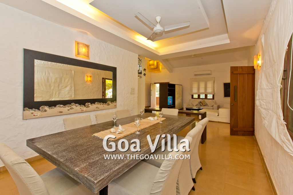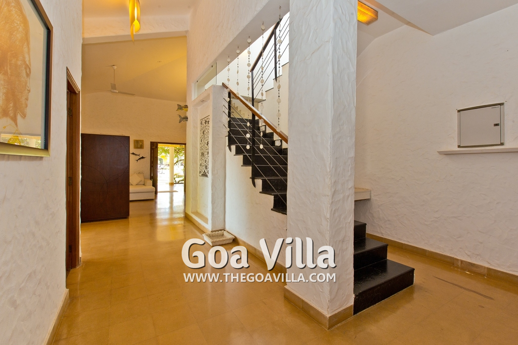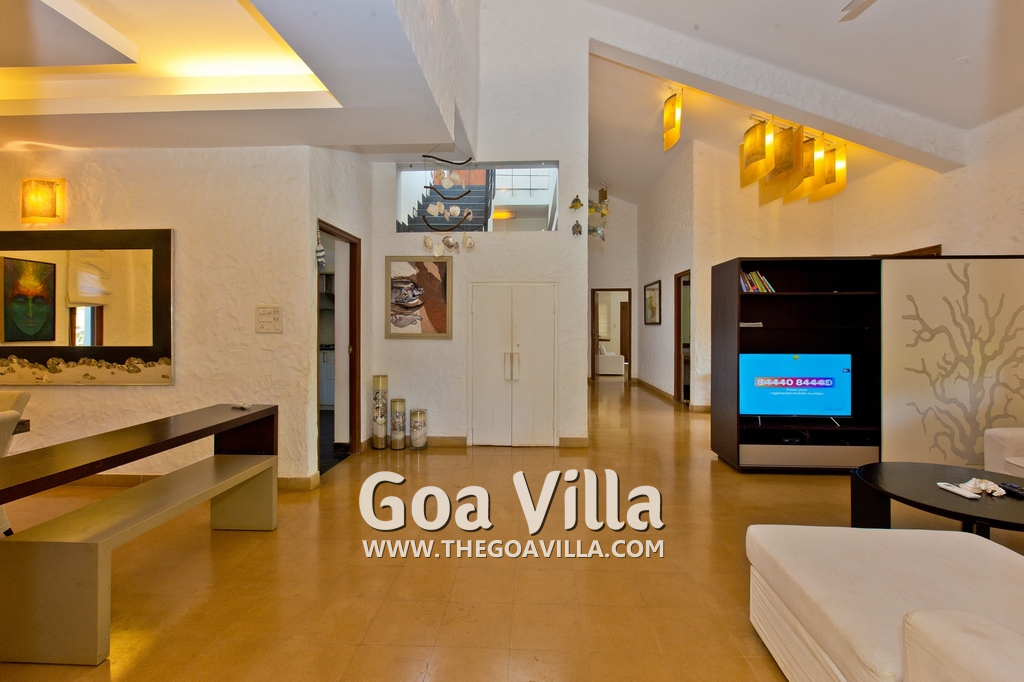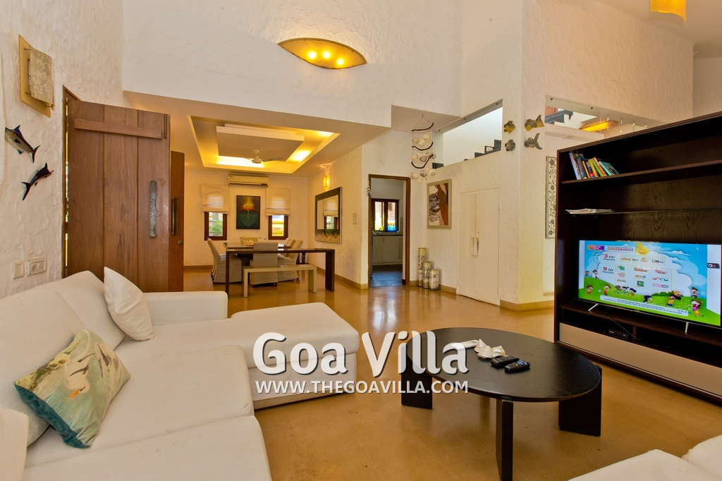 Living Room – This room is beautifully decorated with unique lighting and objects of art. It reflects Goa’s theme – sea and fish. You will find several fish sculptures here. There is also a comfortable sofa, center table, and large-screen satellite television. Staircase leads to the first floor from one side.