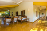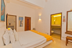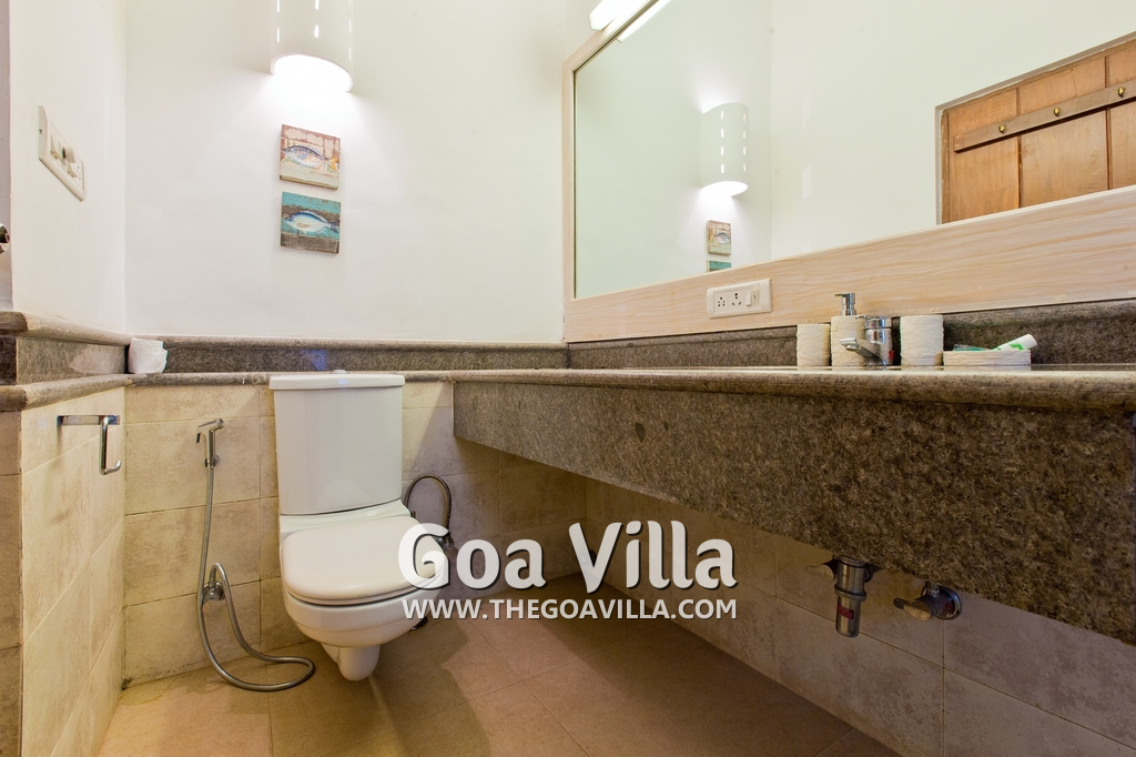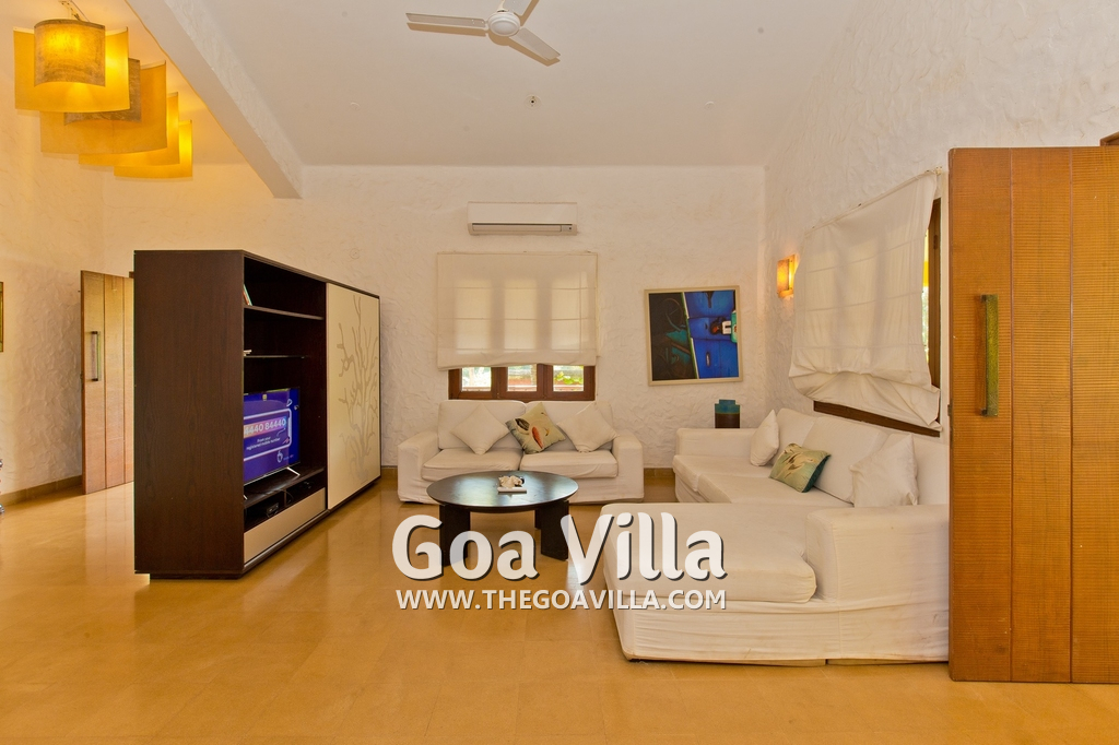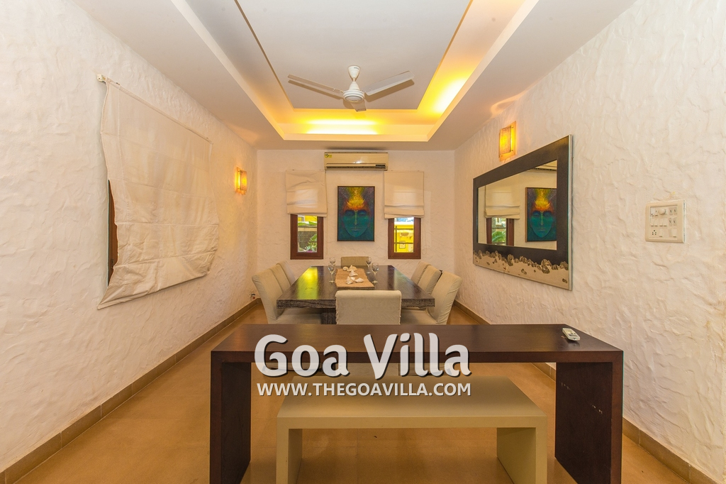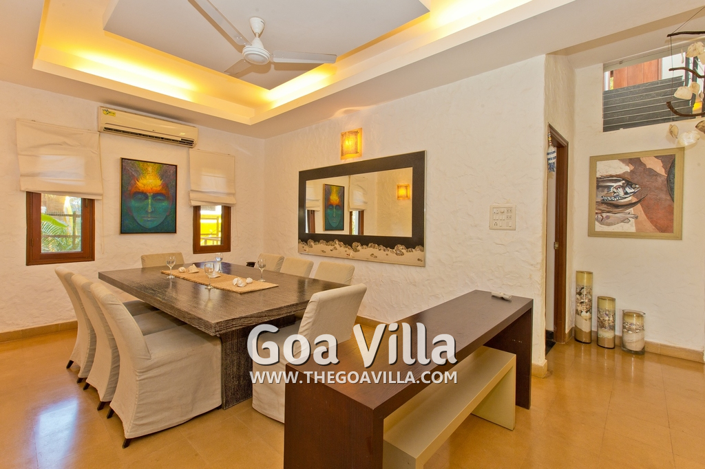 Living Room – This room is beautifully decorated with unique lighting and objects of art. It reflects Goa’s theme – sea and fish. You will find several fish sculptures here. There is also a comfortable sofa, center table, and large-screen satellite television. Staircase leads to the first floor from one side.