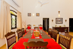 Living Room – The open-plan living, dining, and kitchen area is unique in design. This huge space has an atrium and a frangipani tree. Wrought iron and wood spiral staircase leads to the first floor from the center. Large comfortable sofa with a glass-top center table, beautiful lamp shades, and paintings beauty this room. There is a DVD player and satellite television.