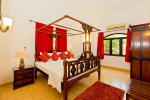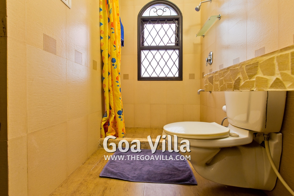 Bedrooms – The villa has 4 bedrooms, all en-suite and air-conditioned. 2 bedrooms are on the ground floor. 1st floor has the master bedroom. The master bedroom is bigger in size and opens to a wide balcony with a comfortable sitting area. They all have unique color themes – bright red, peacock blue, and two shades of yellow. Antique furniture with a large King-size bed, extra cushions, wardrobe, side table, lamp shade, mattress, and paintings on the wall.
