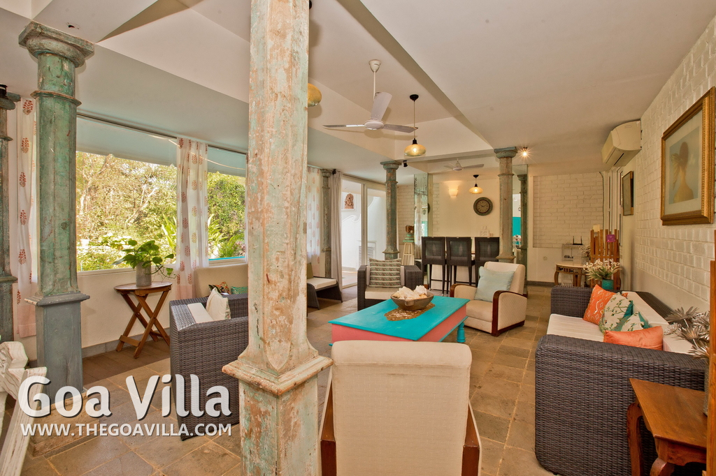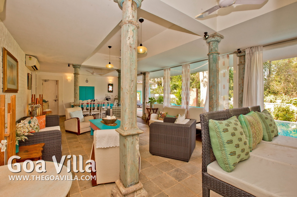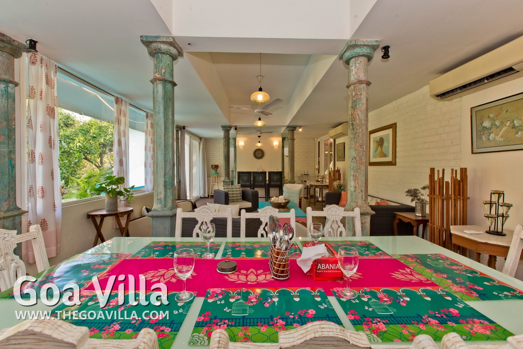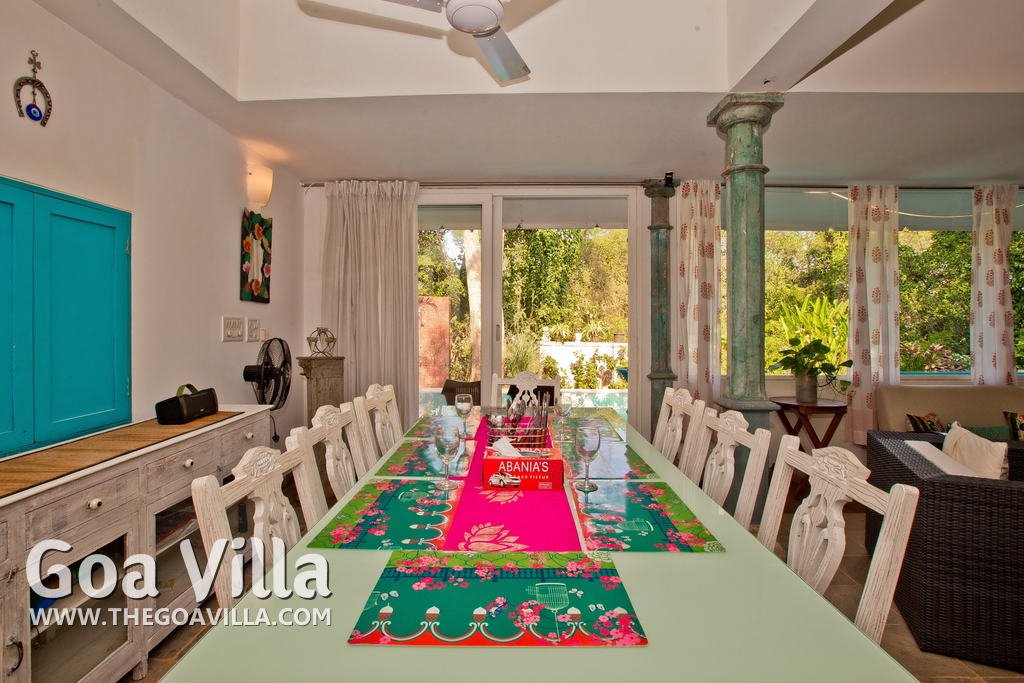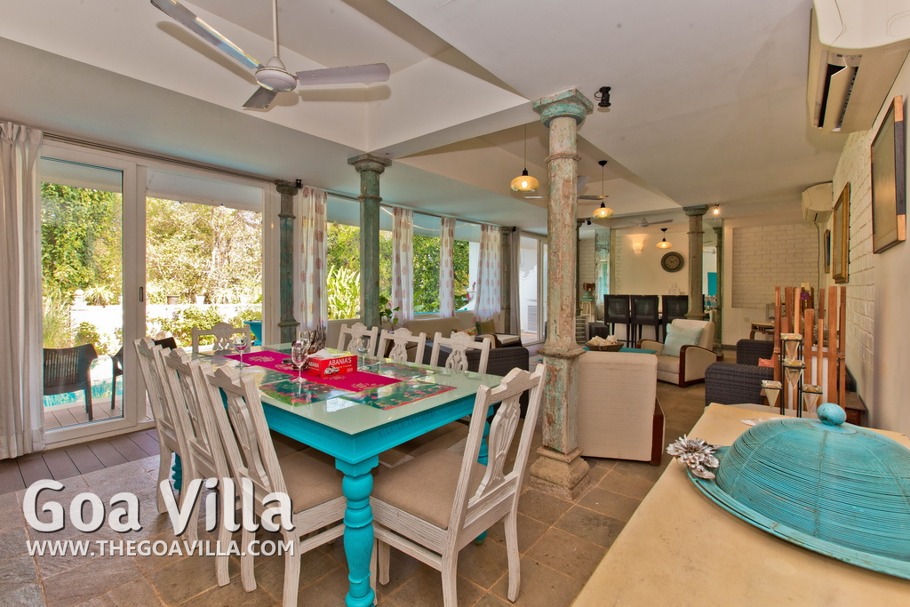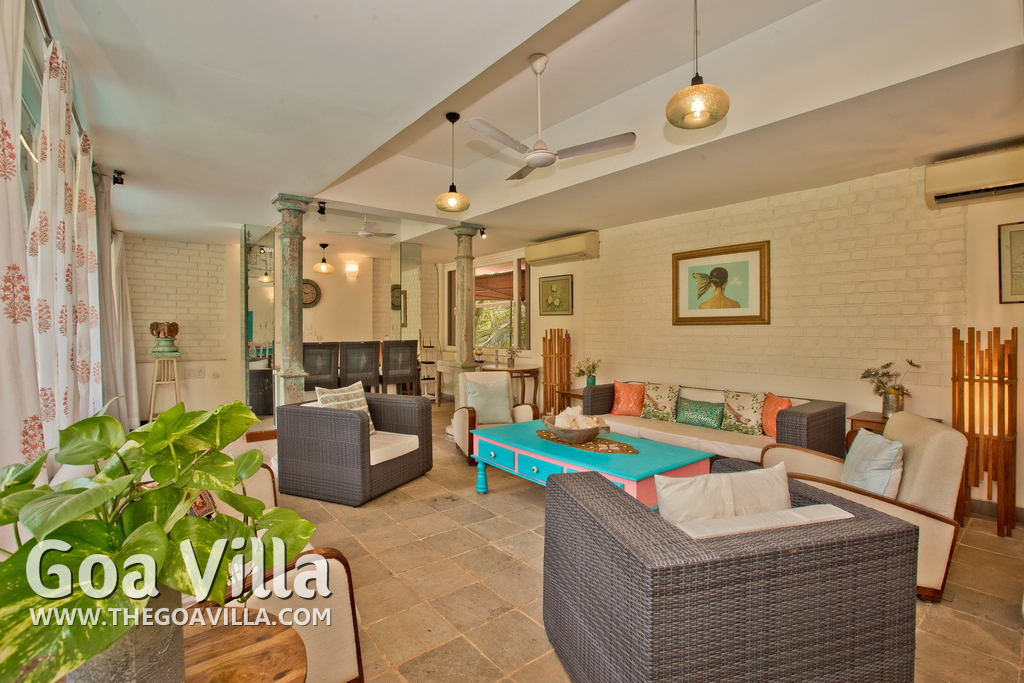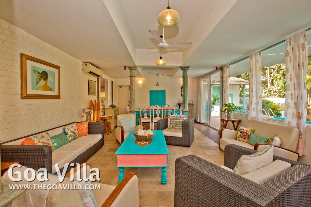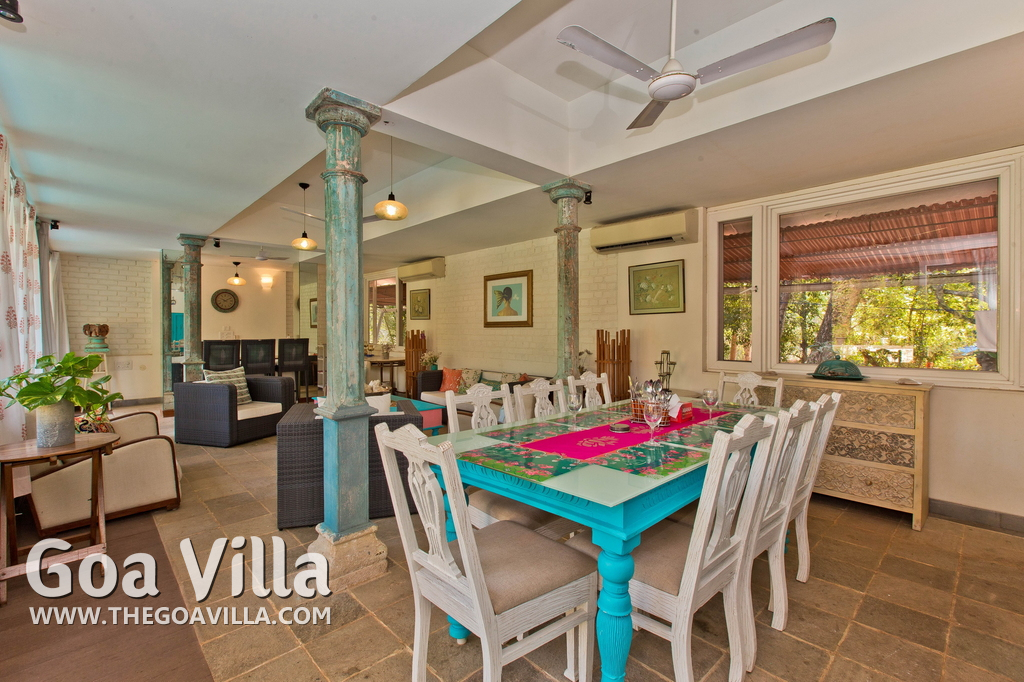 Living Room – The living room at this villa for rent in Anjuna demands a special mention. It faces the swimming pool and is almost completely open. There are comfortable sofas and chairs and decorative lampshades. Vibrant colors. Paintings on the walls and decorative pieces. Large glass windows and doors provide clear outside nature views. This room is also air-conditioned.