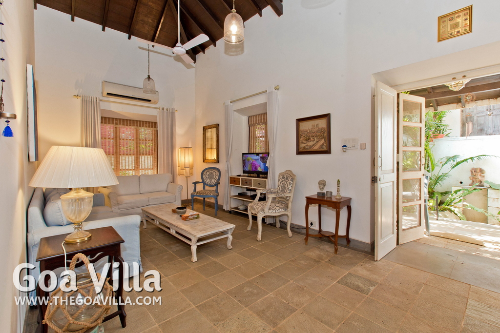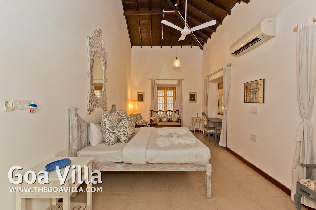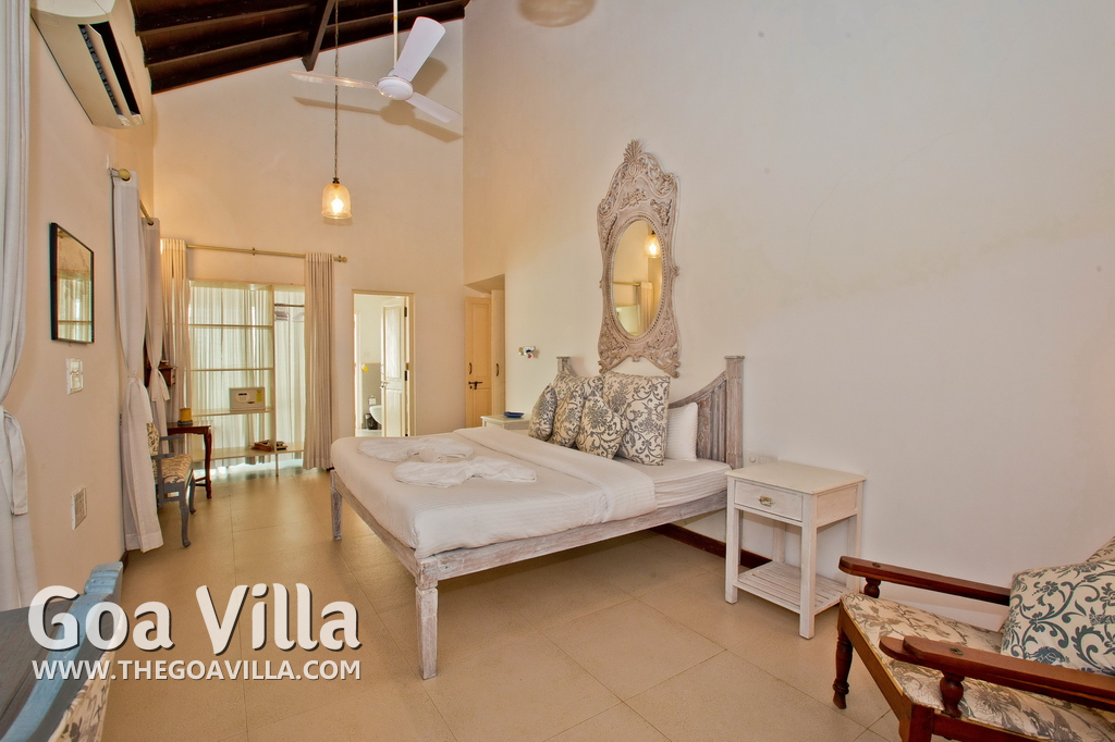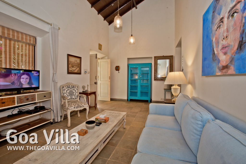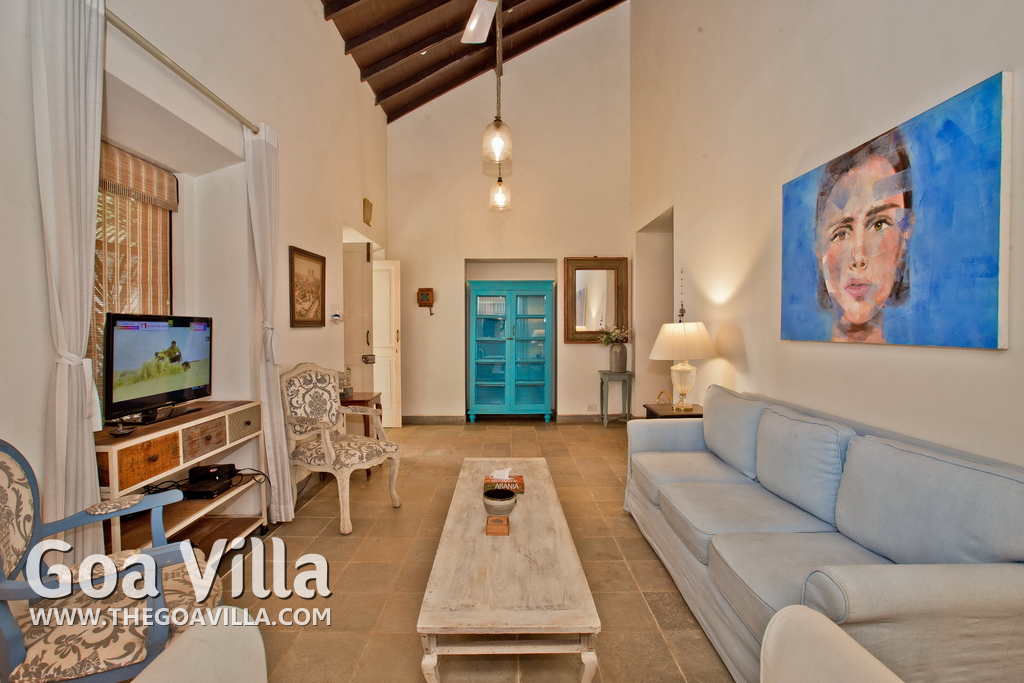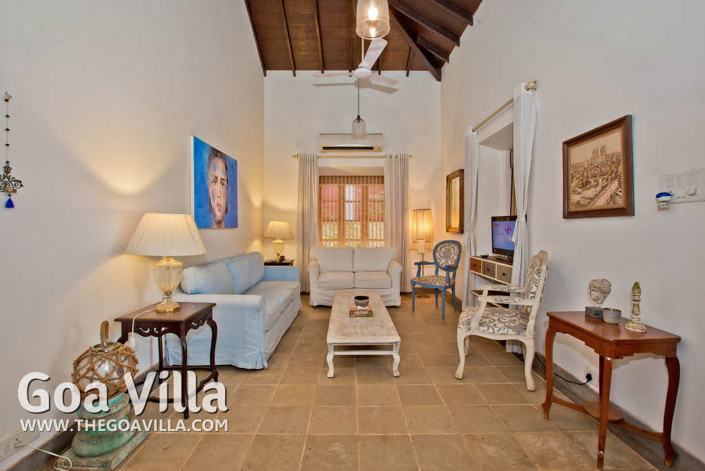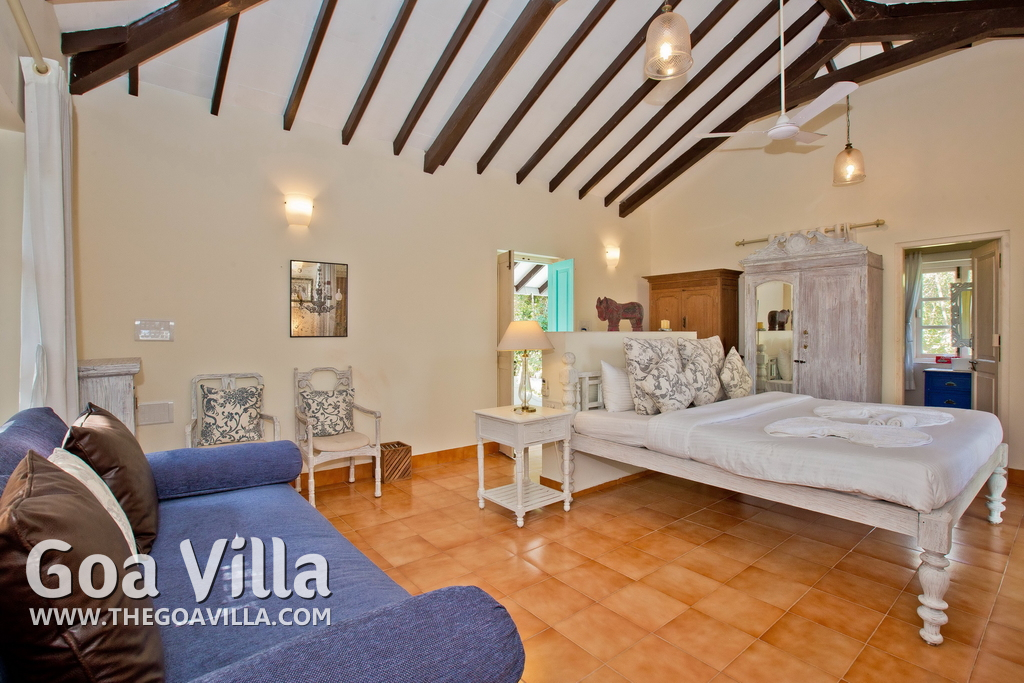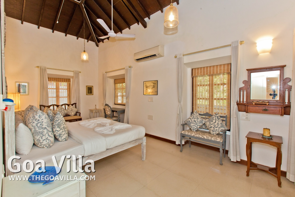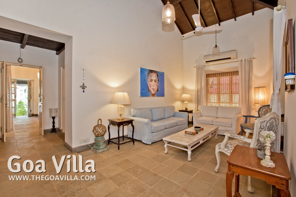 Living Room – The living room at this villa for rent in Anjuna demands a special mention. It faces the swimming pool and is almost completely open. There are comfortable sofas and chairs and decorative lampshades. Vibrant colors. Paintings on the walls and decorative pieces. Large glass windows and doors provide clear outside nature views. This room is also air-conditioned.