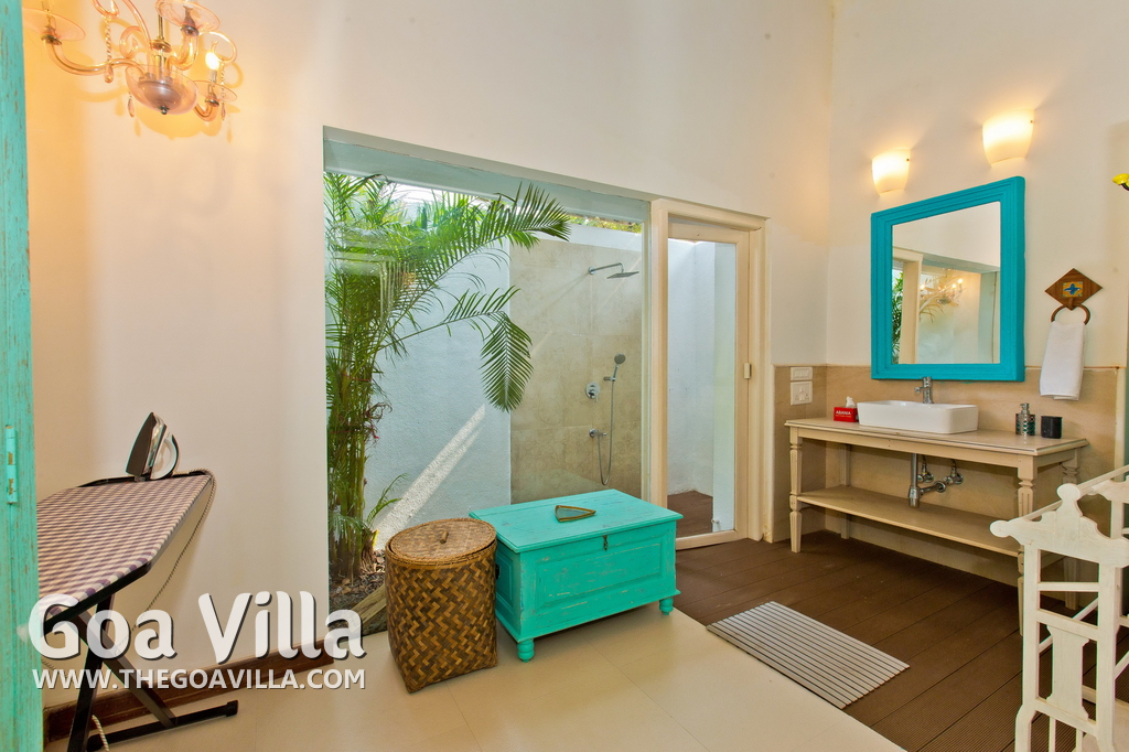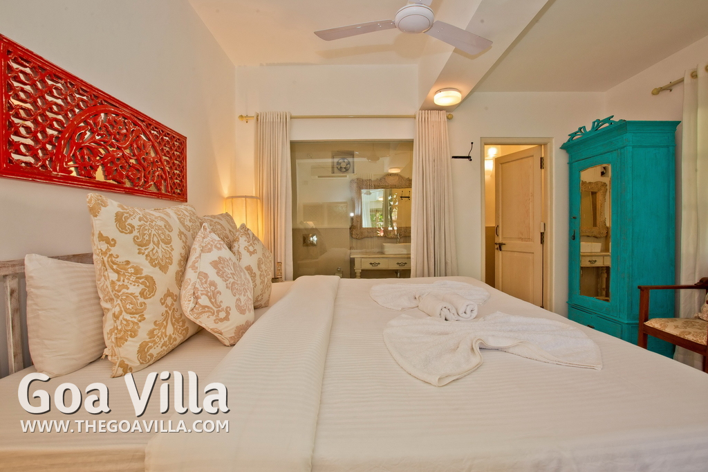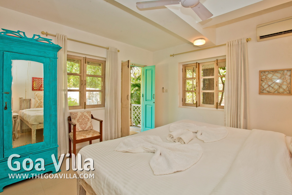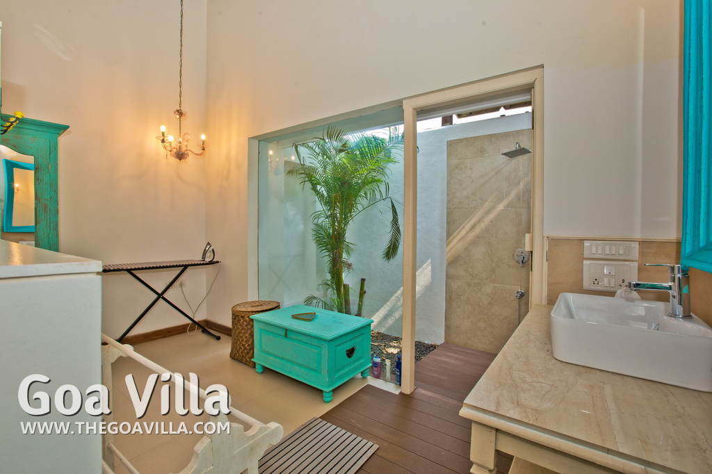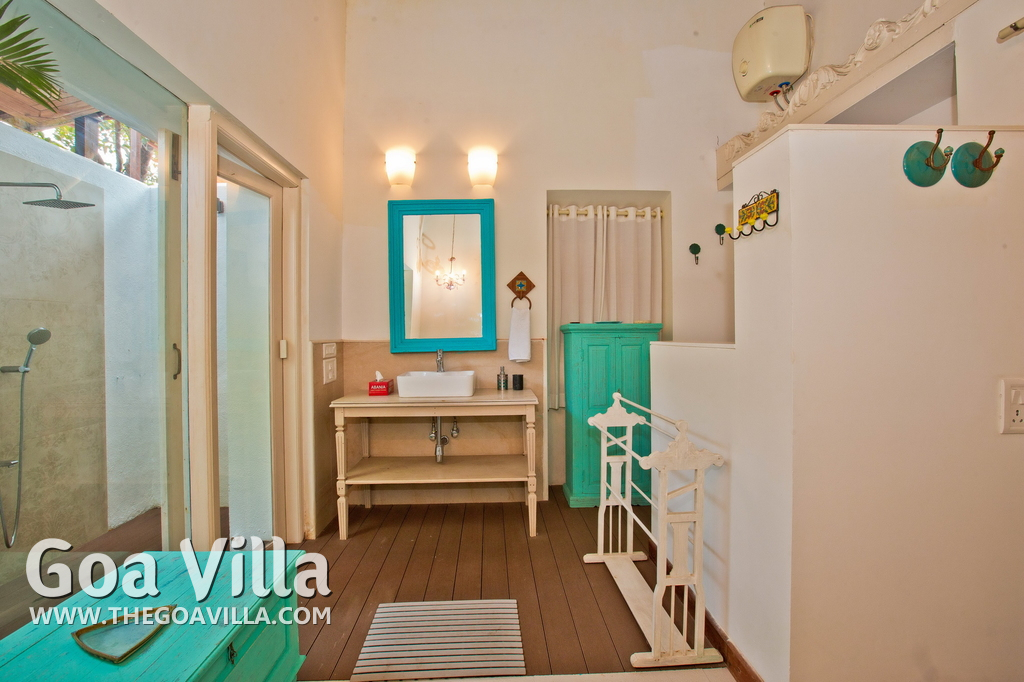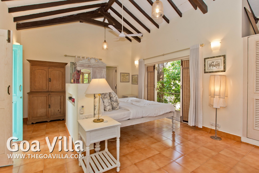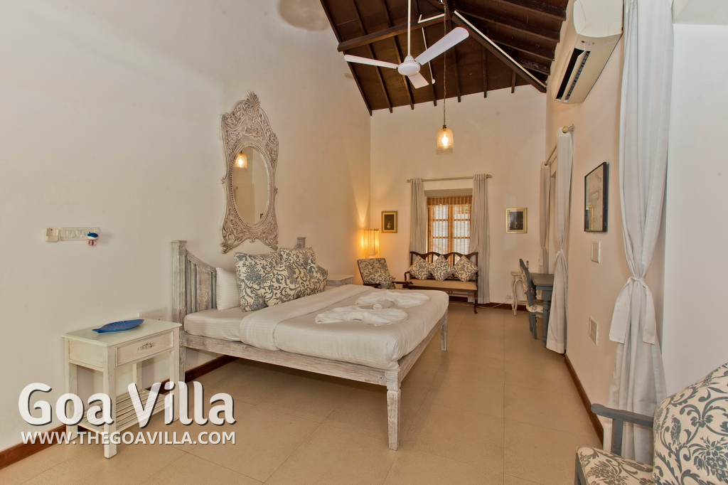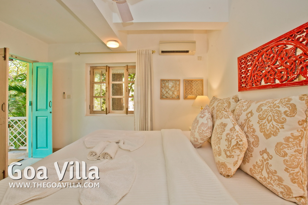 Living Room – The living room at this villa for rent in Anjuna demands a special mention. It faces the swimming pool and is almost completely open. There are comfortable sofas and chairs and decorative lampshades. Vibrant colors. Paintings on the walls and decorative pieces. Large glass windows and doors provide clear outside nature views. This room is also air-conditioned.