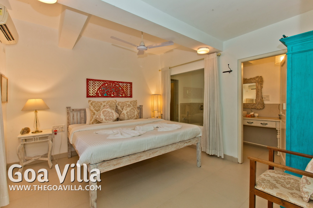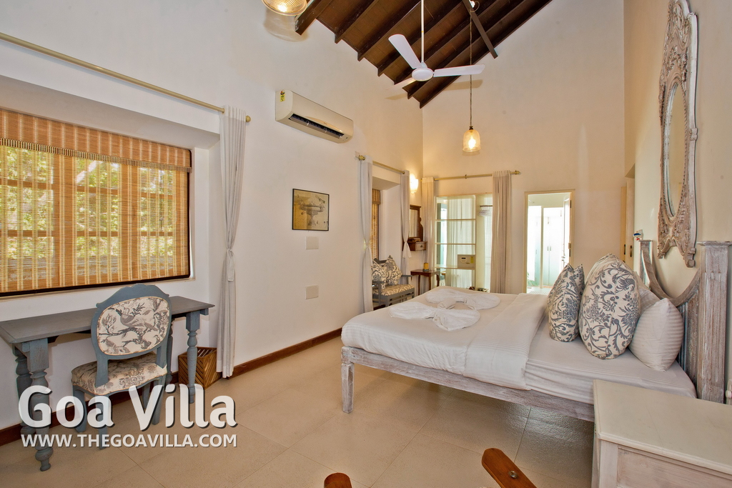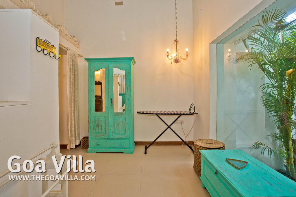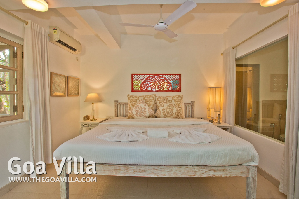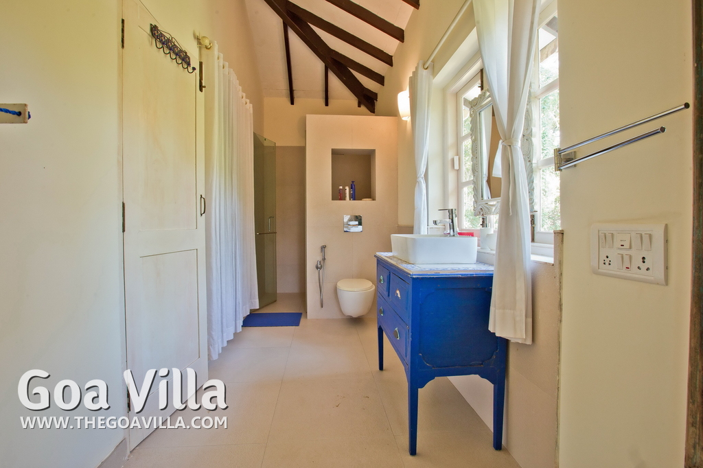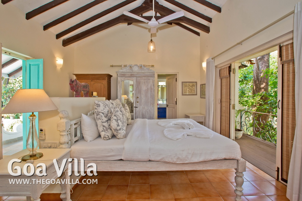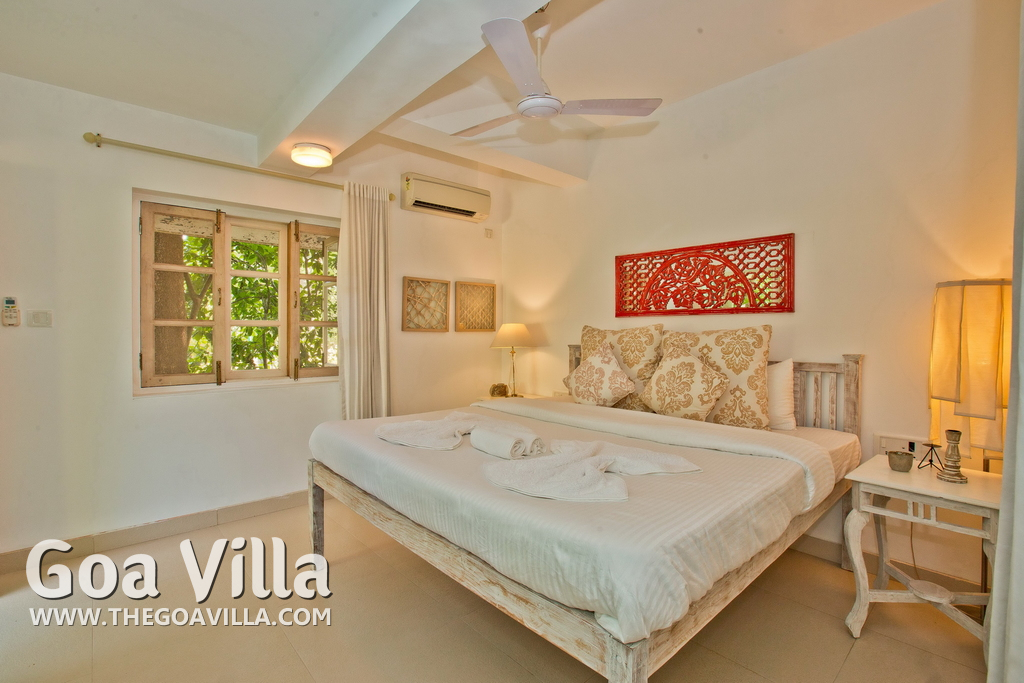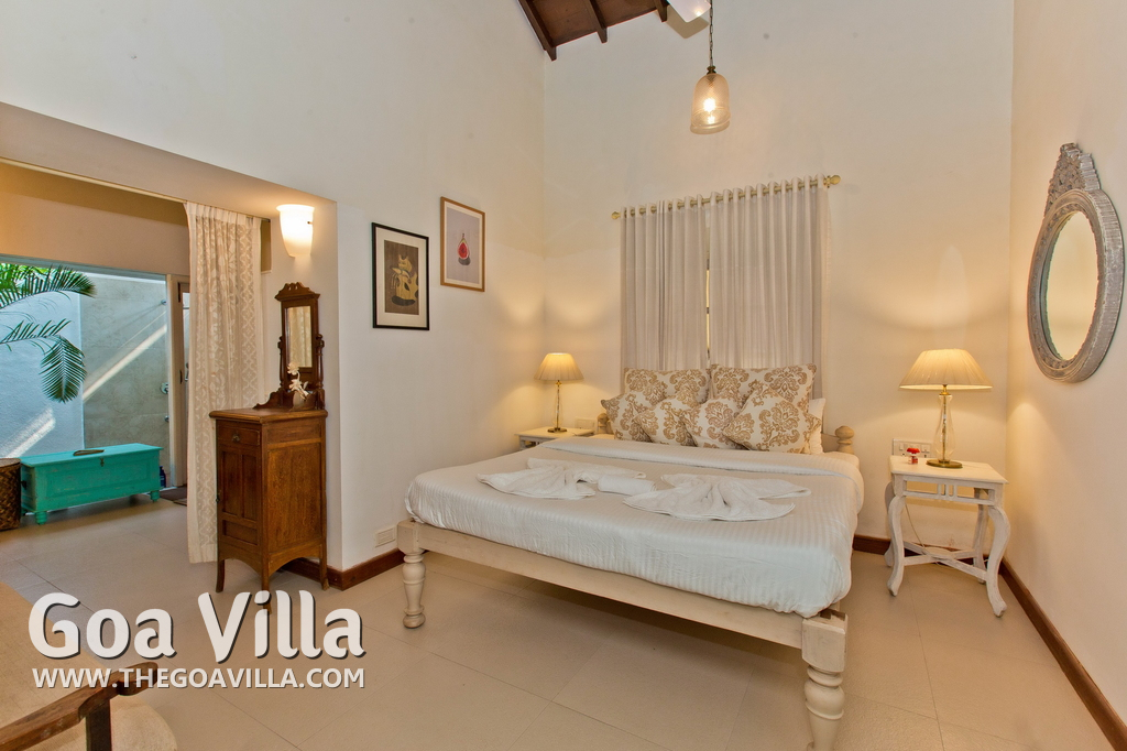 Living Room – The living room at this villa for rent in Anjuna demands a special mention. It faces the swimming pool and is almost completely open. There are comfortable sofas and chairs and decorative lampshades. Vibrant colors. Paintings on the walls and decorative pieces. Large glass windows and doors provide clear outside nature views. This room is also air-conditioned.