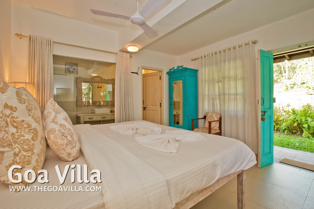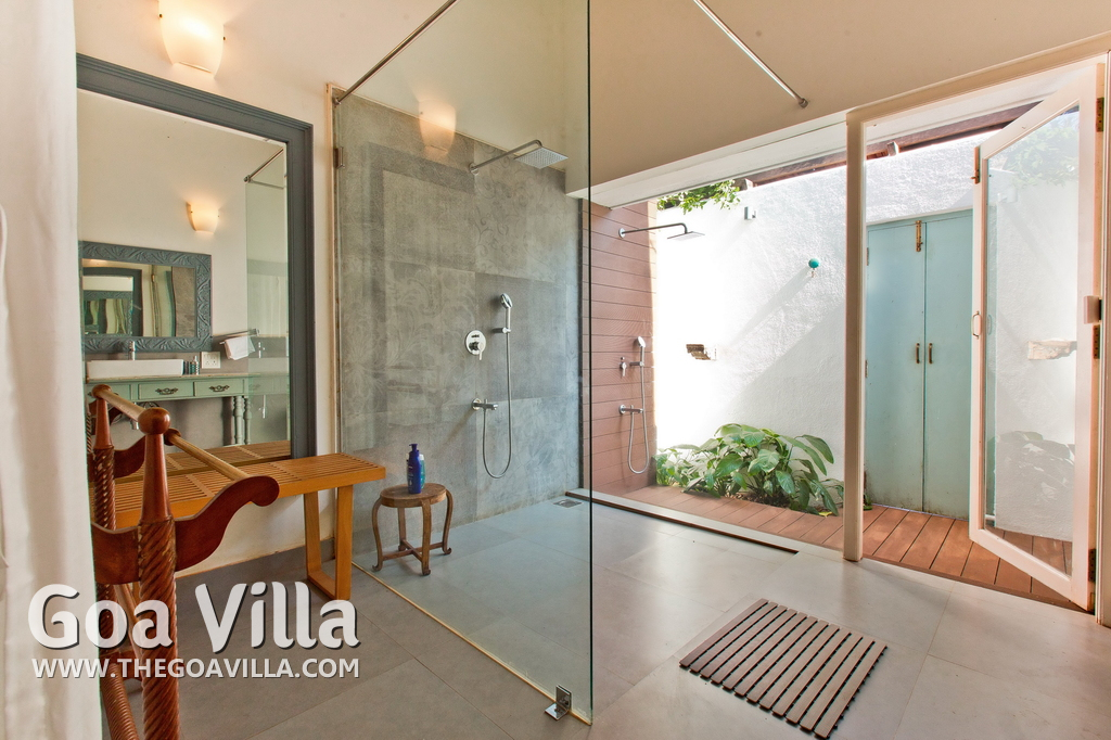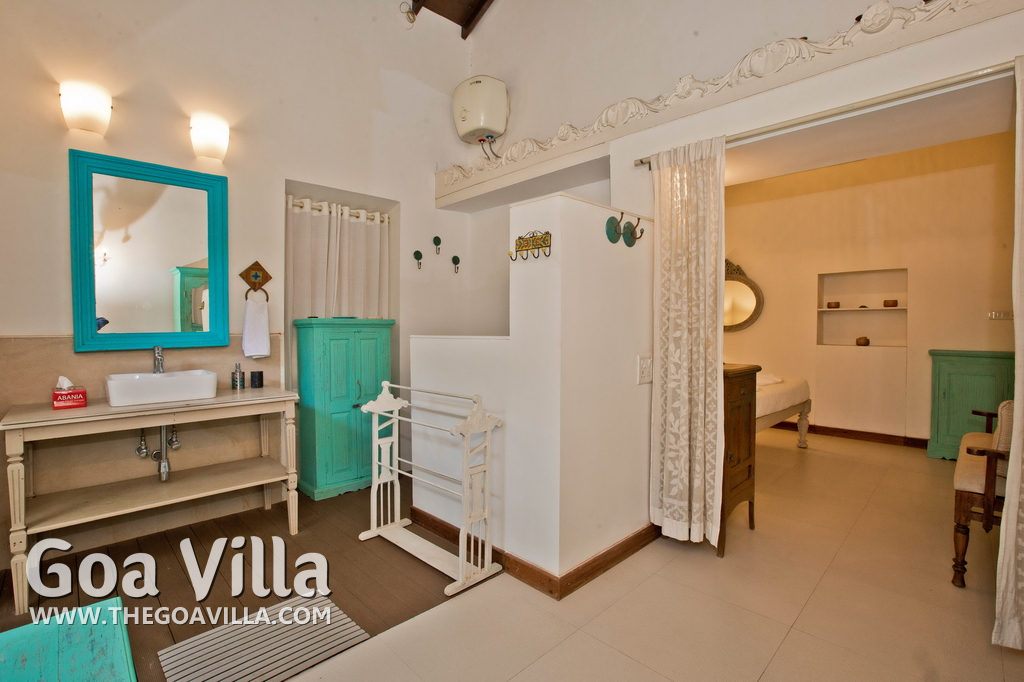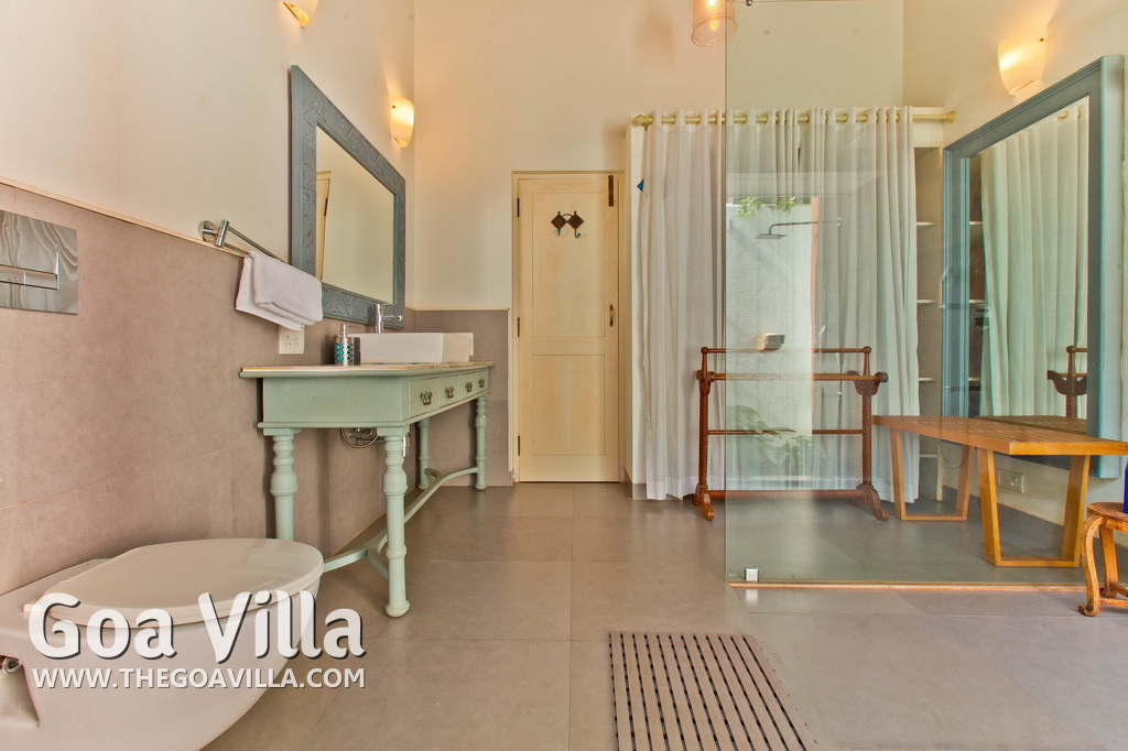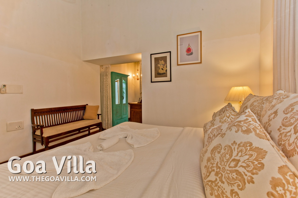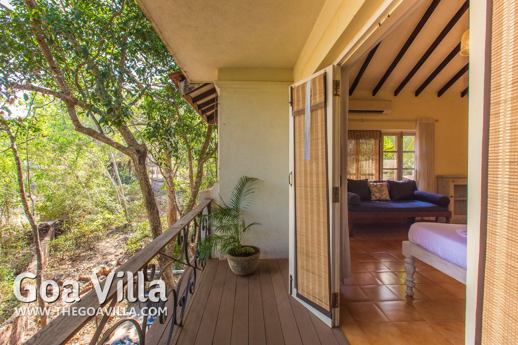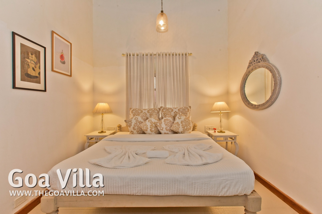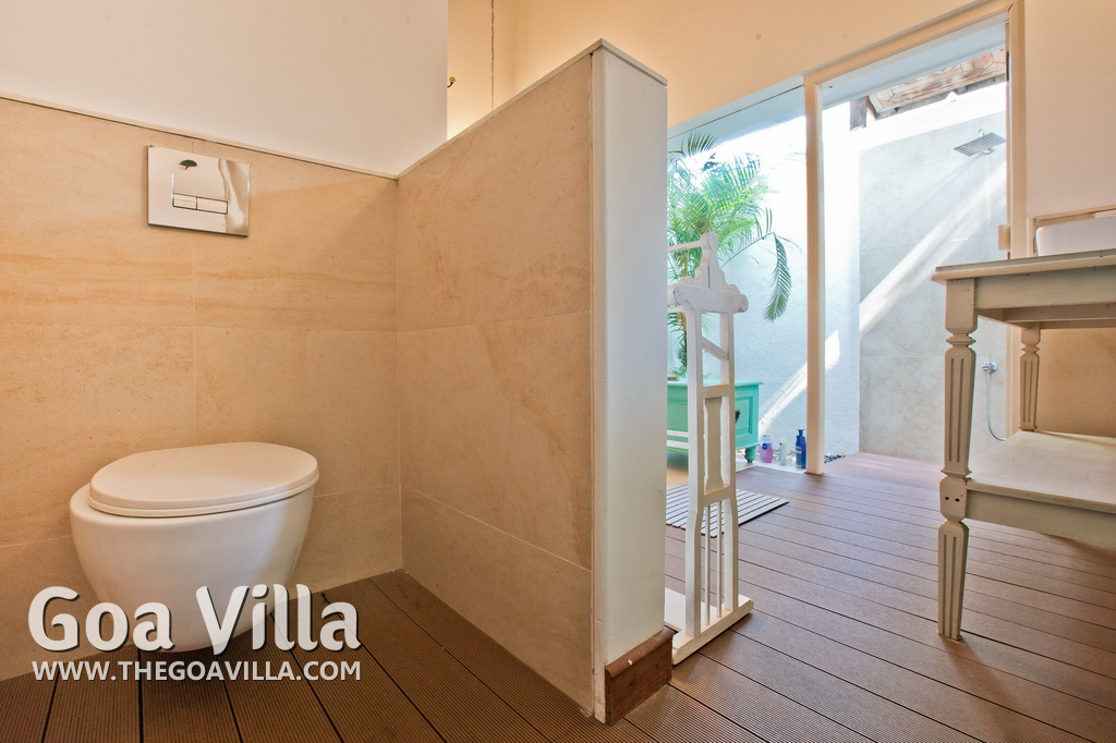 Living Room – The living room at this villa for rent in Anjuna demands a special mention. It faces the swimming pool and is almost completely open. There are comfortable sofas and chairs and decorative lampshades. Vibrant colors. Paintings on the walls and decorative pieces. Large glass windows and doors provide clear outside nature views. This room is also air-conditioned.