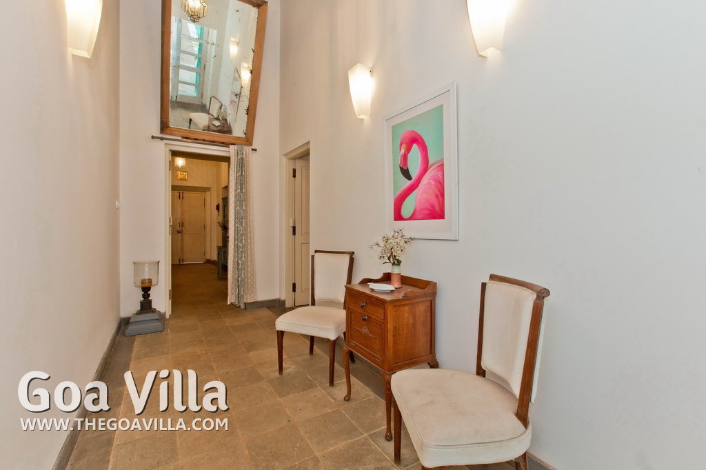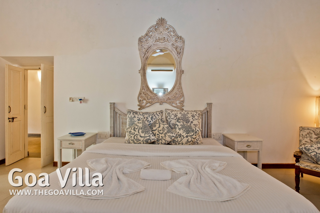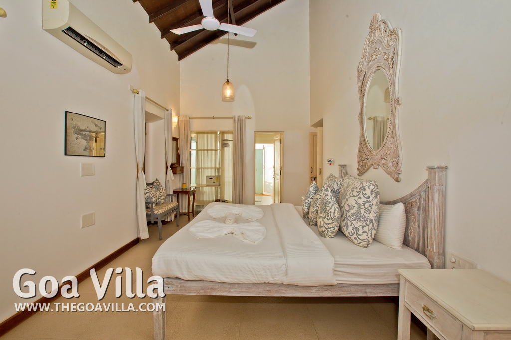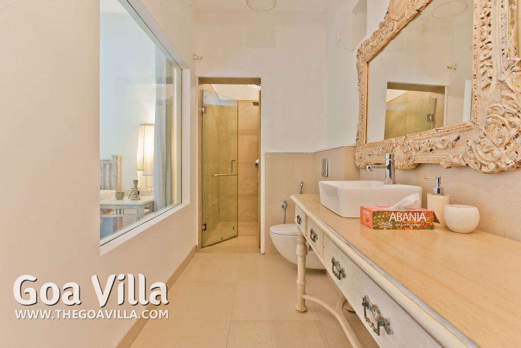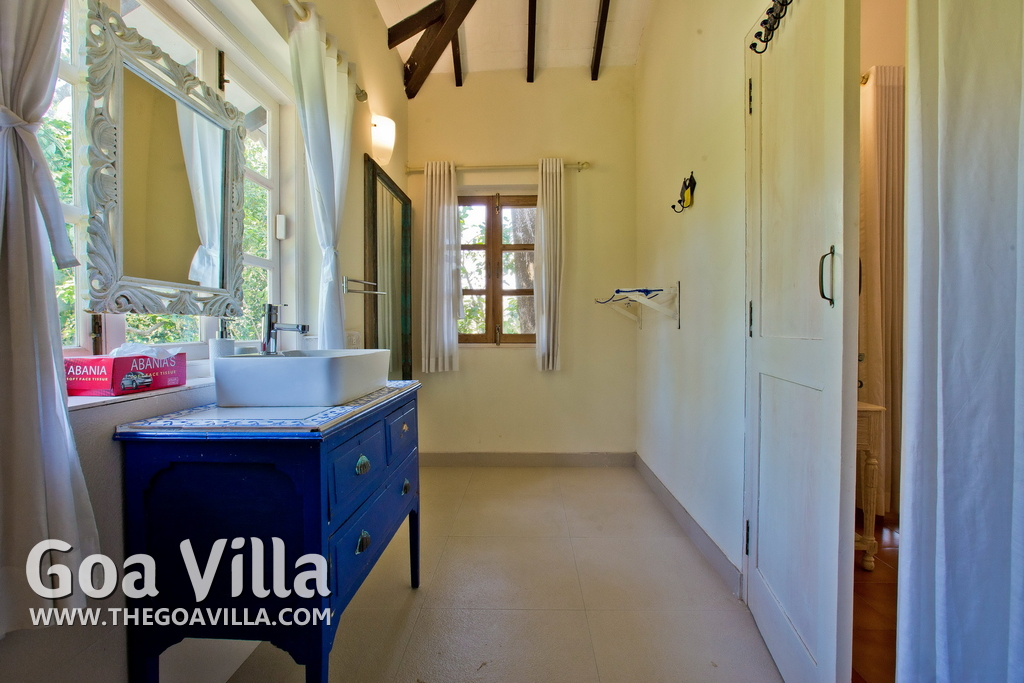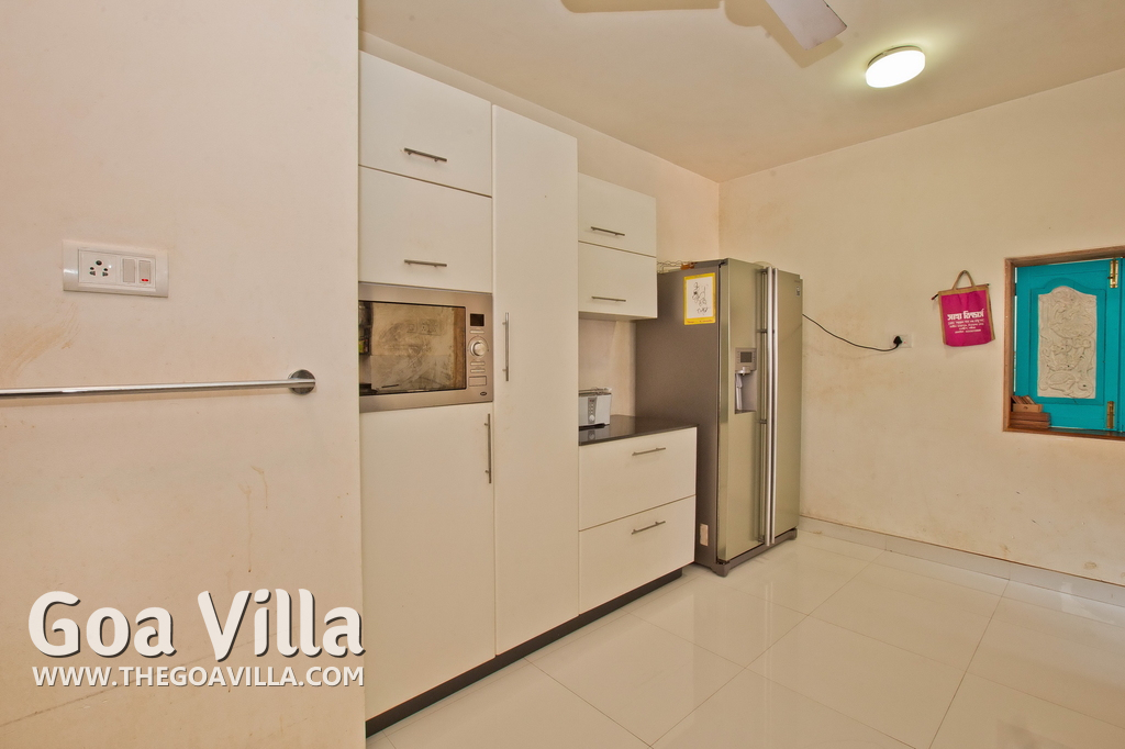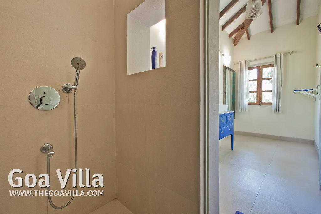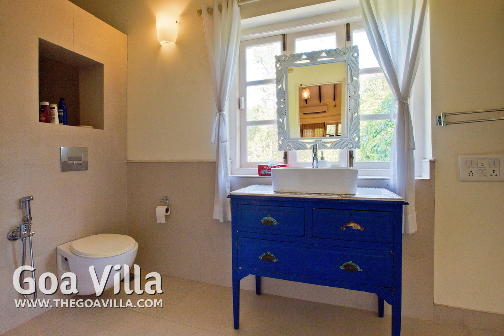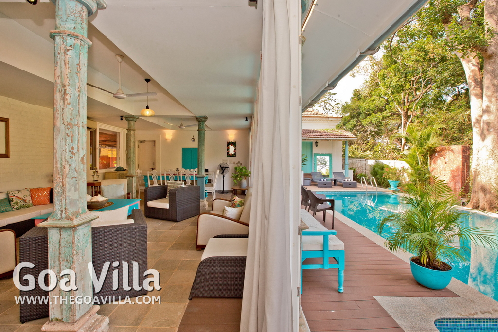 Living Room – The living room at this villa for rent in Anjuna demands a special mention. It faces the swimming pool and is almost completely open. There are comfortable sofas and chairs and decorative lampshades. Vibrant colors. Paintings on the walls and decorative pieces. Large glass windows and doors provide clear outside nature views. This room is also air-conditioned.