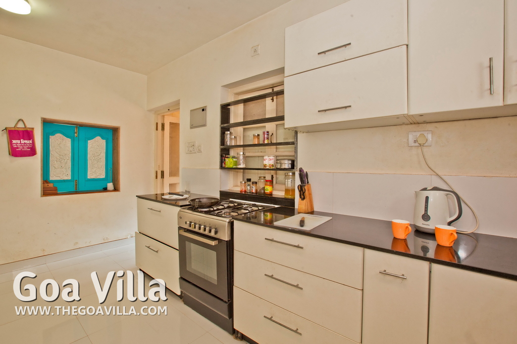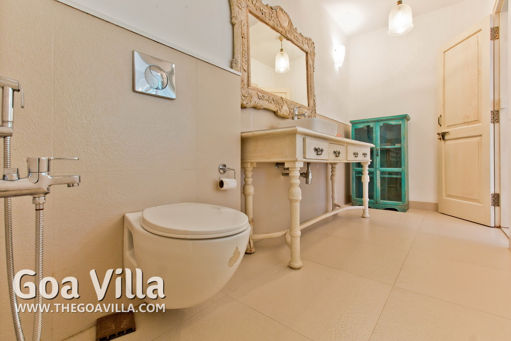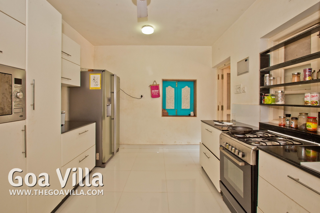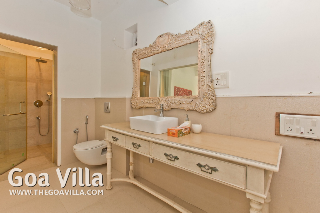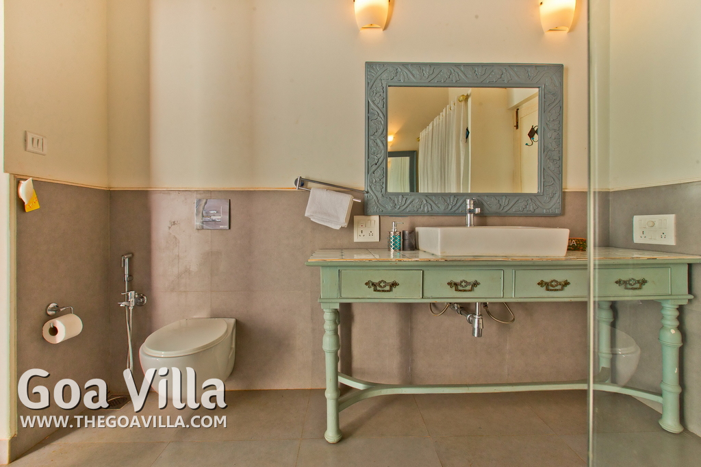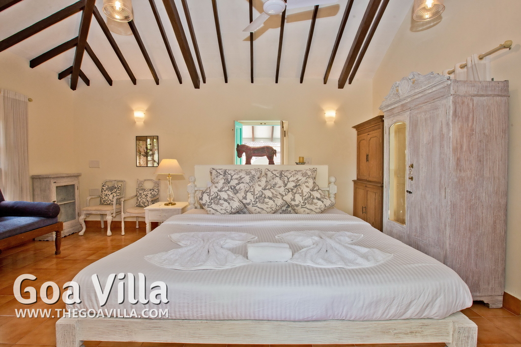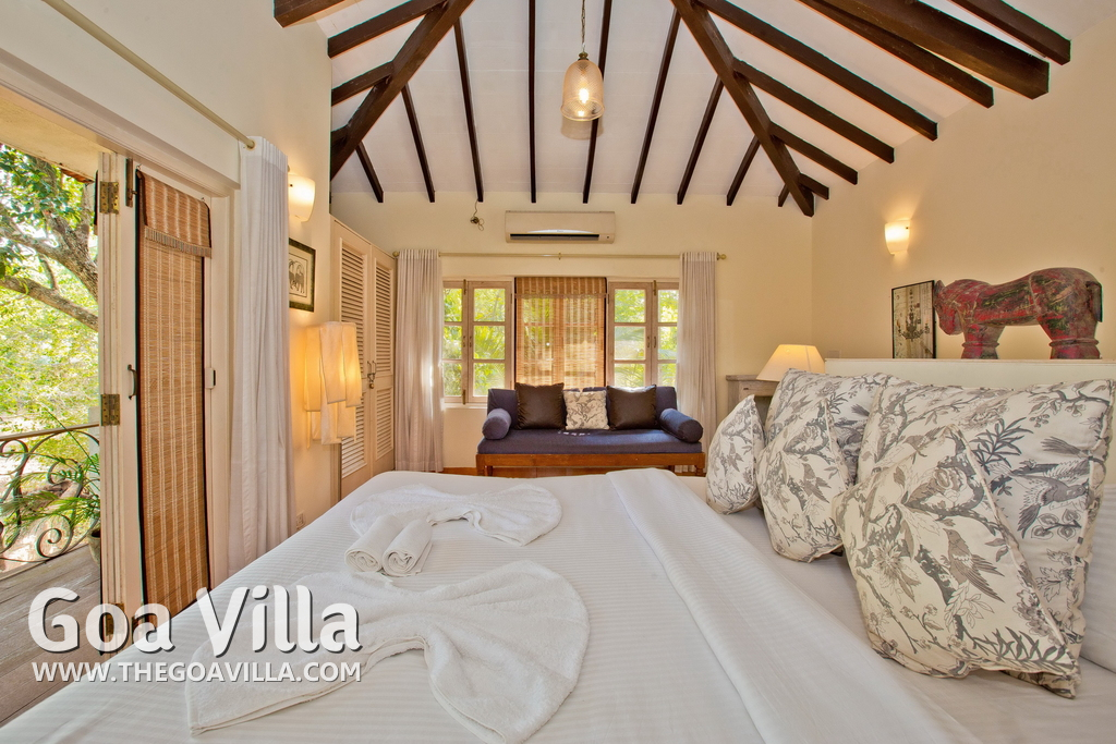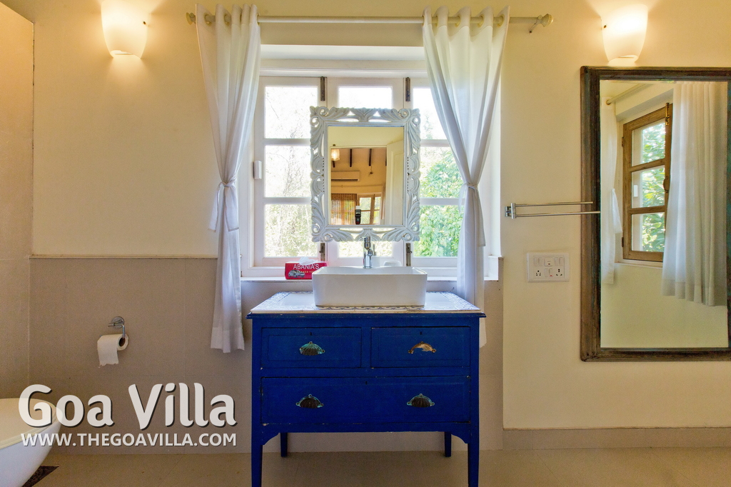 Living Room – The living room at this villa for rent in Anjuna demands a special mention. It faces the swimming pool and is almost completely open. There are comfortable sofas and chairs and decorative lampshades. Vibrant colors. Paintings on the walls and decorative pieces. Large glass windows and doors provide clear outside nature views. This room is also air-conditioned.