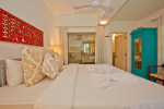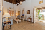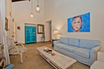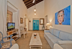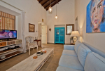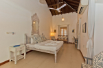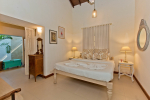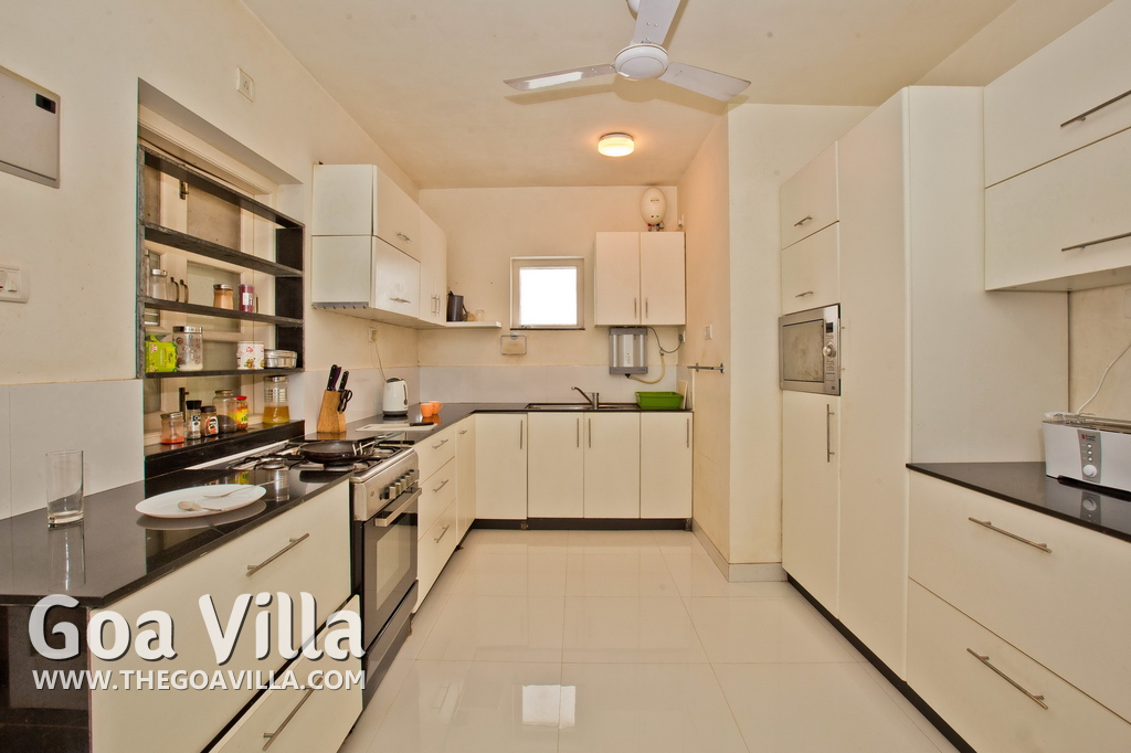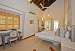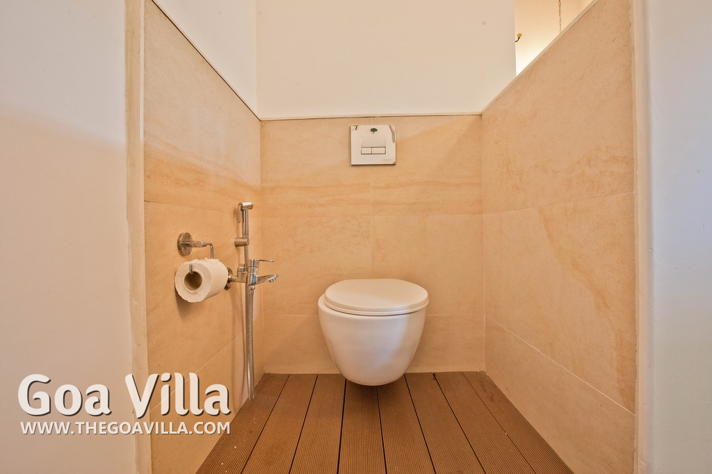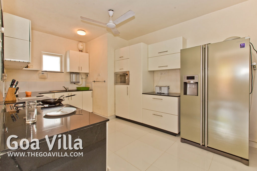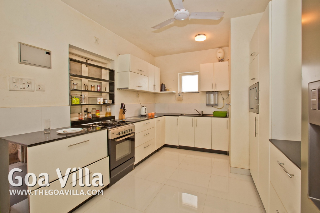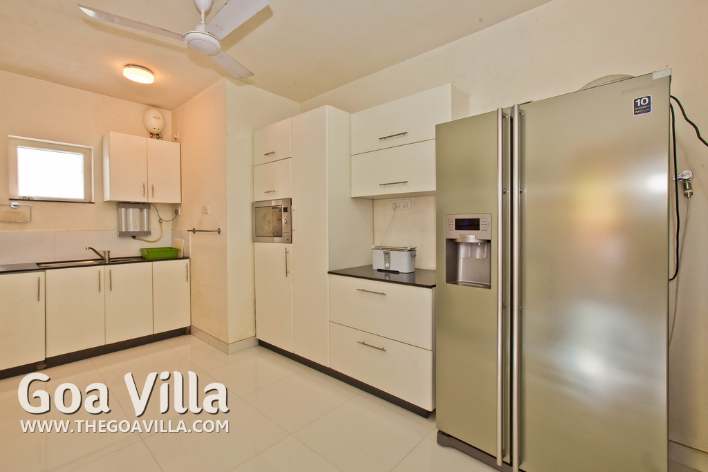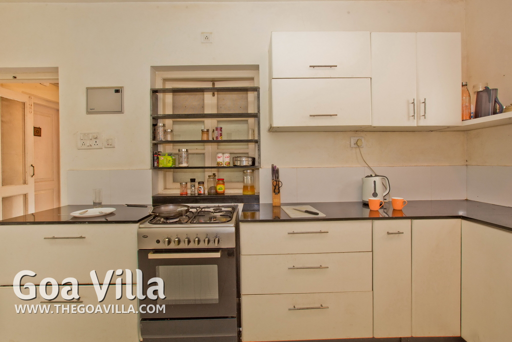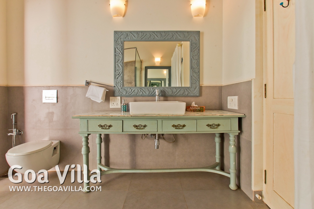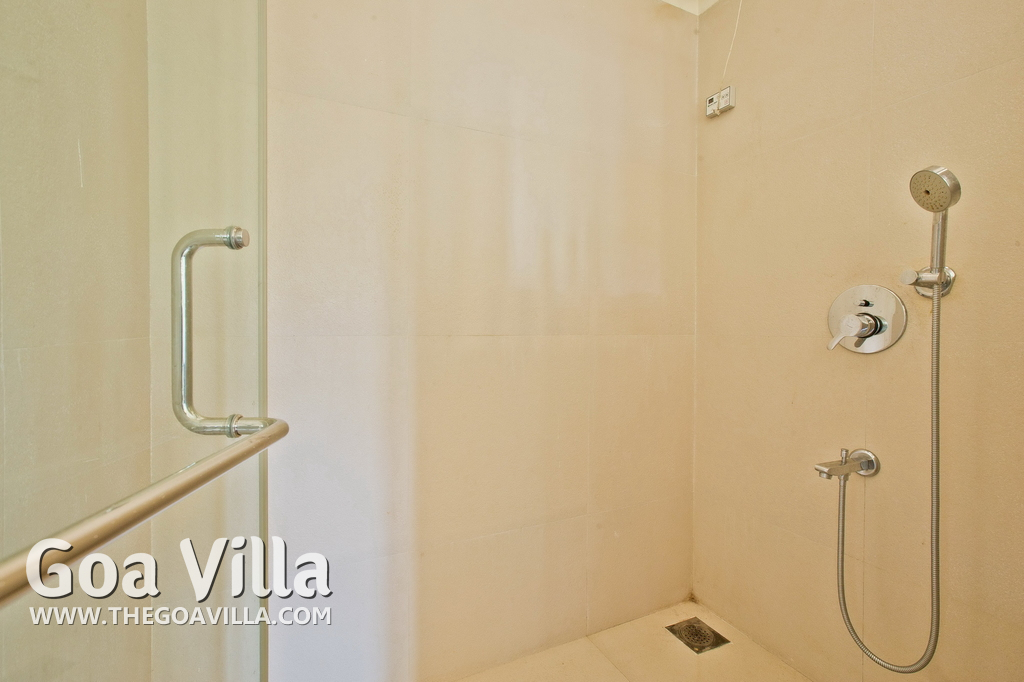 Living Room – The living room at this villa for rent in Anjuna demands a special mention. It faces the swimming pool and is almost completely open. There are comfortable sofas and chairs and decorative lampshades. Vibrant colors. Paintings on the walls and decorative pieces. Large glass windows and doors provide clear outside nature views. This room is also air-conditioned.