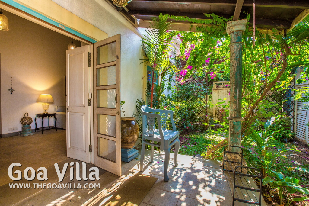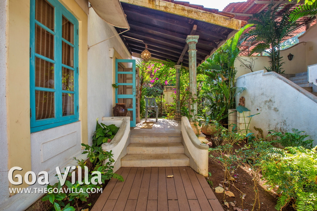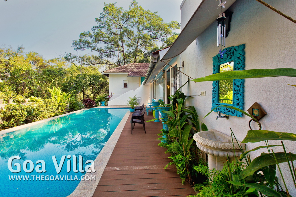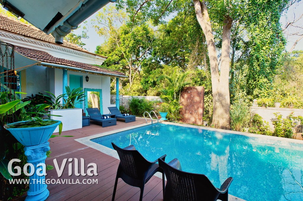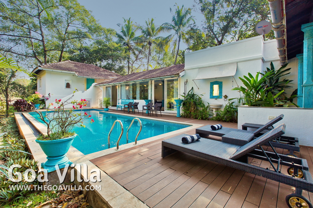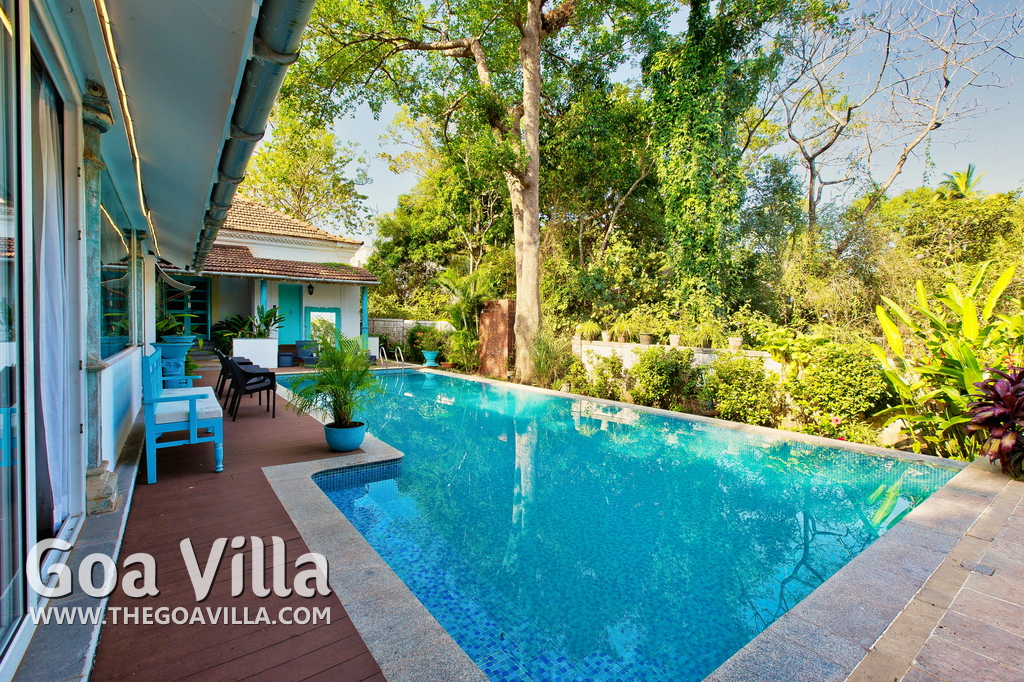 Swimming Pool – This North Goa house has a private swimming pool. Surrounded by lush greenery, this is a perfect place to relax or have fun in the water. Tall trees and potted plants everywhere. Sun beds on the pool deck. There is a shower at one end of the pool. Small tropical garden.