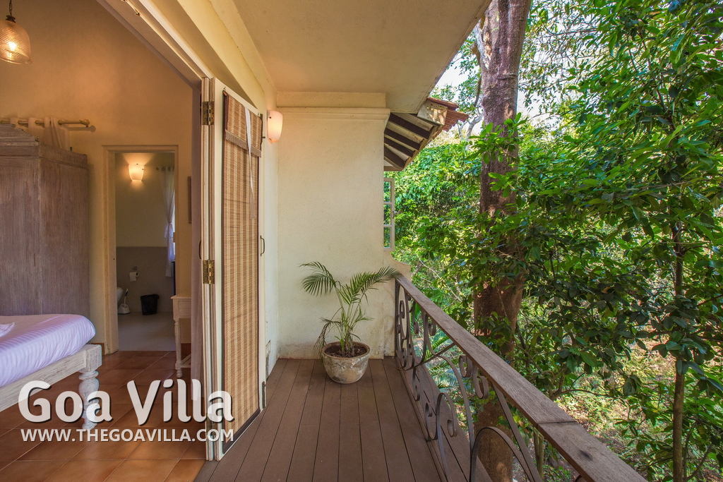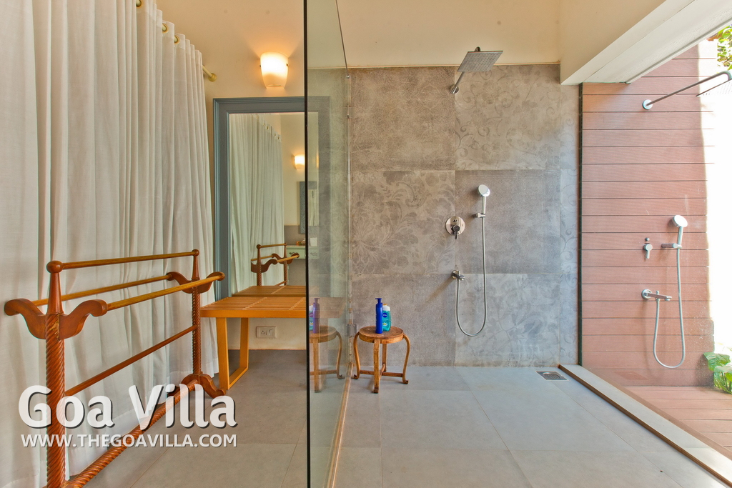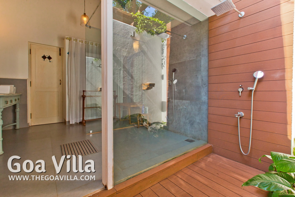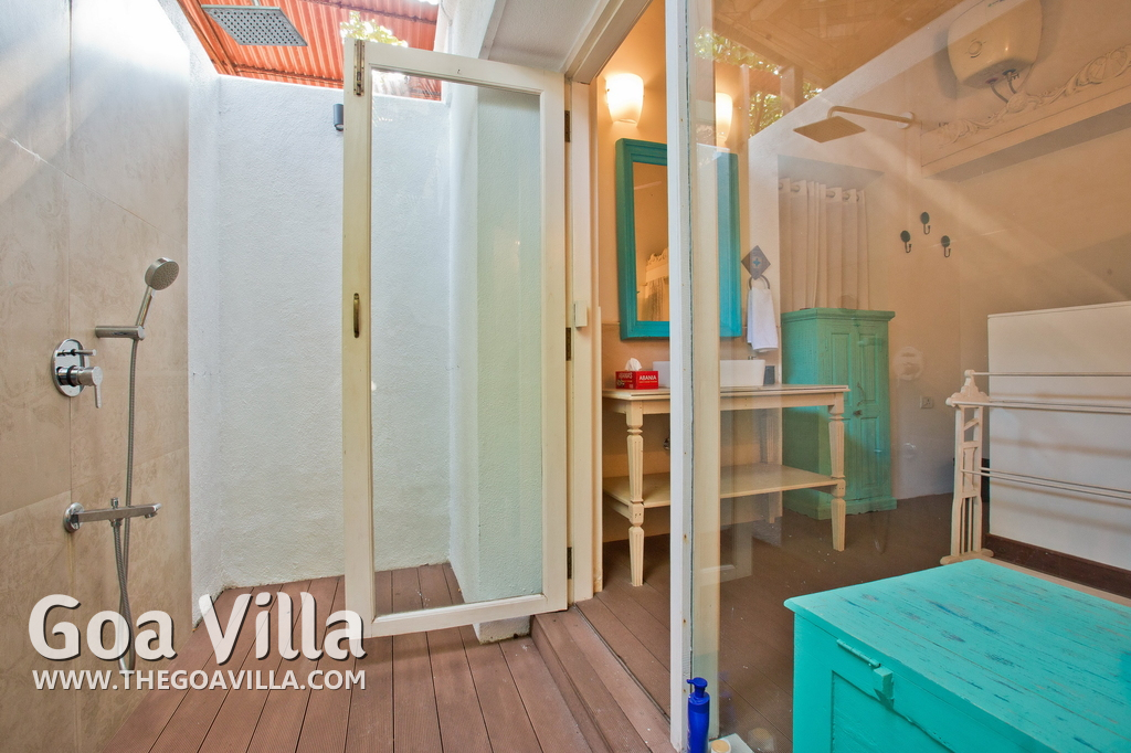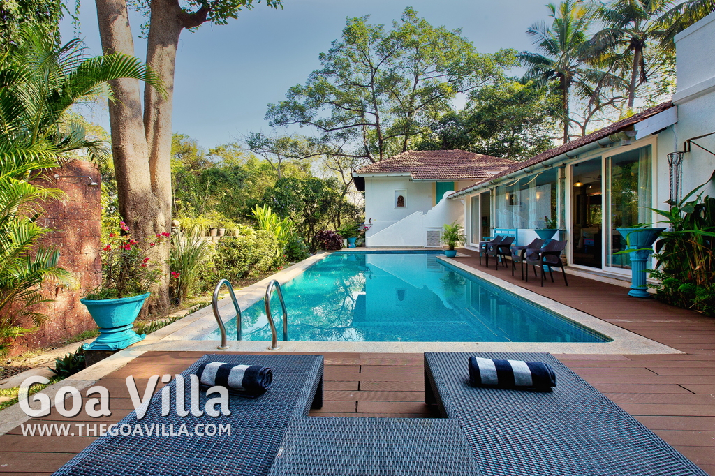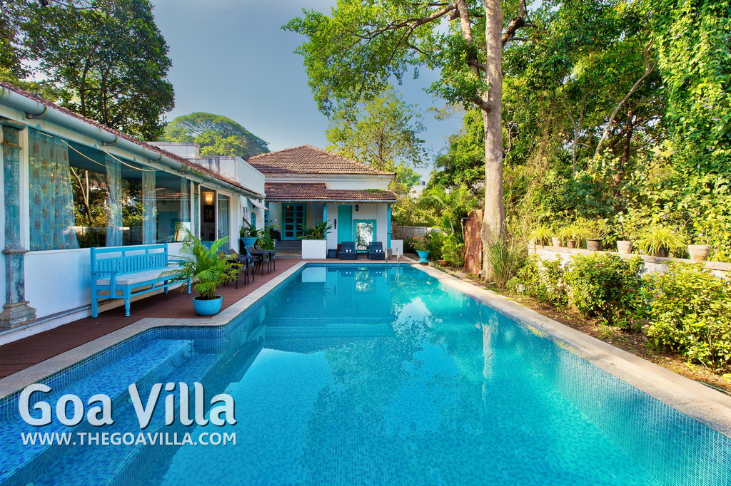 Swimming Pool – This North Goa house has a private swimming pool. Surrounded by lush greenery, this is a perfect place to relax or have fun in the water. Tall trees and potted plants everywhere. Sun beds on the pool deck. There is a shower at one end of the pool. Small tropical garden.