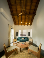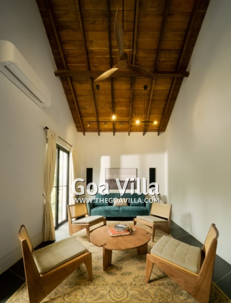 Living Room – The living room has an elegant décor. It is warm and cozy and has a sofa and armchairs for all the guests. There is a sound system for your entertainment. The room also has a high wooden-beamed ceiling, which is a typical feature of Indo-Portuguese architecture. This high ceiling also allows plenty of air and sunlight to flood the space. Of course, the room is also air-conditioned for your comfort.