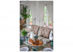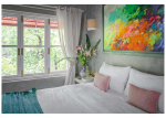 Bedrooms – You can pick from different types of beds in this property, depending on your preferences. All of them are doubles, but two beds are modern, while the other two are antiques. Bedroom #1 has floral wallpaper at the back, which reflects the lush greenery all around. Bedroom #2 has a bright painting and vibrant-colored cushions. Bedroom #4, which is on the ground floor, opens directly to the lawn. The glass doors and windows are so large here that it seems like the garden is a part of the room.