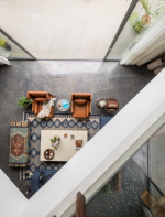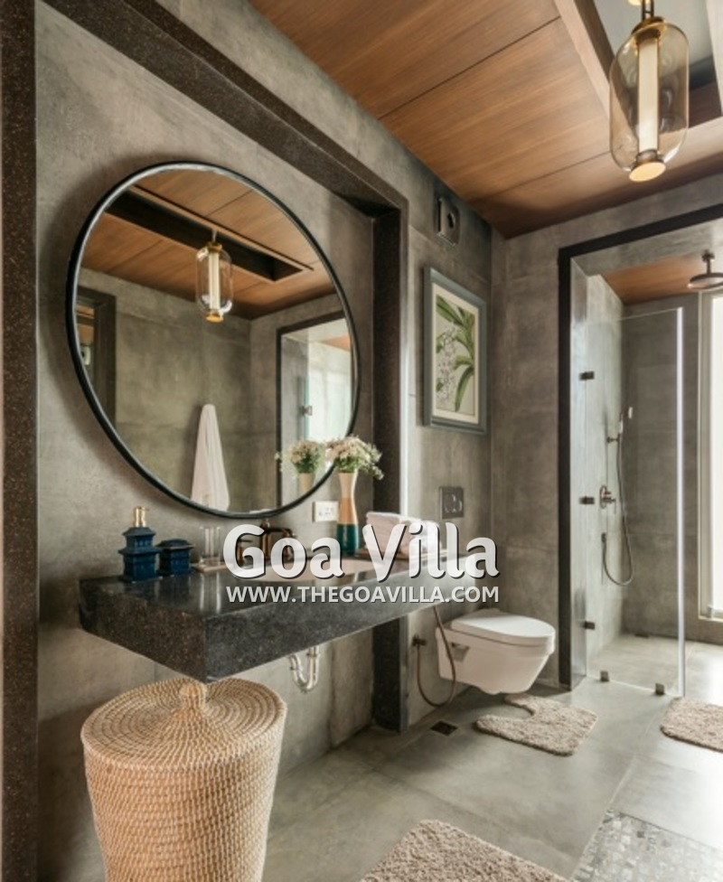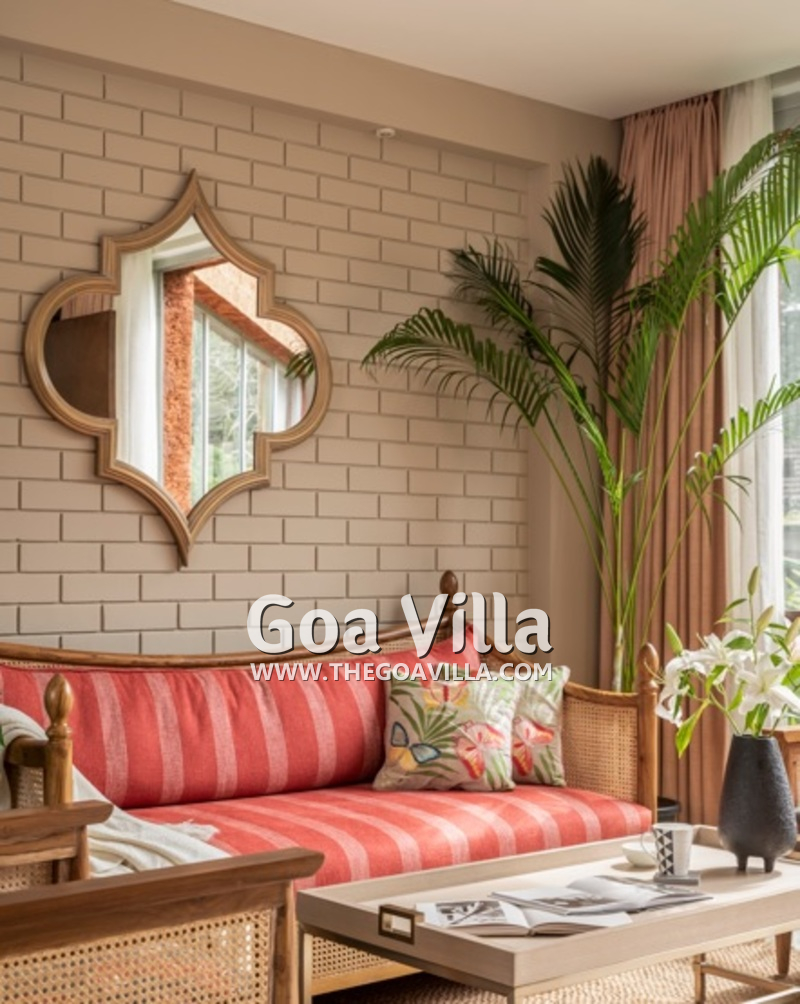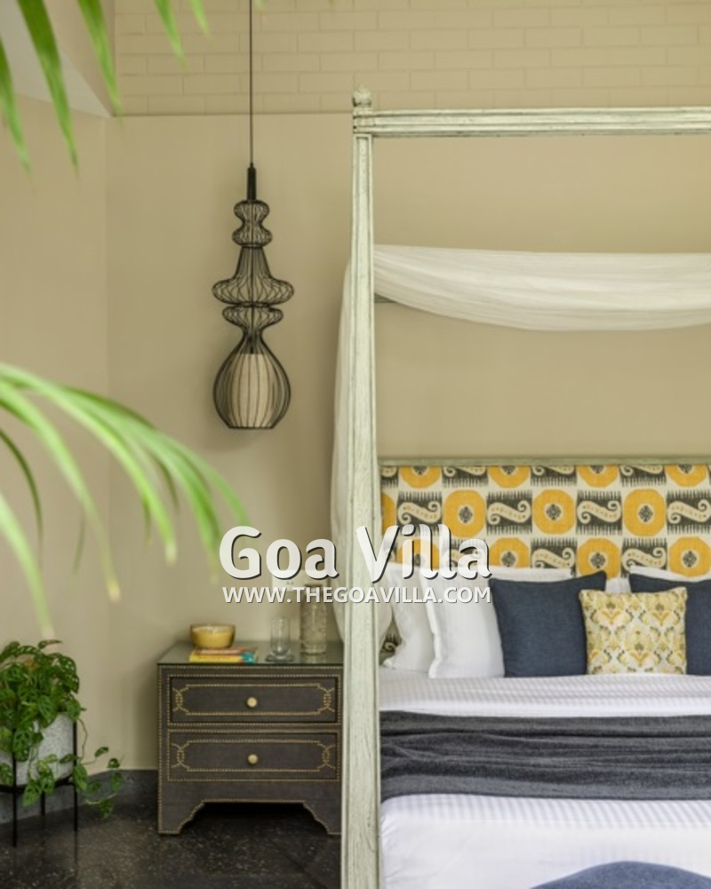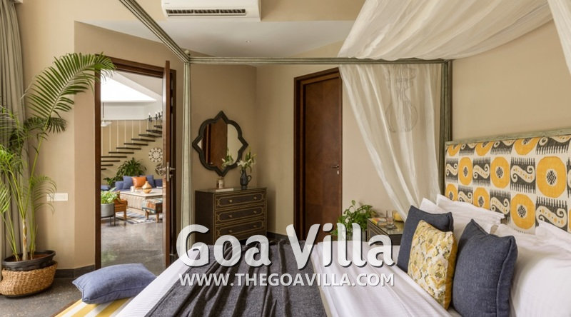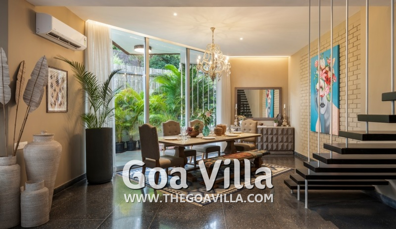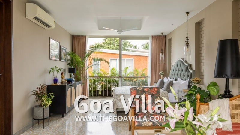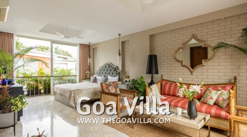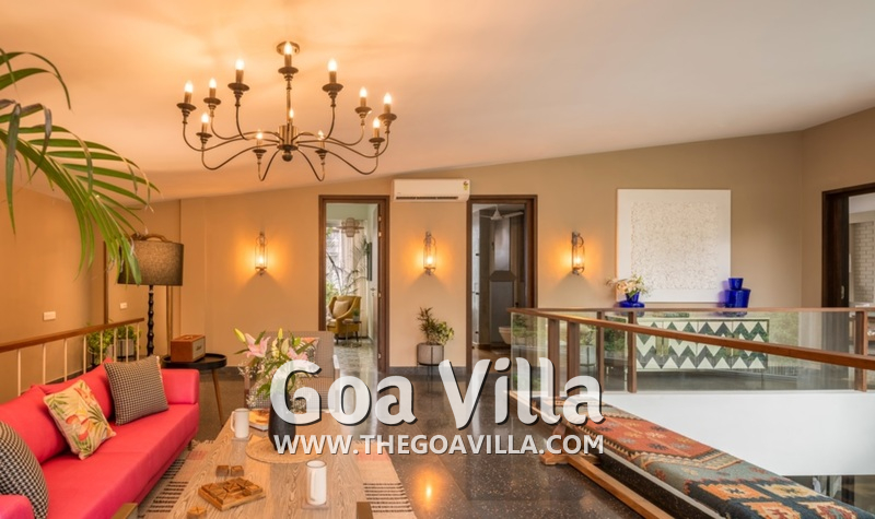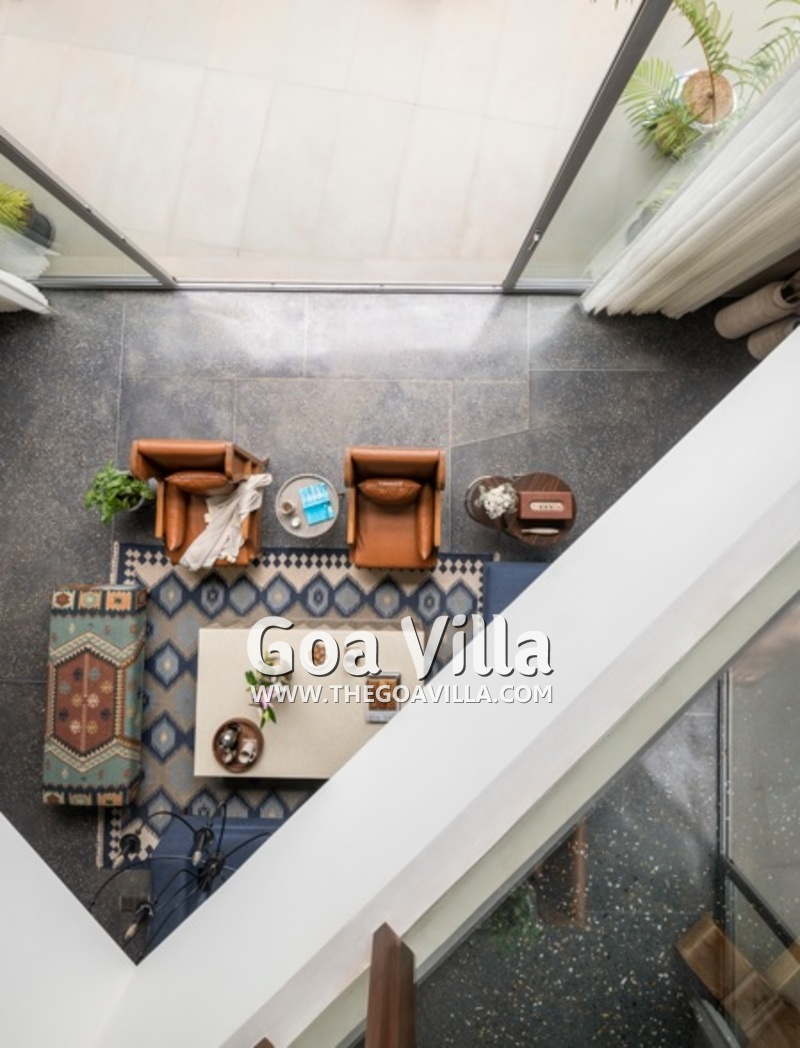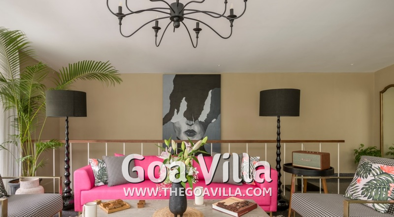 Living Room – You will find several lounging areas spread throughout this villa in North Goa, which ensures that it never feels cramped, even for a larger group. The ground floor has a big room with a huge sofa that can easily sit all six. It faces the pool and garden. Take the open staircase to the upper level and you will find a smaller lounging space on the landing. This too has a comfortable sofa and a modern coffee table. The terrace has the third area, perfect for catching a sunset view.
