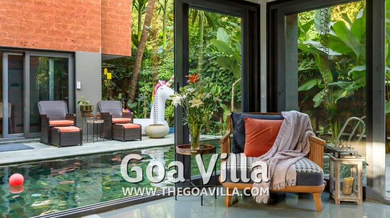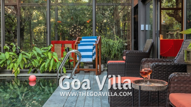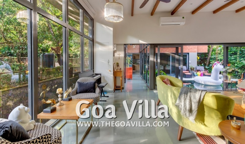 Kick off your shoes and let your guard down! Presenting a unique luxury villa for rent where you can unwind, relax, and flow with the lazy easy-going vibe of Goa. Estillo is a plush and sophisticated holiday villa for rent for guests who want the finest luxury experience in Goa with complete privacy. The house is located in Assagao, away from the crowds. There are three bedrooms in this vast property, so you will get more space per person. All the rooms are air-conditioned. You will have your own private swimming pool, balconies with views, lounging areas with recliners, and a kitchen with modern appliances. Its glass construction blends the interior with the surrounding greenery outside.