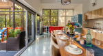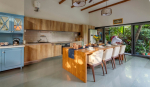 Dining, Kitchen – The house has two rooms on the ground floor, connected by a glass corridor. The living room is in one corner and the dining room on the other. This is an open-concept dining area with the kitchen a part of it. The table seats all the guests. The kitchen has many appliances. For your convenience, the villa owner has provided many pots, pans, tableware, and glassware.