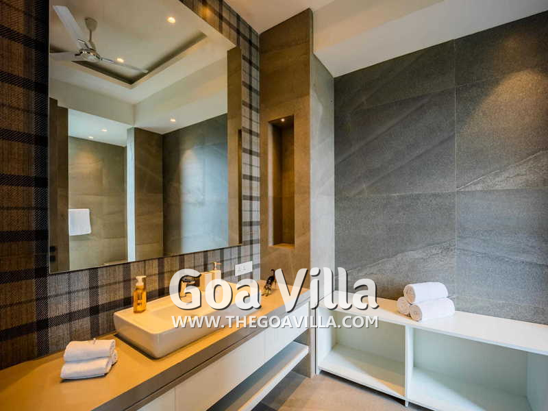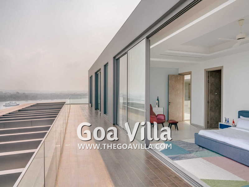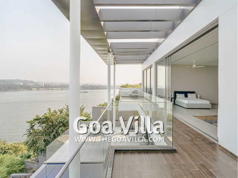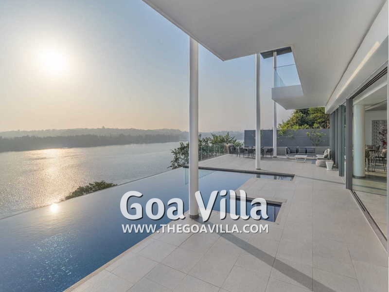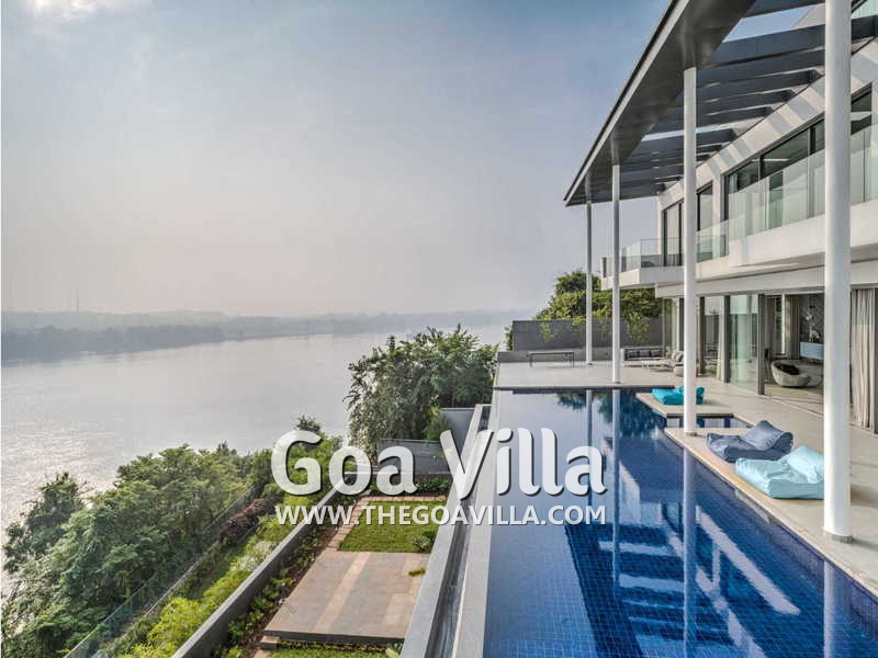 Swimming Pool – There is a fabulous private infinity pool just outside the living room. This too faces the Mandovi River. In front of your villa, there is a pier where boats come to dock. You can see them coming and going. You can also see many ferries and casino ships. The pool is surrounded by a deck that has an outdoor lounging area. Below the pool, you will find a terraced garden and a grassy lawn. And on the lowest level, there are many coconut palms that fringe the riverside.